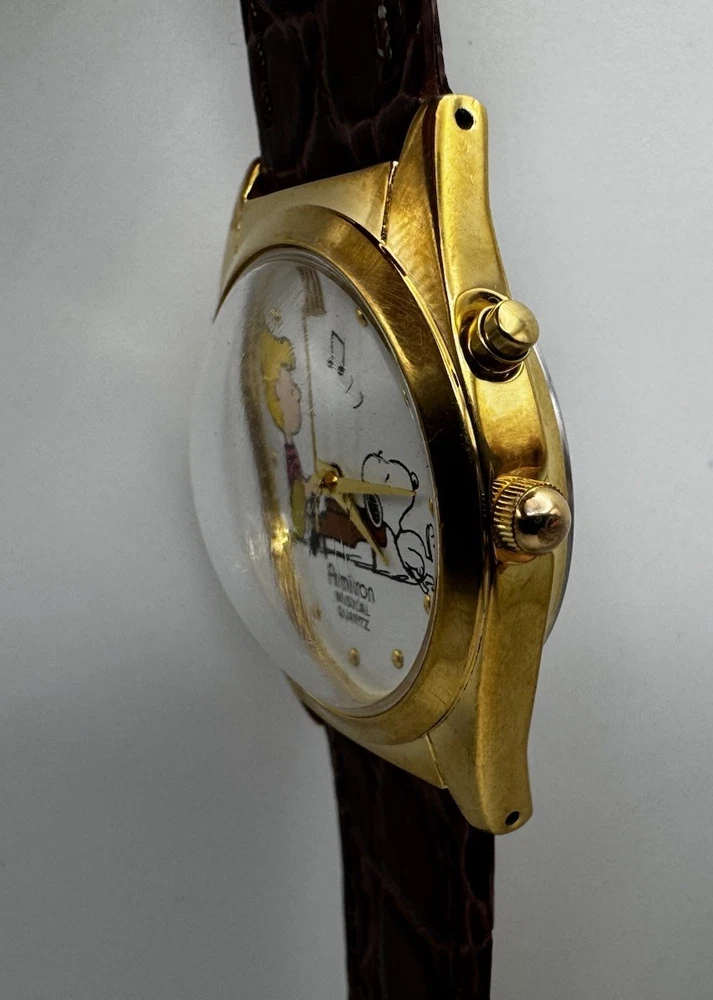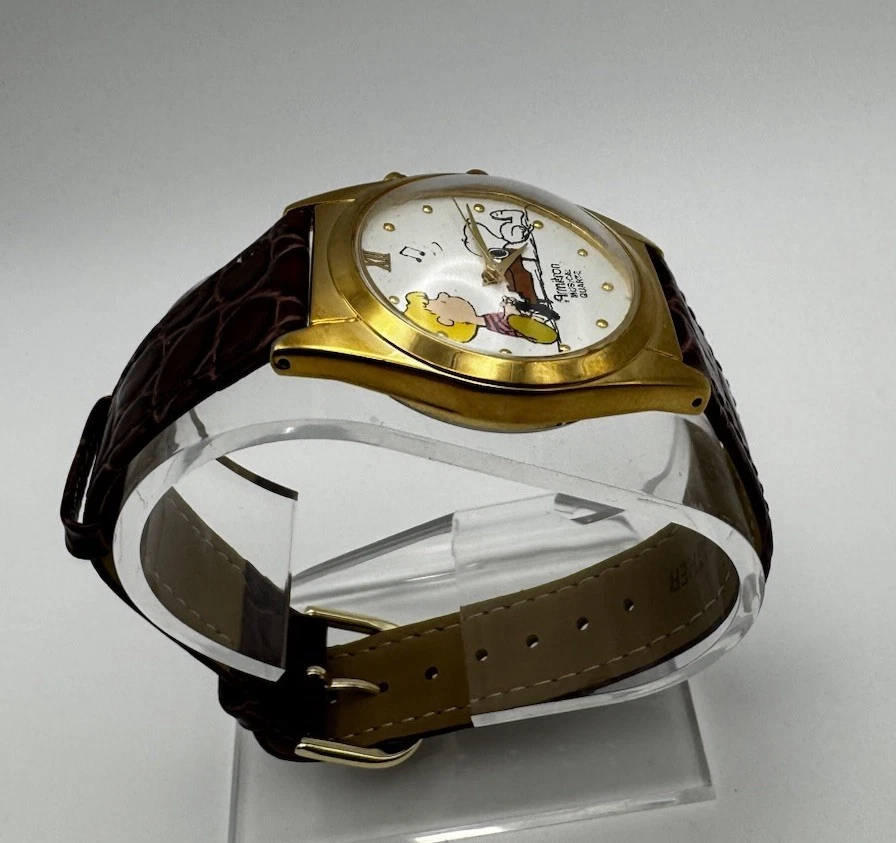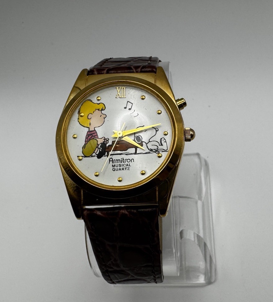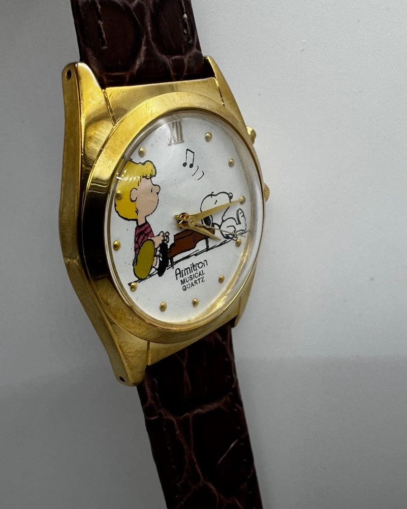 Charming vintage Armitron Musical Quartz watch featuring Snoopy resting atop Schroeder’s piano. Gold‑tone case, crisp dial, and smooth operation. A delightful collectible for Peanuts fans and character‑watch lovers.