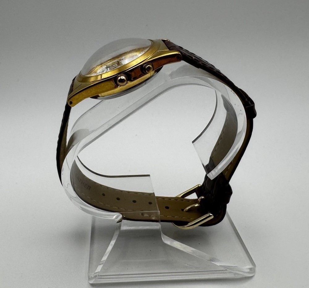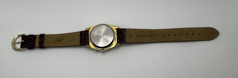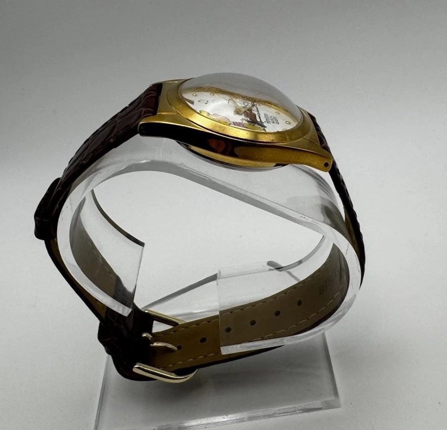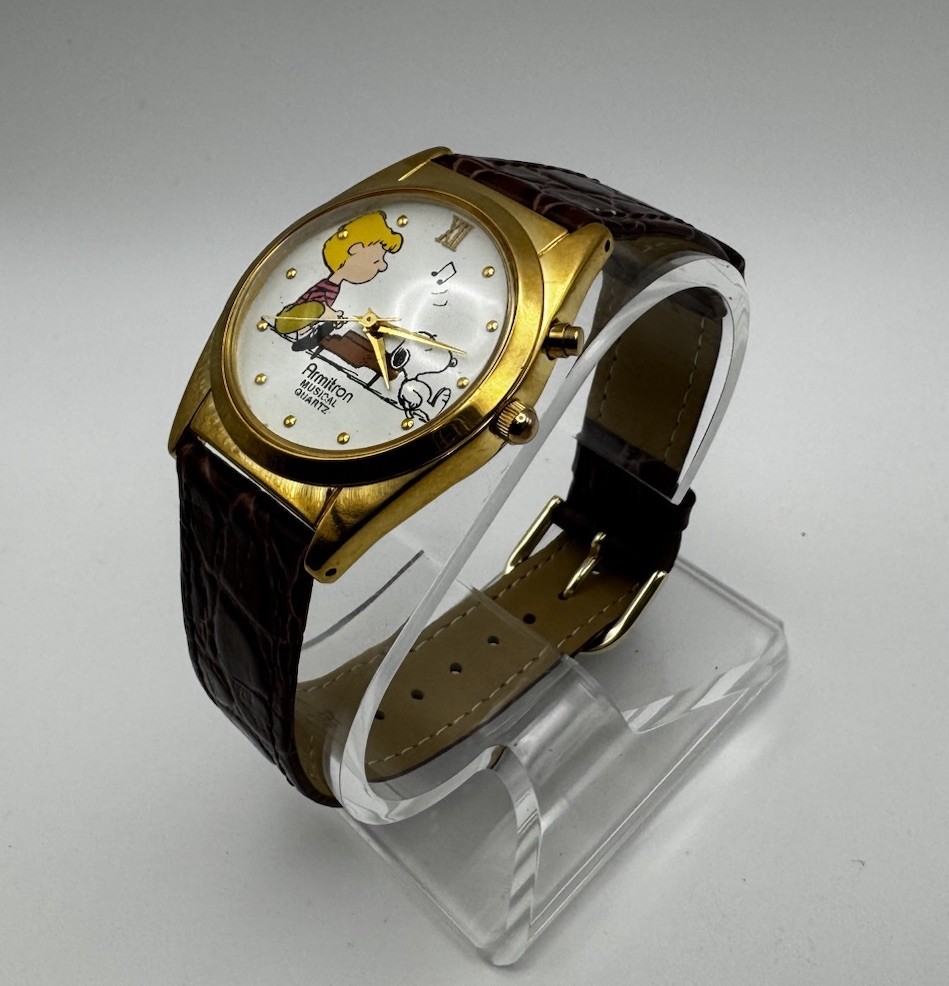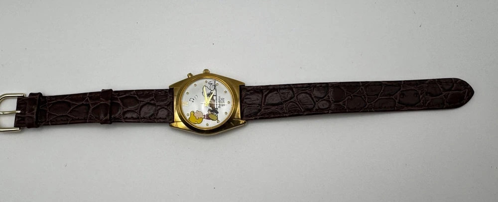 Charming vintage Armitron Musical Quartz watch featuring Snoopy resting atop Schroeder’s piano. Gold‑tone case, crisp dial, and smooth operation. A delightful collectible for Peanuts fans and character‑watch lovers.