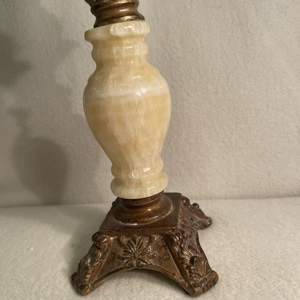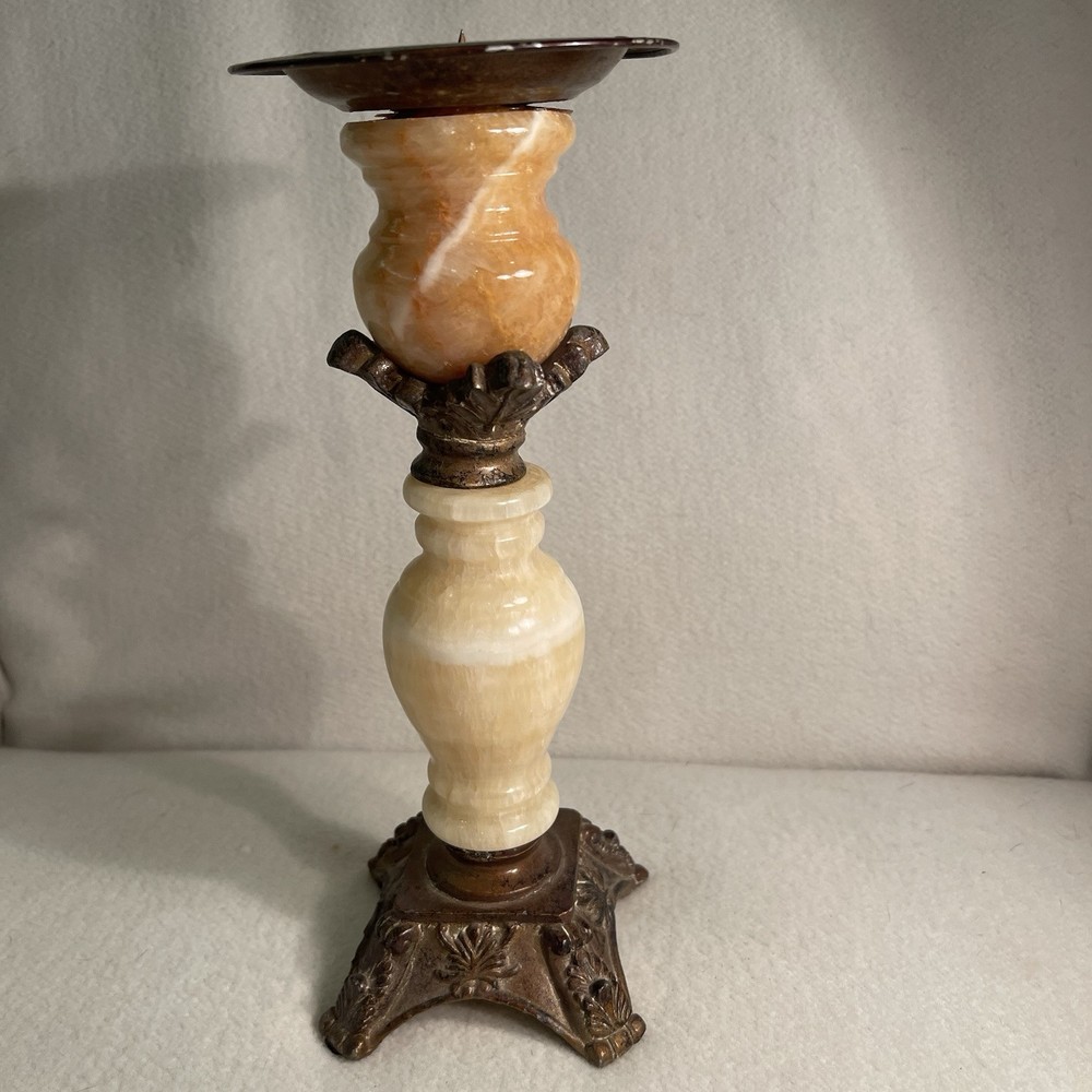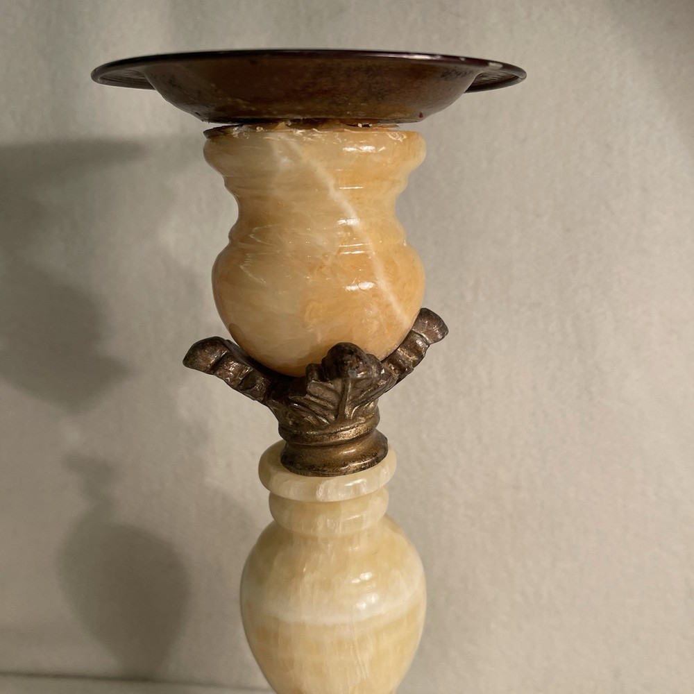 Elevate your space with a touch of vintage elegance. This Art Deco style candle holder marries the warmth of alabaster with a metallic finish, offering a sophisticated accent for any room. The round, beige marble pattern exudes a timeless appeal, while the sturdy metal base and top ensure stability and durability. Crafted in the 1960s, this authentic piece is ideal for pillar candles, enhancing the ambiance of special occasions or everyday decor. Measuring at 9 5/8" in height with a top diameter of 3.75" and a base diameter of 4.5", it weighs in at a substantial 1.2 lbs, making it a substantial addition to your collection. Excellent condition. There are a few tiny paint chips on the top rim. See photos.