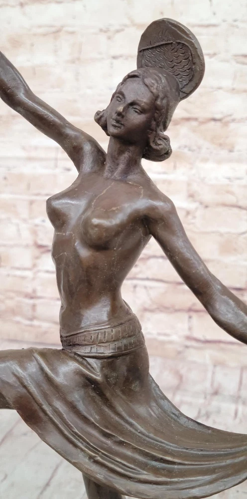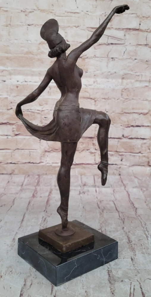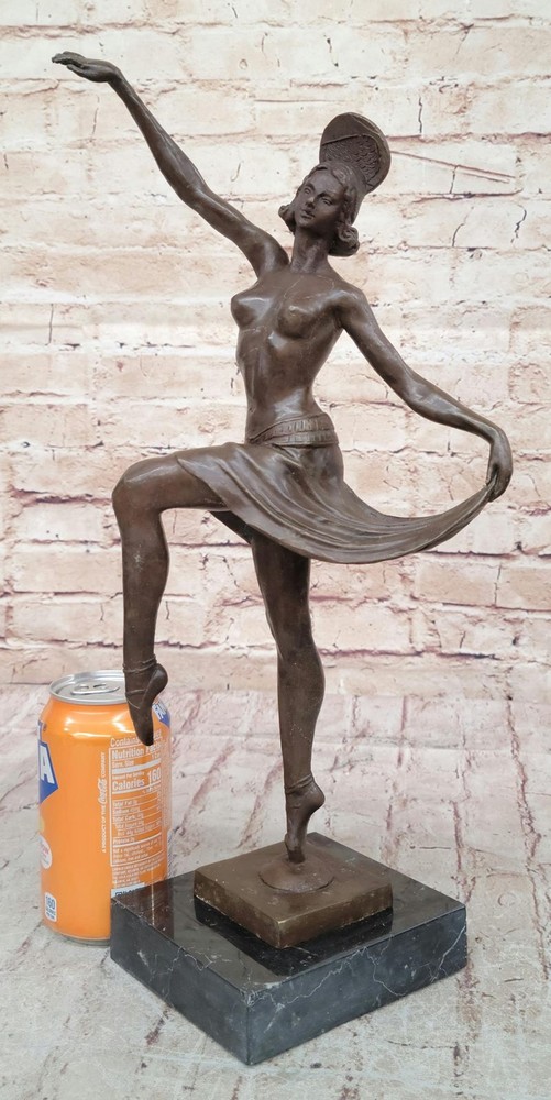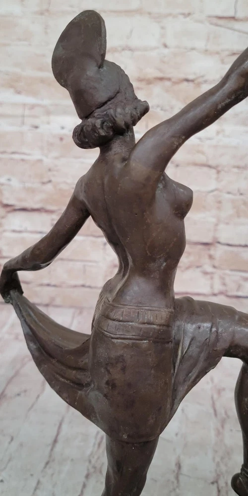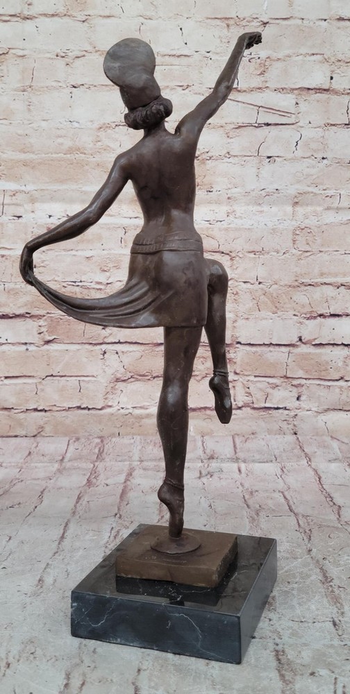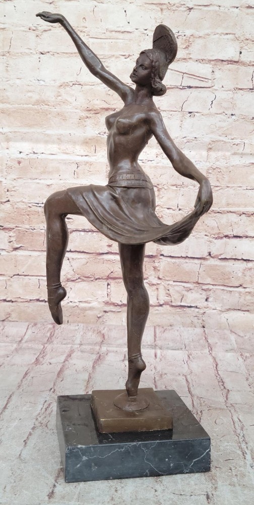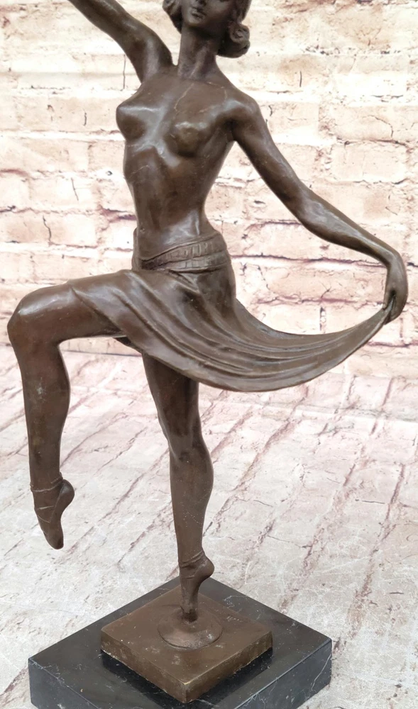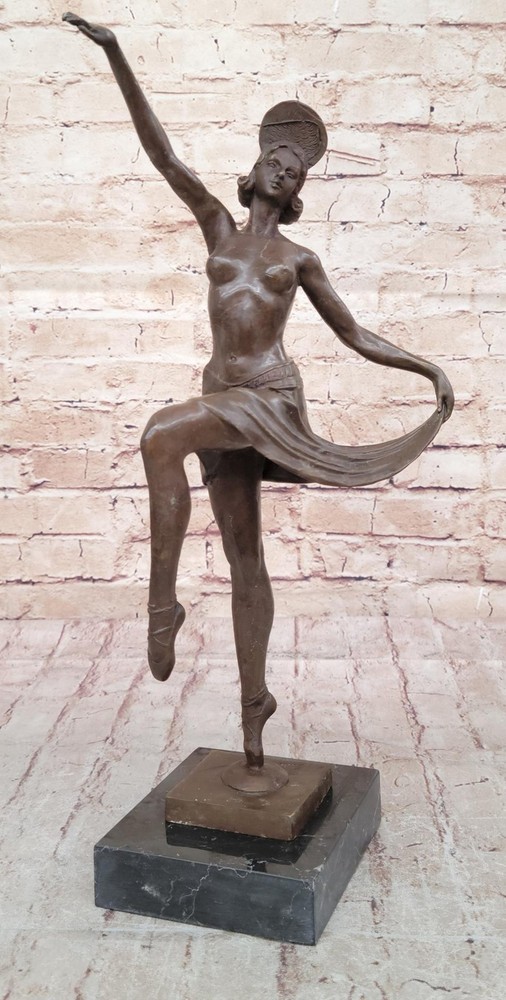 Condition : This sculpture is in perfect condition. Bronze Dimensions with Marble Base: Height 16" X Width 10" Marble Dimensions:5" X 5" Height without base:15" Weight:8 LBS Inventory:37XNCH1928C7573 This stunning early 20th-century French reproduction bronze sculpture by Henri (Enrique) Molins-Balleste (1893-1958) beautifully captures the essence of the Art Deco era. Depicting an iconic dancer in motion, with one leg kicked upward and arms gracefully extended, the sculpture exudes elegance and dynamism. Despite wearing only an undergarment, the dancer's movement radiates grace and sophistication, showcasing Molins-Balleste's mastery in capturing the spirit of the era. The sculpture's meticulous attention to detail is evident in the fine facial features and subtle muscular definition of the dancer's body, including her stomach, knees, back, and spine. Her bobbed hairdo, reminiscent of the Flapper style synonymous with the Roaring Twenties, adds a touch of authenticity and charm to the piece. Patinated with a handsome brown color and mounted on a tiered square base crafted from black marble, the sculpture exudes luxury and refinement. Signed by the artist on the base, it stands as a testament to Molins-Balleste's talent and craftsmanship, capturing the beauty and dynamism of the Art Deco era in exquisite detail. VINTAGE ART DECO DANCER BALLERINA BRONZE FIGURE SCULPTURE SIGNED HOME DECO XNCH-1928C Video will open in a new window Using the eBay App? Paste link into a browser window: [isdntekvideo]