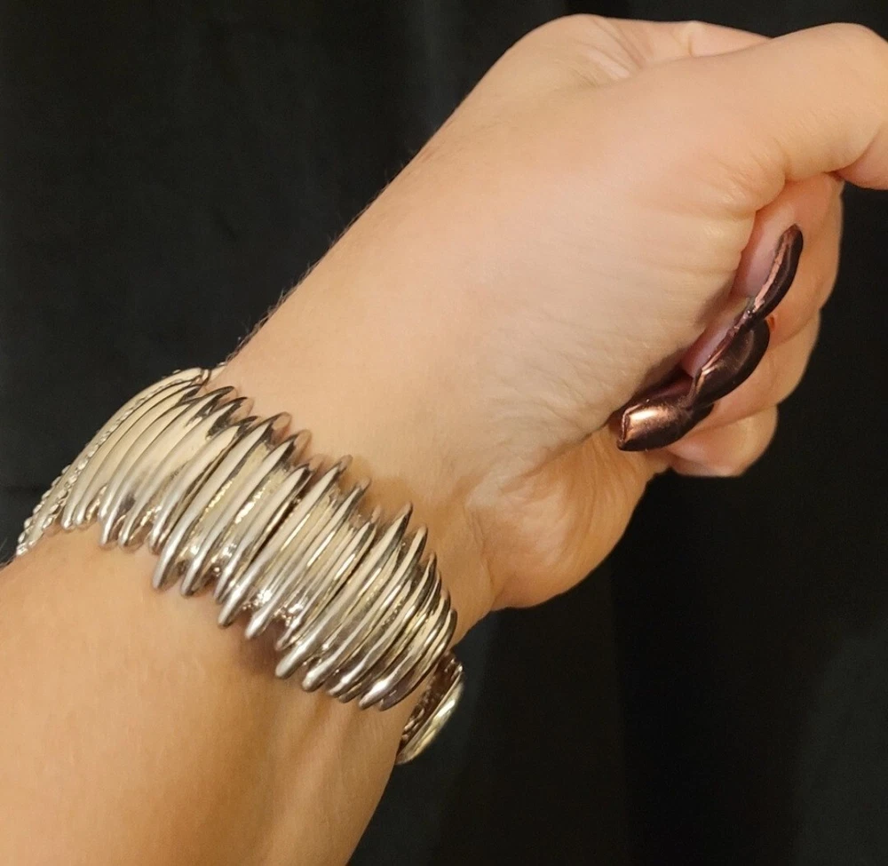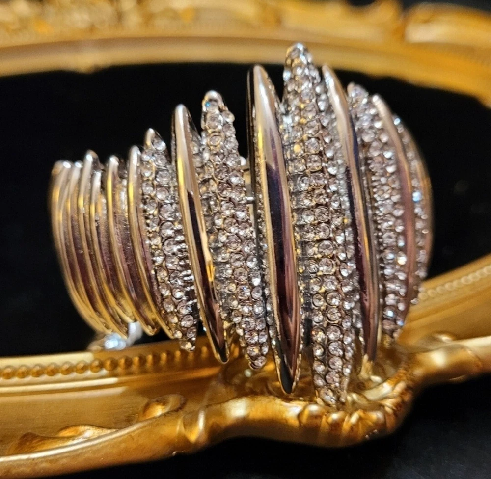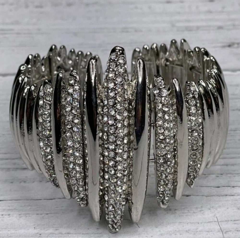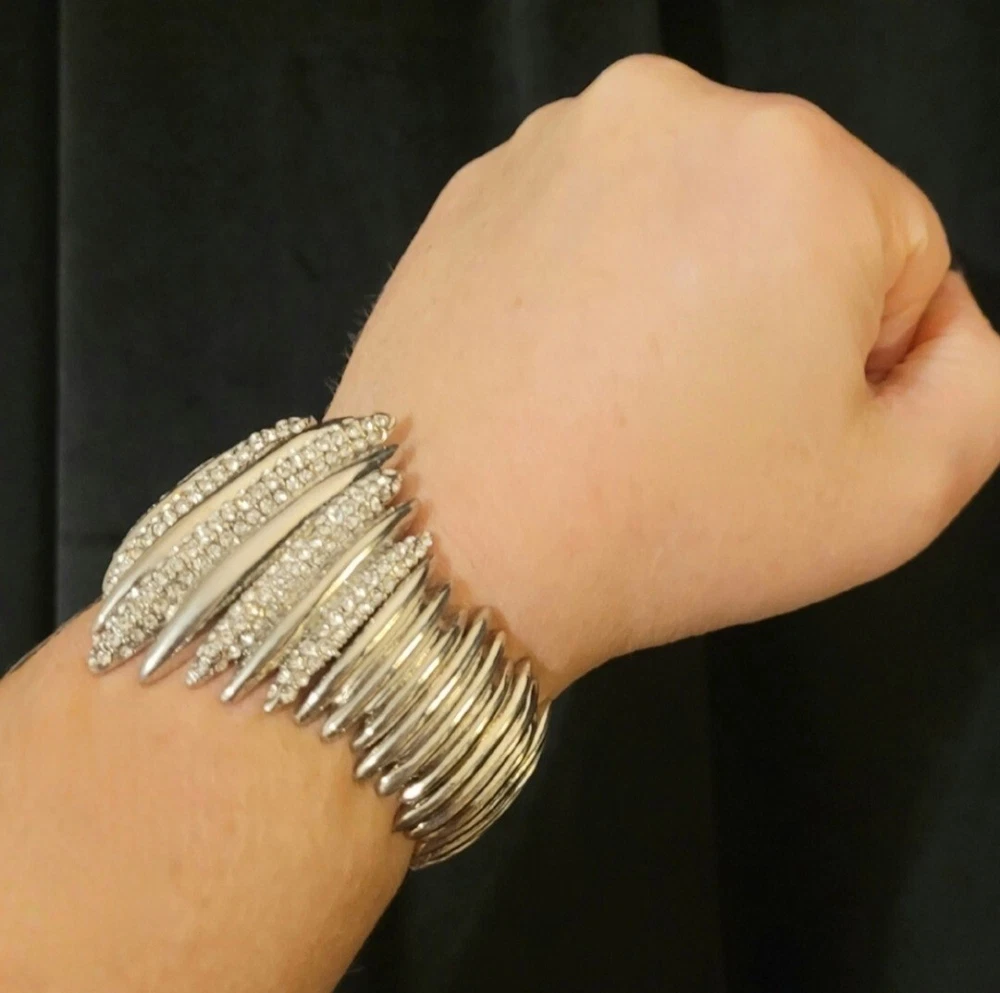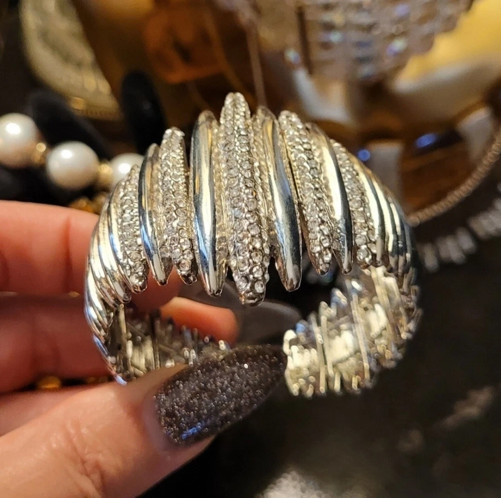 This vintage Art Deco cuff bracelet exudes glamour and sophistication. The fierce white crystal centerpiece adds a touch of elegance to any outfit, making it perfect for special occasions such as birthdays or Christmas. The round, colorless crystal is complemented by the shimmering silver metal, making this bracelet a must-have for any vintage jewelry collector. The cuff style adds a modern twist to this classic piece, making it suitable for any wrist size. This bracelet is perfect for those who appreciate the beauty and craftsmanship of vintage jewelry. 2" Wide Adjustable Silver tone base metal / crystal