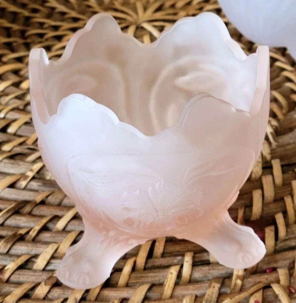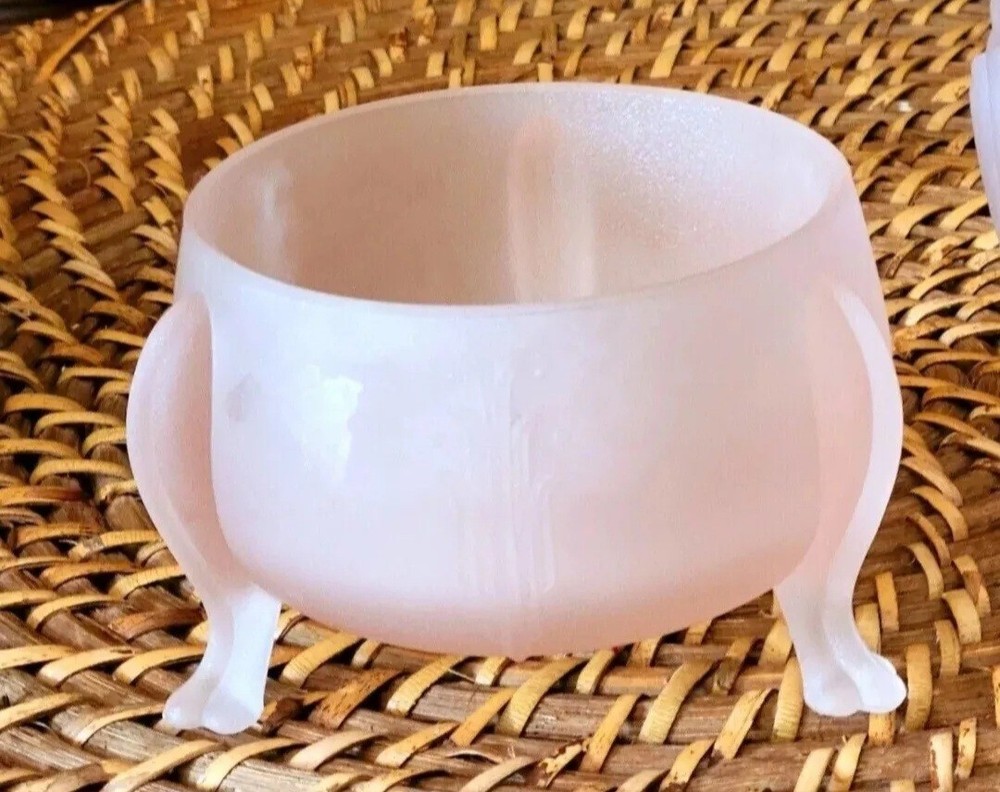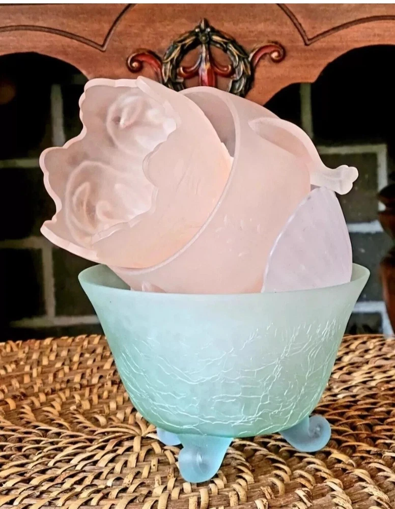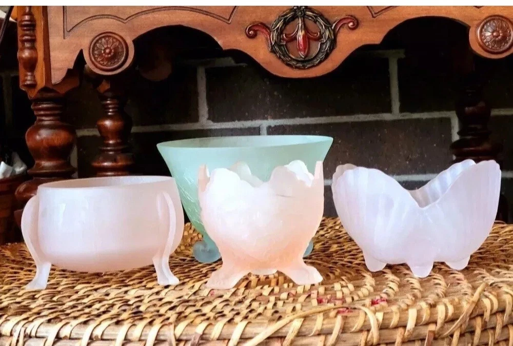 This is a set of four vintage Art Deco frosted glass candy dishes. The bowls feature a multicolor design and are made of glass in an art deco style. They are perfect for serving candies or small snacks in a decorative way.