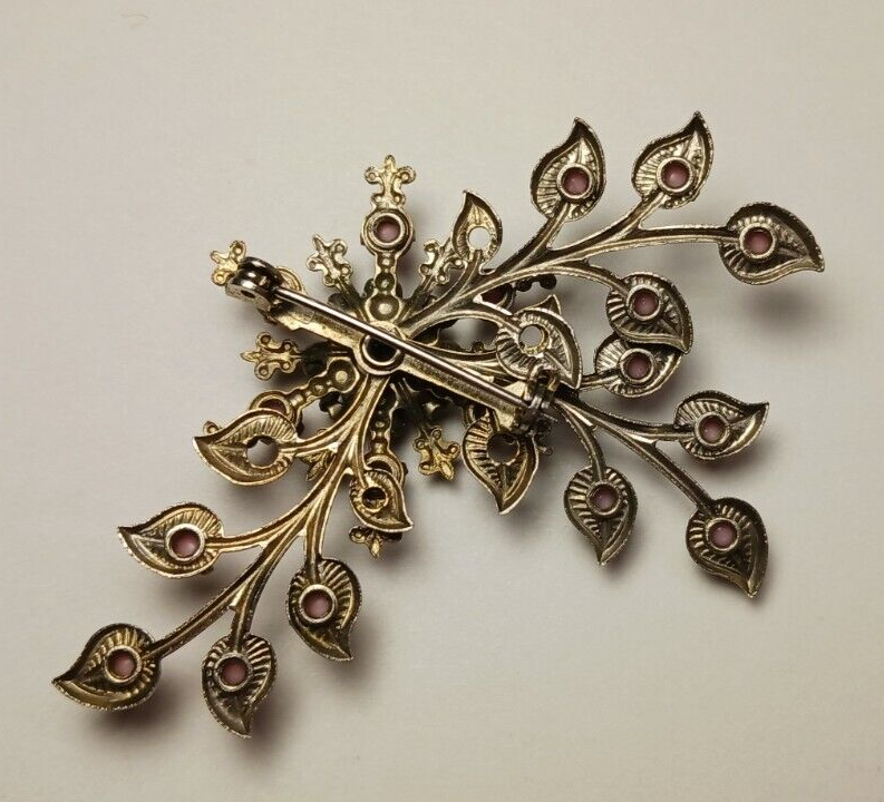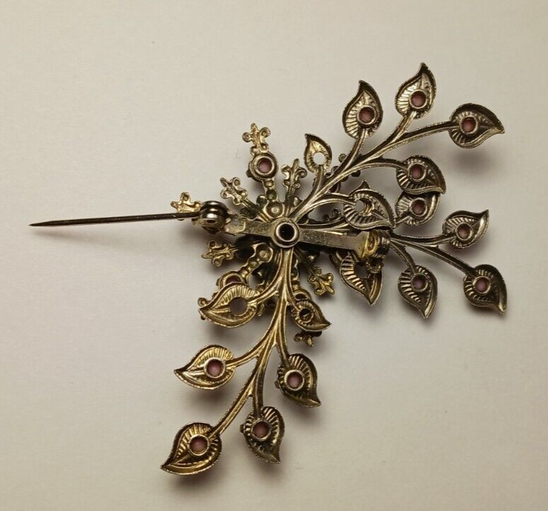 No maker's mark, weighs 1/4 oz. Rhinestone is 1/4", faux pearls are 1/8". Metal darkened from age.