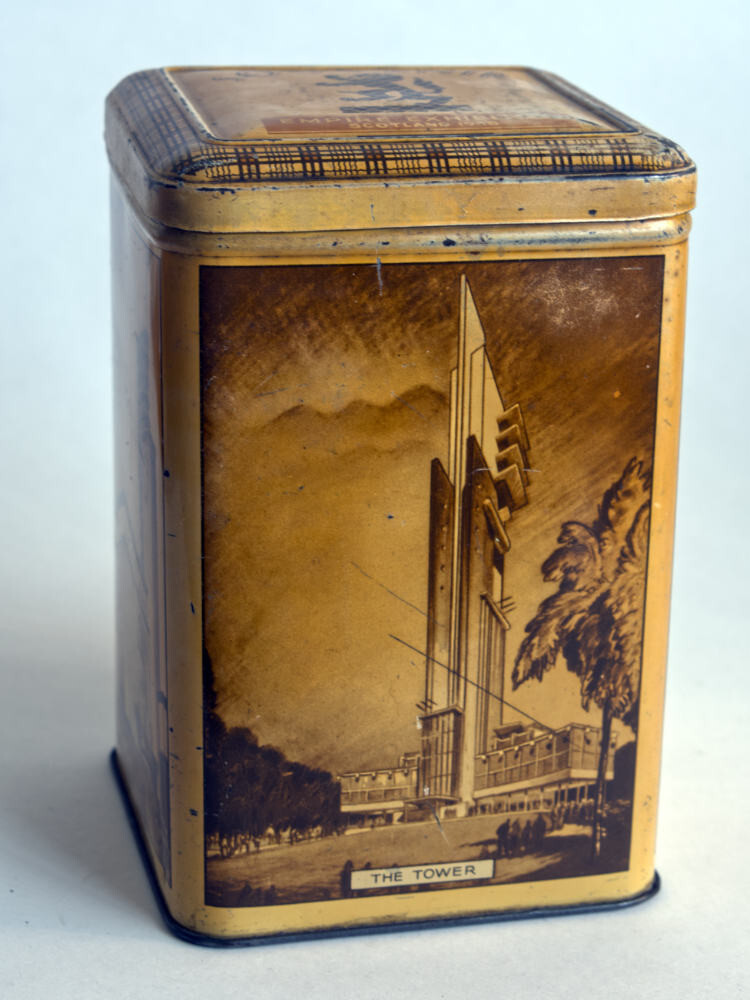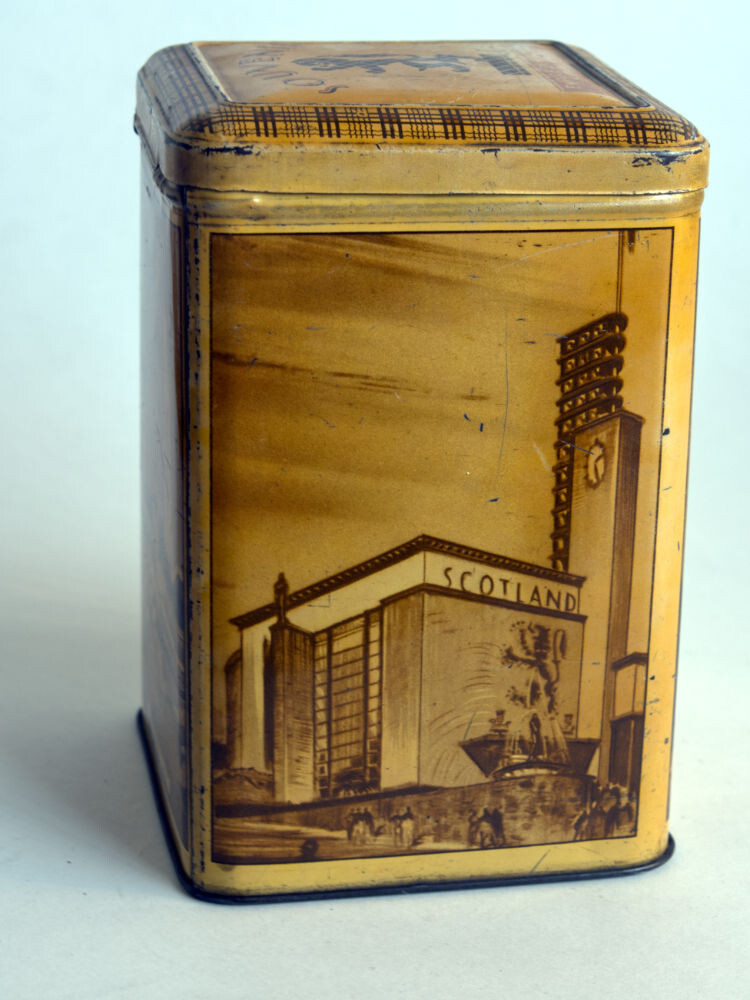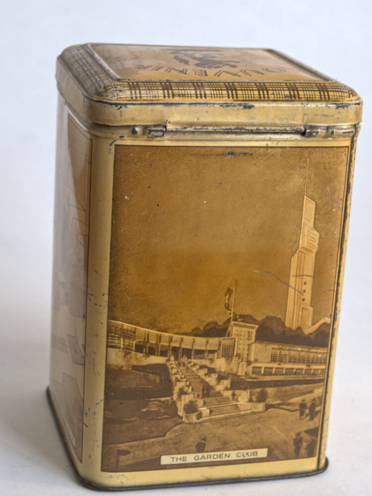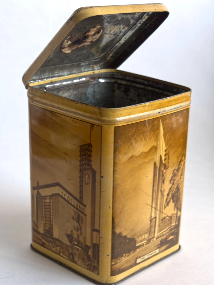 This is an original souvenir tin box from the Empire Exhibition held in Scotland in 1938. There are some scratches in the exterior paint and some paint loss on the lower right portion of the lid. Overall condition is good and the photos are accurate. Each side of the tin depicts a different pavilion in the exhibition and each of these is very Art Deco in design. It is almost 6in or 15cm in height and each side is 3 3/4in or 9.5cm in width.