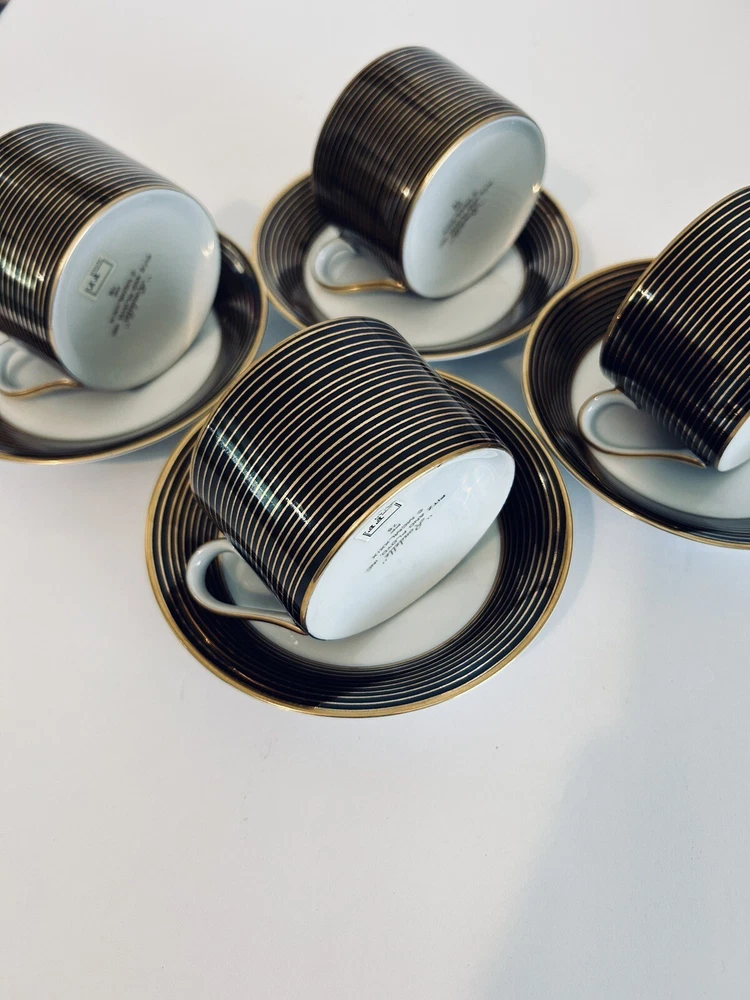 This vintage tea cup and saucer set from Fitz and Floyd's Rondelle collection is a beautiful addition to any art decor piece. The set includes four cups and saucers, each decorated with unique designs that will add a touch of elegance to your tea party. Made of high-quality porcelain, these cups and saucers are perfect for enjoying your favorite tea and coffee. The set is perfect for collectors, and the decorative style will complement any home decor. Beautiful set of (4) 10.1.24