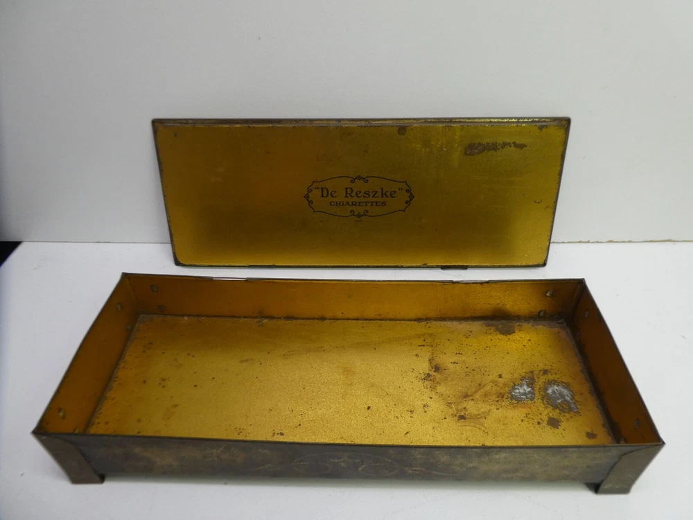 VINTAGE TOBACCO CIGARETTE TIN BOX CASE DE RESZKE ART NOUVEAU IN USED CONDITION - NICE PATINA - WEAR CONSISTENT WITH AGE AND USE 29 CM x 11.5 CM x 6 CM COLLECTORS PIECE SEE PHOTOS FOR BEST GUIDE TO CONDITION AND SIZE I AM LISTING SOME OTHER ESTATE PIECES I can combine for postage. CHECK MY OTHER LISTINGS FOR MORE