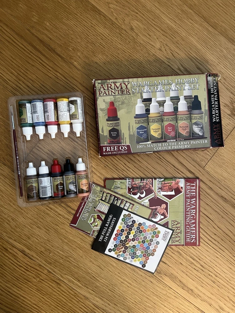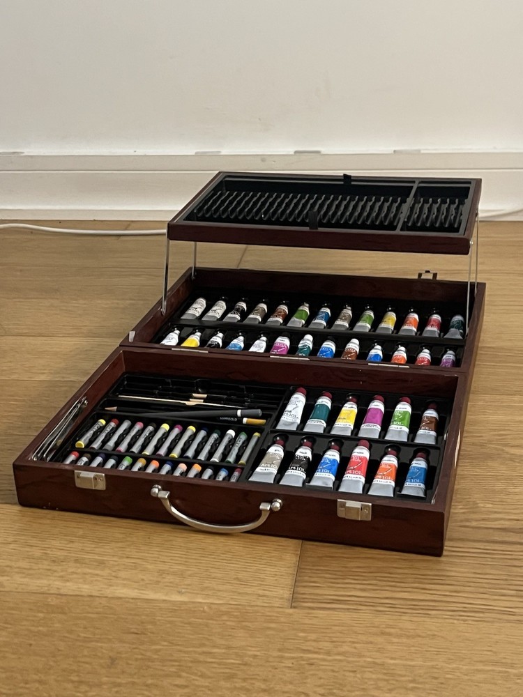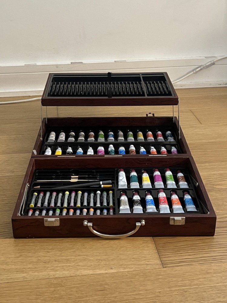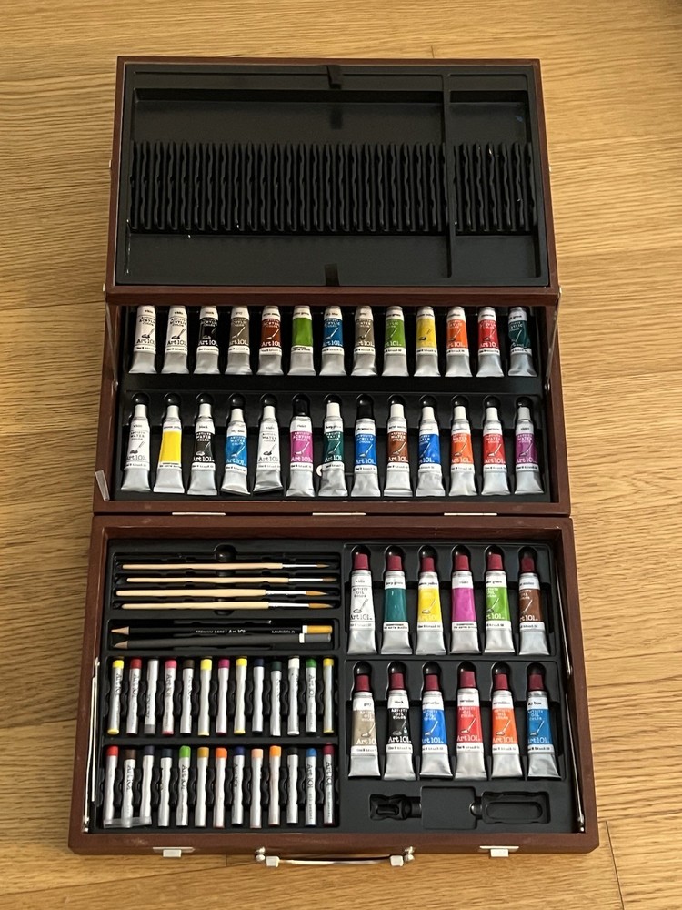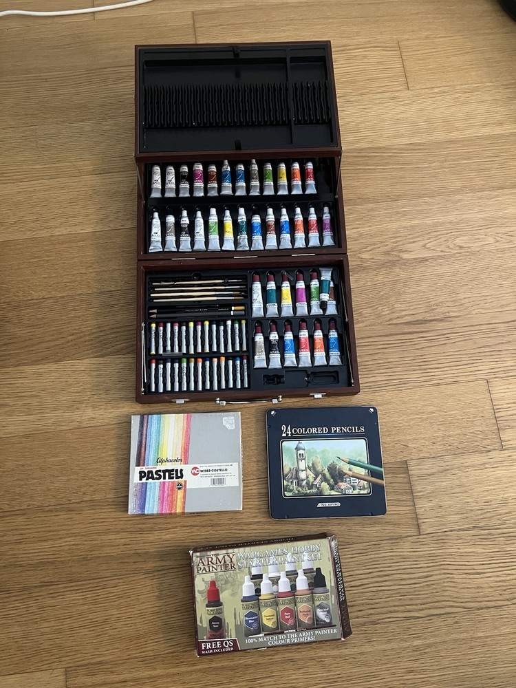 Includes: Art 101 Wooden Art Paint Set Contains assorted oil paint tubes, colored pencils, and pastels. Also includes brushes and accessories. Vintage Empire Pencil Corp Pedigree 12 pencil crayons Completely sealed, unopened The Army Painter Wargames Hobby Starter Paint Set Includes 10 dropper bottle paints Perfect for miniature painting and tabletop models Not used Alphacolor WEBER COSTELLO Soft Pastels (Set of 24 square pastels) Vintage-style box Excellent for blending and soft shading Not used, extremely minimal wear from handling Vintage Korean Munhwa NexPro 24 Colored Pencils in Metal Tin Brand: Munhwa NexPro Retro collectible packaging Not used ⸻ Condition: all items are unused and/or unopened with no signs of wear, with the Alphacolor pastels having minimal wear from handling.