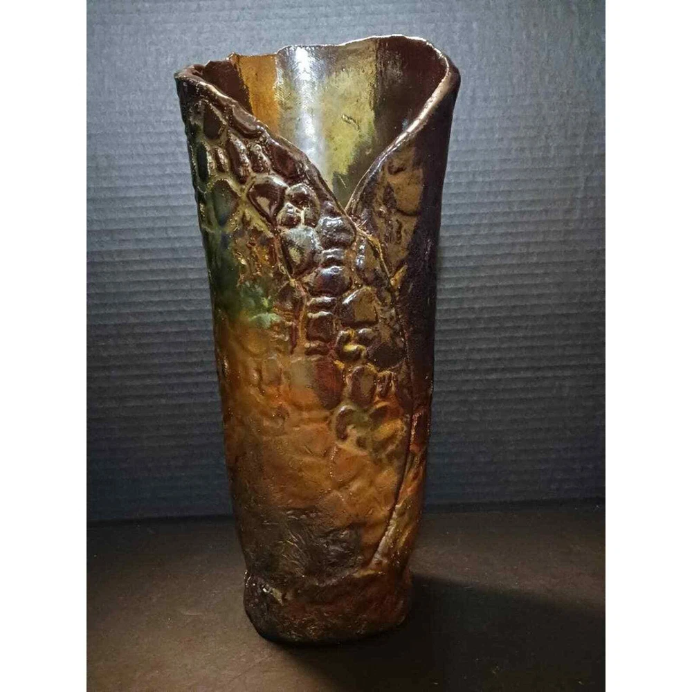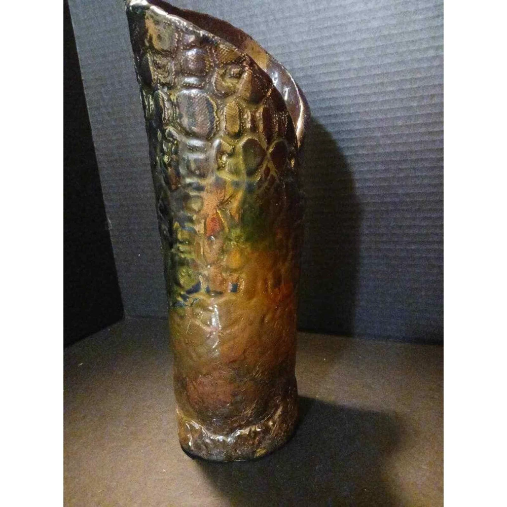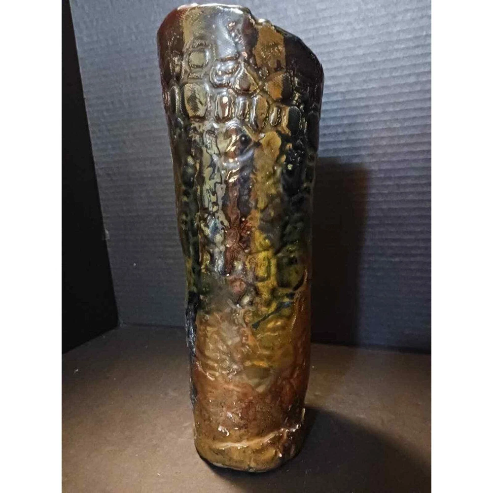 This vintage artist created a beautiful singed art pottery vase with an iridescent finish. The vase has a unique Earth tone Boho style that will add character to any room. The vase is perfect for collectors of decorative collectibles and is a great addition to any home decor.