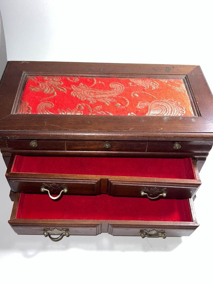 Crafted with an eye for detail, this Vintage Asian Wooden Trinket Keepsake Jewelry Box embodies the elegance of Asian culture. The medium-sized box measures 13 inches in width and 7 inches in height, offering ample space for your cherished jewelry and keepsakes. Its rich brown color and intricately carved design evoke the serenity of a temple, making it a tasteful addition to any collection. The box features a combination of wood and brass materials, ensuring both durability and a touch of sophistication. It comes beautifully boxed, ideal for gifting or as a personal treasure. With its Asian, Chinese, and Japanese thematic influences, this piece is not just a storage container but a piece of art that celebrates the beauty of Asian heritage. Good Condition show normal wear . See ALL photos