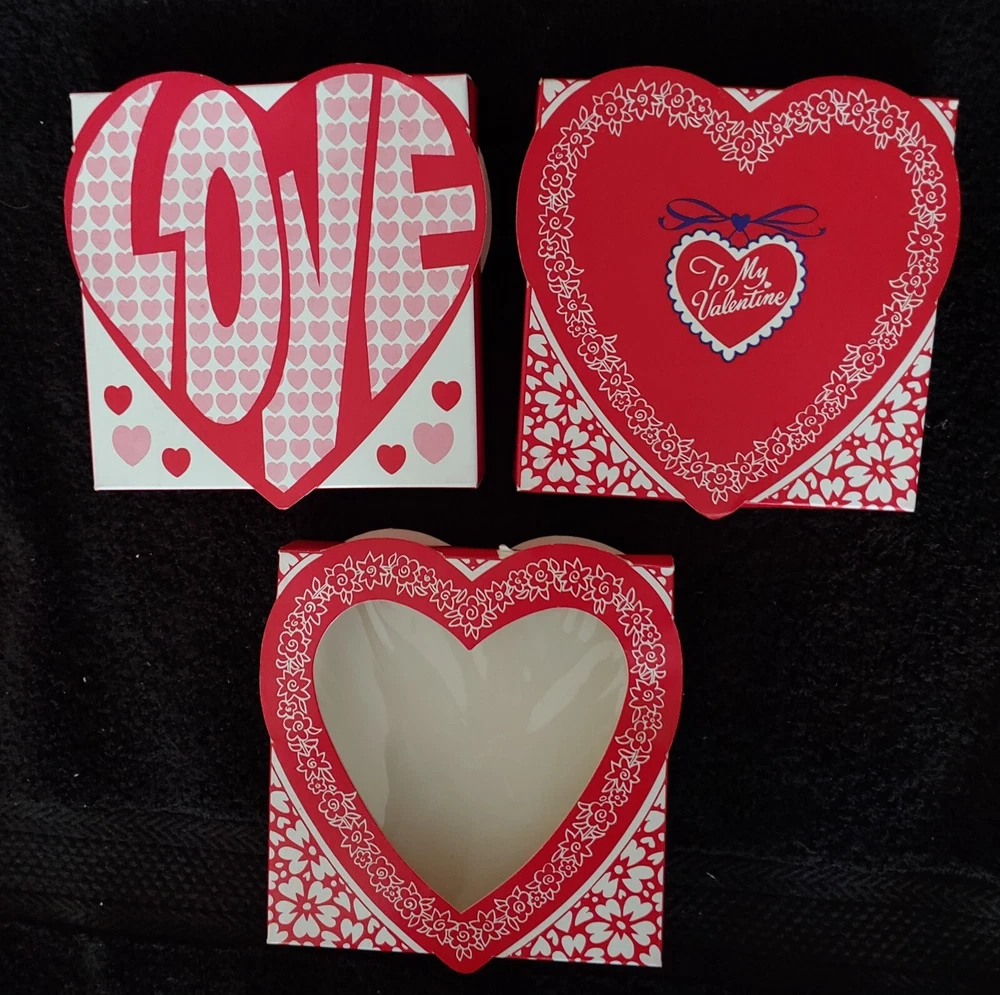 Vintage Assorted Rare 40 Year old Valentine Day Love Multi Purpose Candy, Craft, Gift Boxes, etc.... NEW These boxes are all over 40 years old from the early 1980's from a candy store I owned and operated and just came across these boxes. The exterior of the boxes is still in great like new condition with no fading, however, the interior has some discoloring from age which is certainly to be expected from boxes this old. Some boxes are assembled as marked "made up" and some boxes are unassembled which are marked as "flat"" and will be sent flat for you to simple fold up and assemble. Be sure to check which you are purchasing. These are very rare and just impossible to find but I no longer have the business so selling them. Multi use great for candy, crafts, any kind of gift that will accommodate this size. Some boxes are suitable for Valentine's Day and some for other occasions in addition to Valentine's Day. There are some insert trays available but also because of the age the glue on the corners is not sticky on all the inserts and you would need to use a small piece of tape to hold the insert in place. Also the insert may have some slight discoloration because of the age but still a rare and useful great find. This is a limited supply and no more are available. SHIPPING NOTE: These will be mailed with a flat rate of $9.00 whether you purchase one or one hundred items of any combination. The more you buy the more of a bargain on shipping . Please email any questions This comes from a smoke free and pet free home Thank you for looking