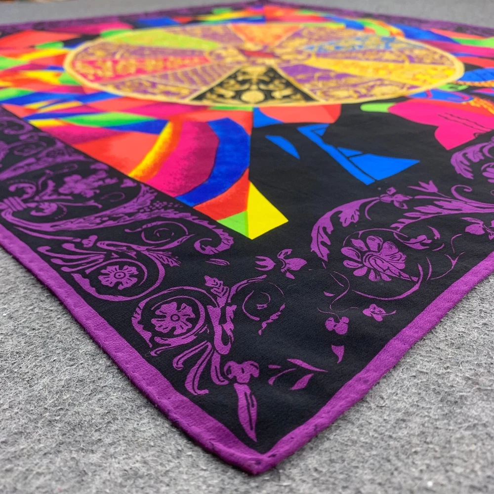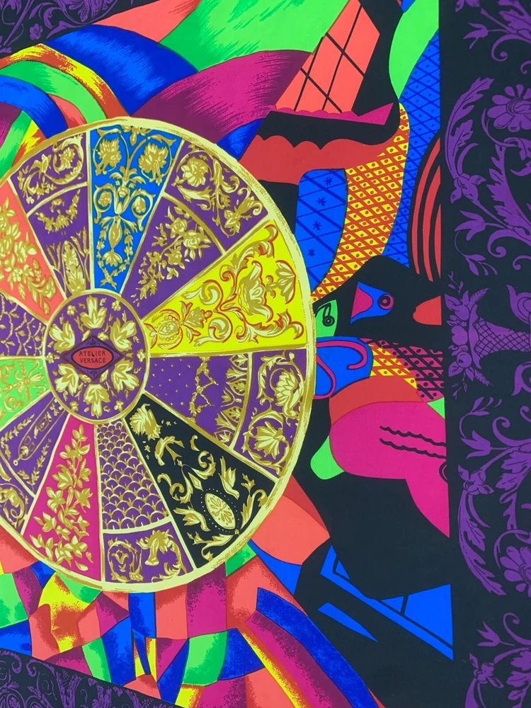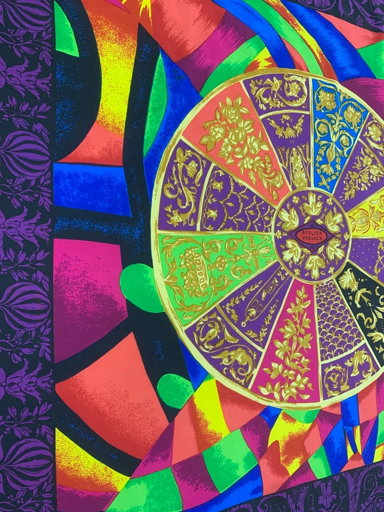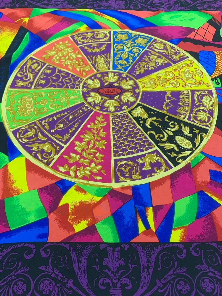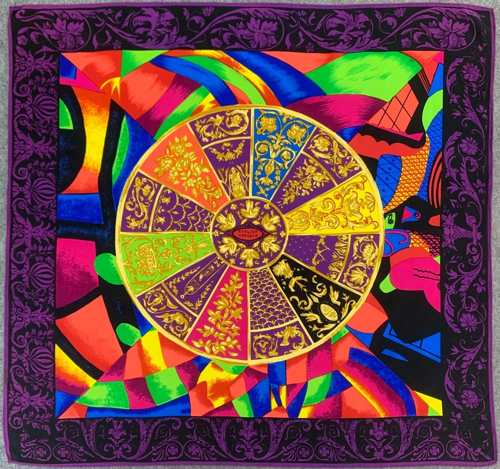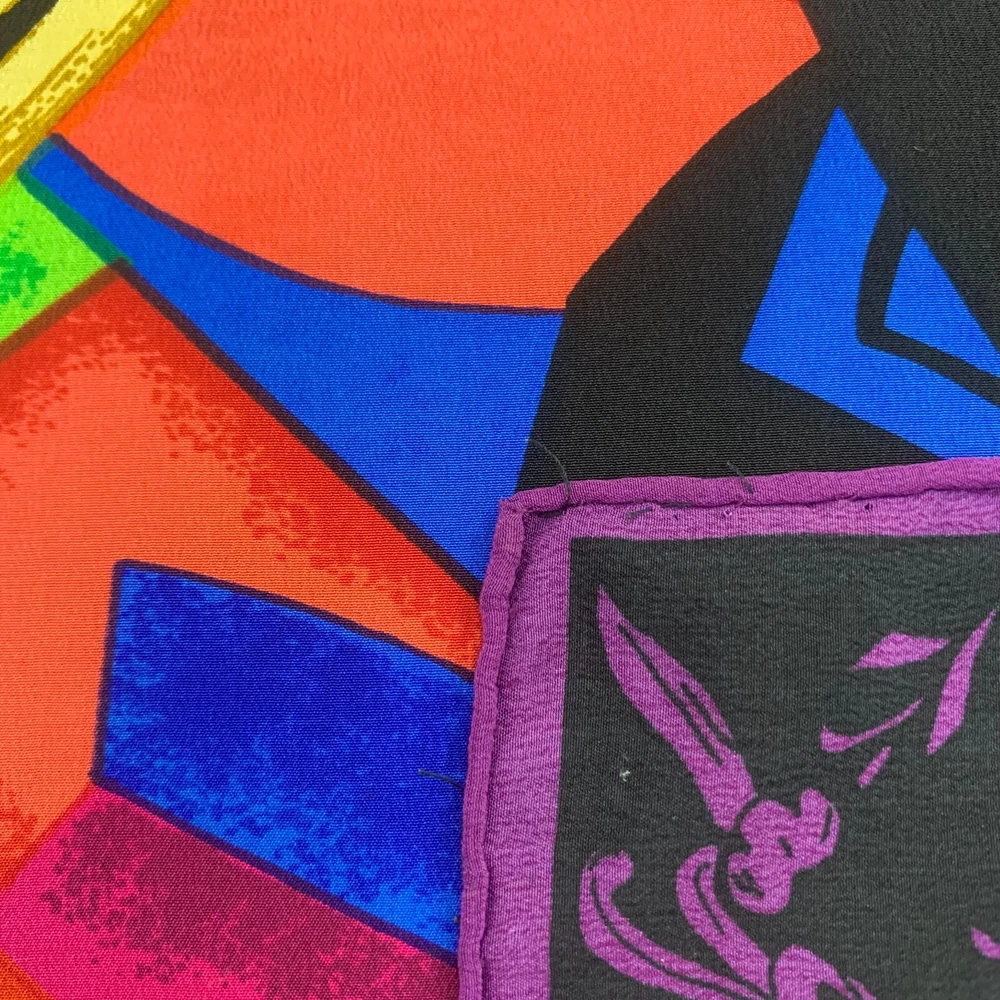 Elevate your style with this vintage Atelier Versace silk scarf, a true testament to classic design and timeless elegance. Featuring a vibrant geometric pattern that captures the essence of the 80s and 90s art theme, this square foulard is as versatile as it is visually striking. The luxurious satin silk fabric ensures a sublime touch and a high-quality finish to any ensemble. Designed for both men and women, this scarf can be worn as a neck warmer, scarf, or even a stylish accessory to accentuate your handbag. Measuring 32 inches in length and 33.5 inches in width, it is perfect for all-season use. The iconic Versace logo adds an exclusive touch to this multifunctional piece, which should be dry-cleaned to maintain its beauty.