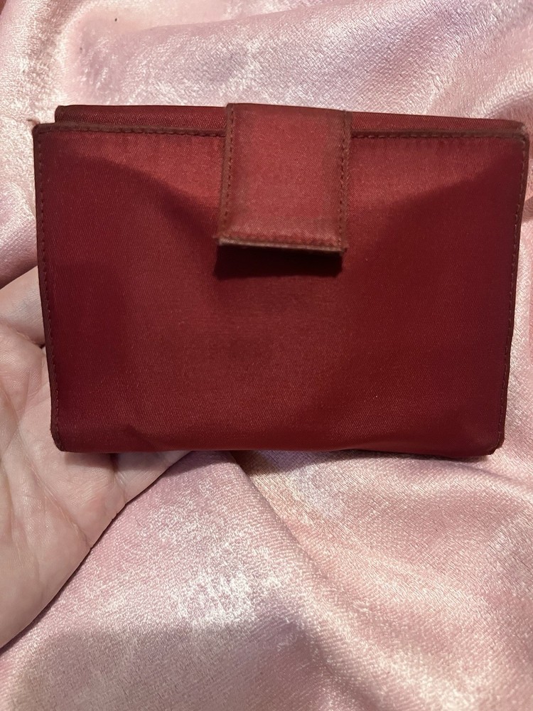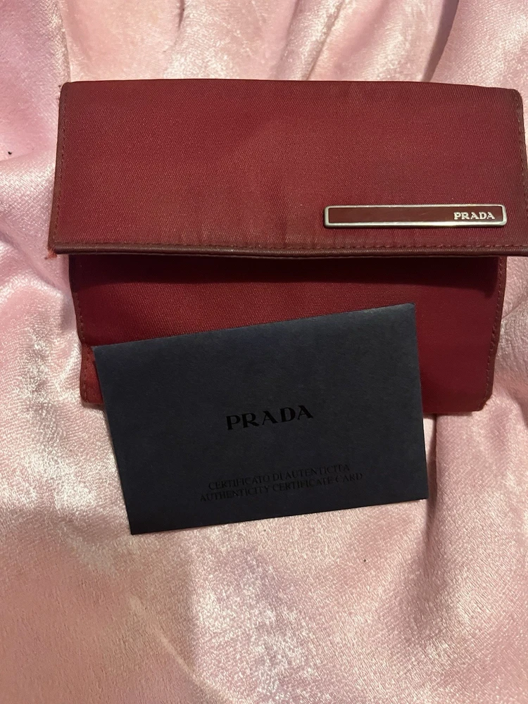 COA INCLUDED Elevate your style with this authentic vintage Prada wallet, a timeless accessory for the fashion-forward woman. Crafted in Italy from durable nylon material, this wallet boasts a classic cherry red hue that adds a pop of color to your everyday essentials. The solid pattern exudes a sense of sophistication, while the wallet's one-size-fits-all design ensures it's a perfect match for any handbag. The wallet features a practical folding design, complete with credit card slots to keep your financials organized. A certificate of authenticity is included to guarantee the wallet's genuine Prada heritage. Embrace the elegance of the 90s with this Prada wallet, a blend of function and high fashion.