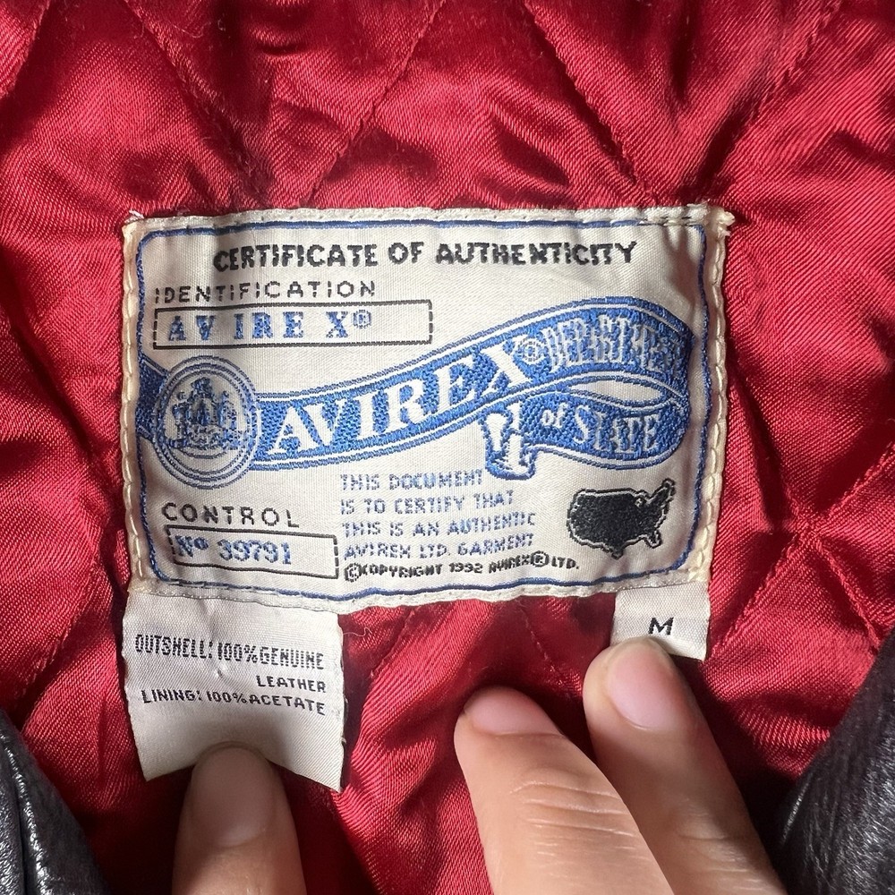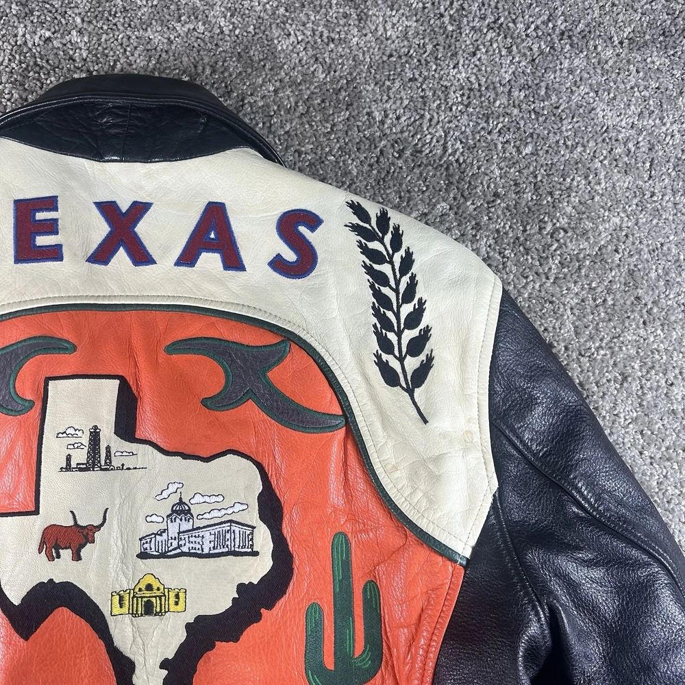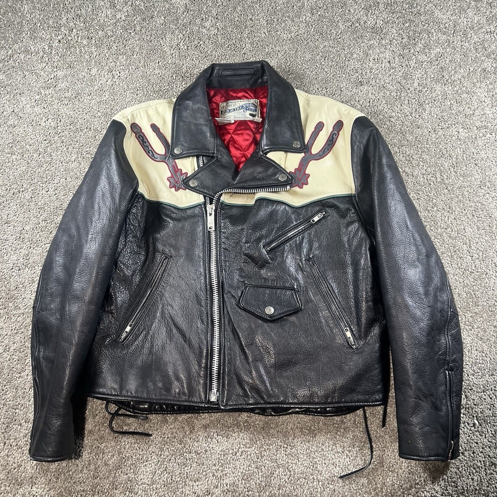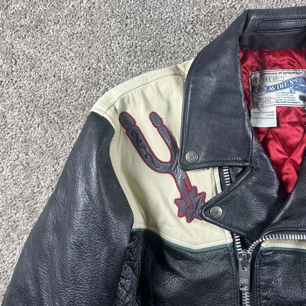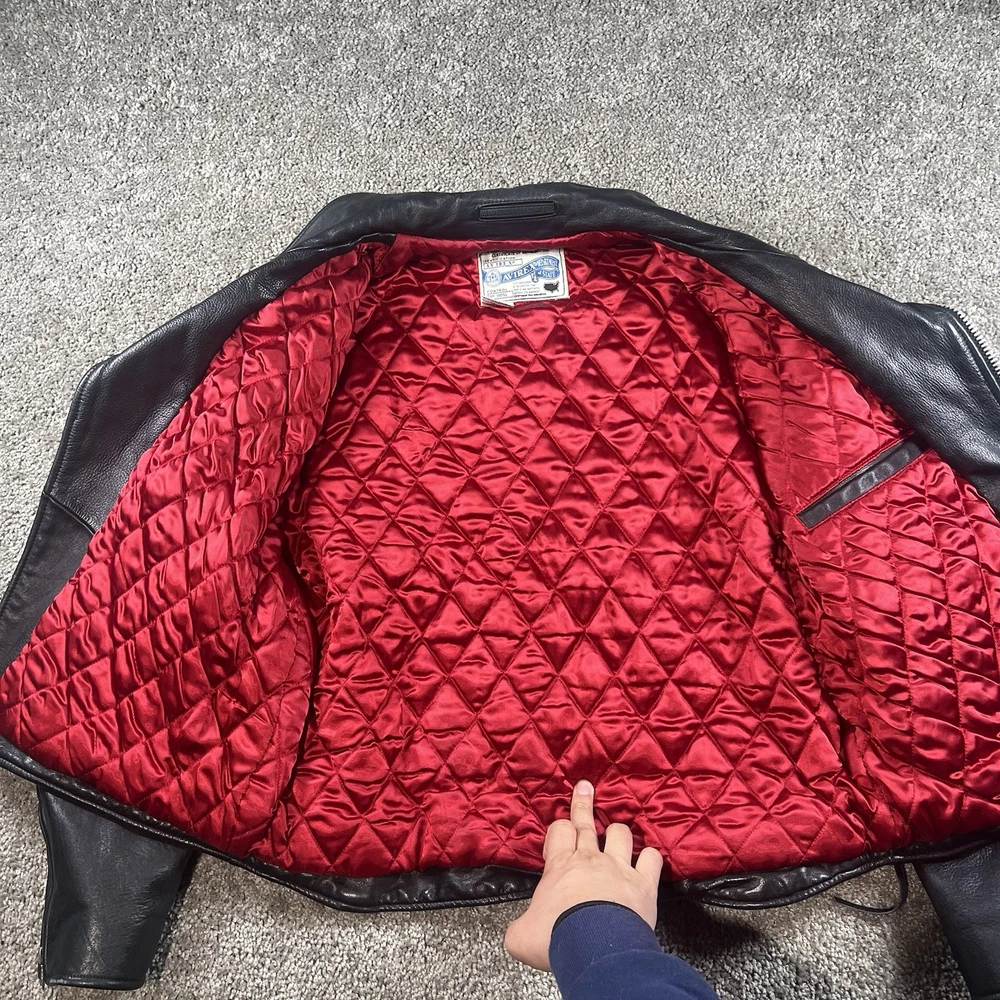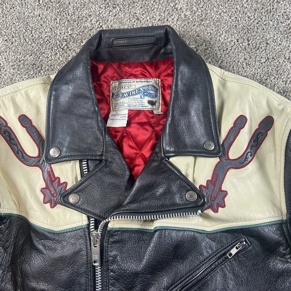 The Vintage Avirex Texas Motorcycle Jacket in Black and Red Leather is a stylish and classic piece from the 1990s. This medium-length jacket is perfect for casual occasions, with its solid black color and Accents zipper. Made from high-quality leather and insulated with polyester, it offers both durability and comfort. The Avirex brand adds a touch of authenticity to this motorcycle jacket, making it a timeless addition to any wardrobe for the winter and fall seasons.
