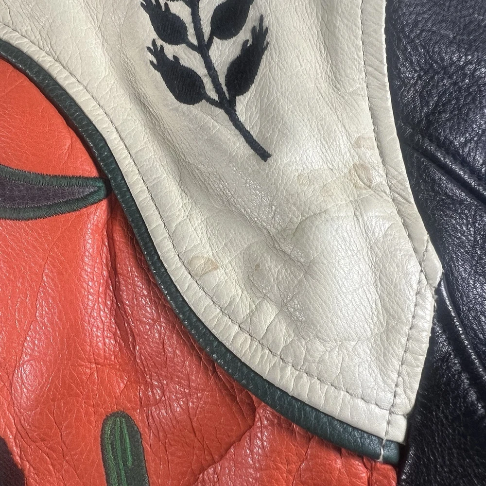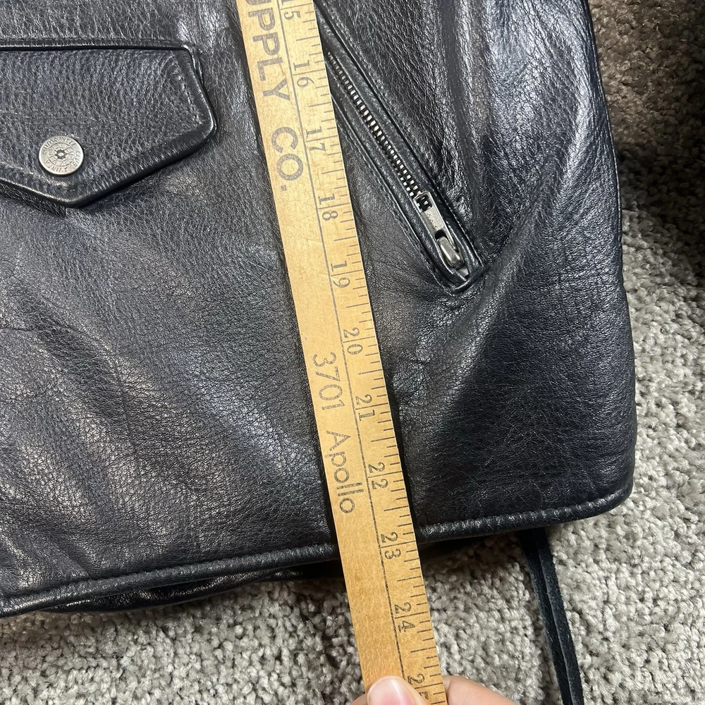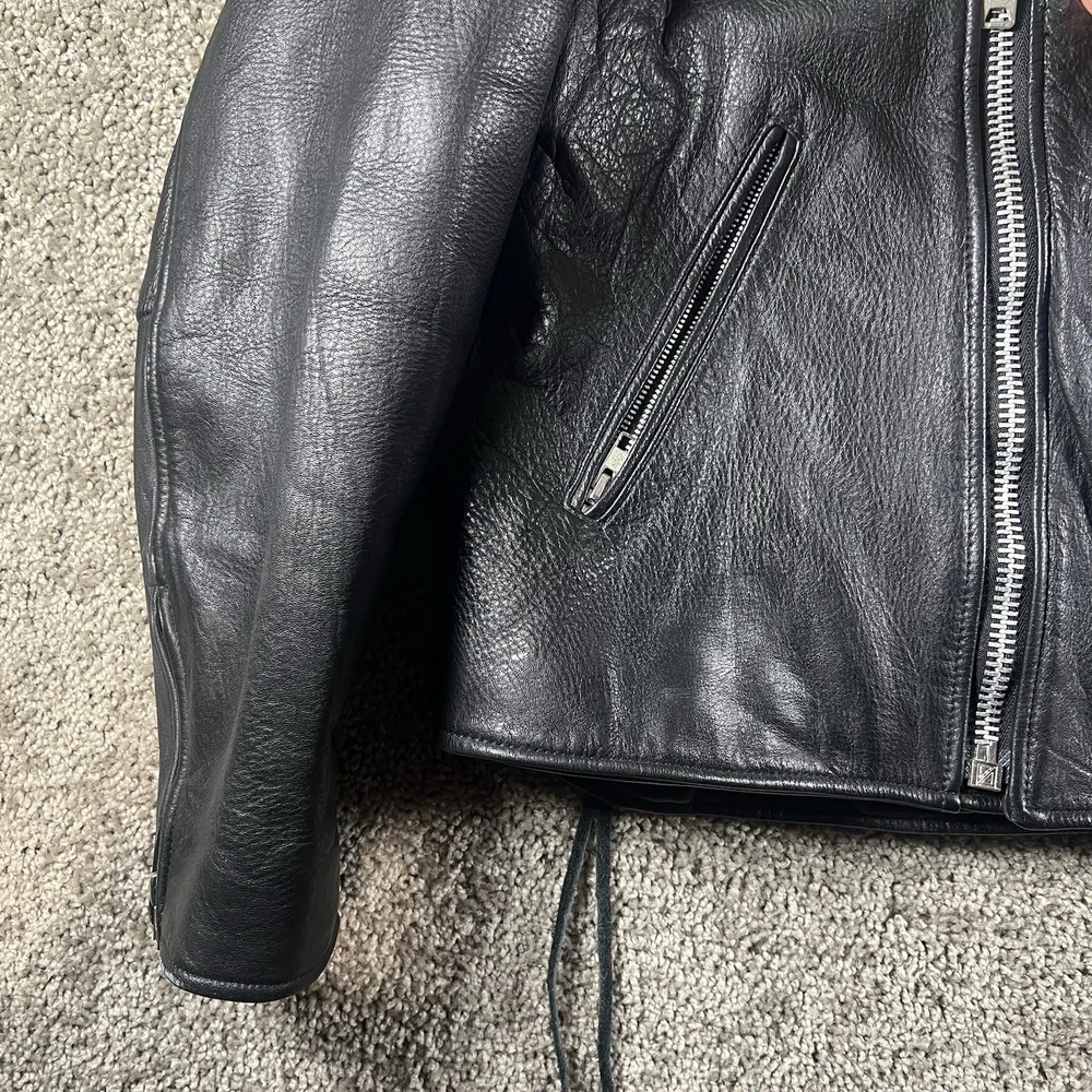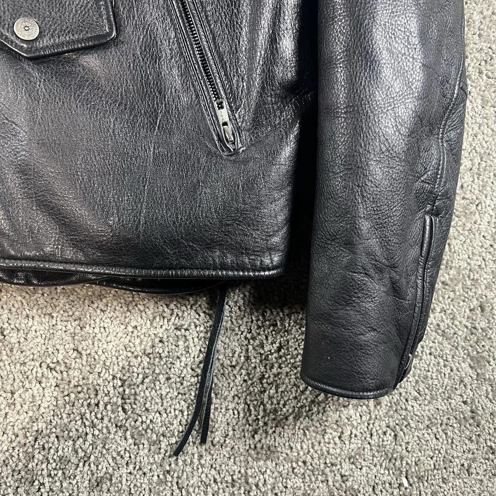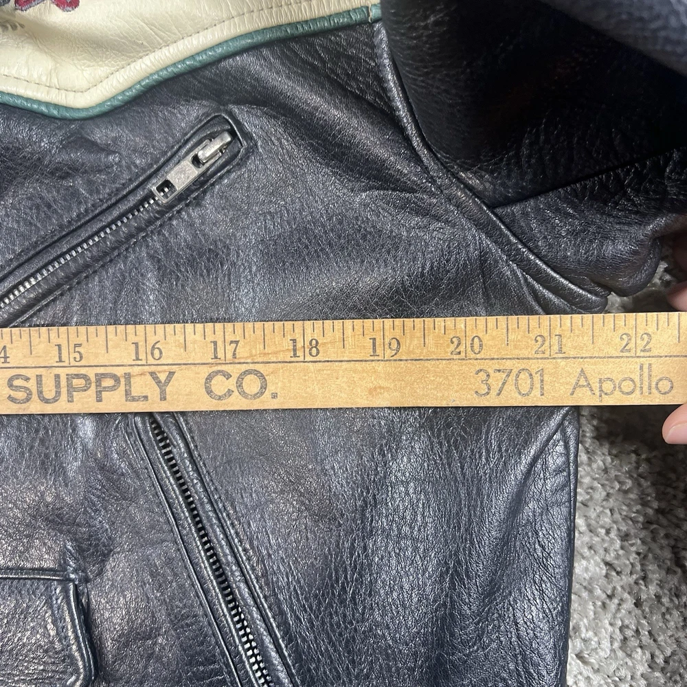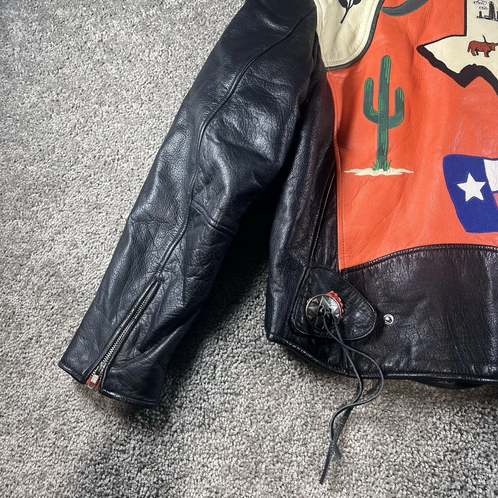 The Vintage Avirex Texas Motorcycle Jacket in Black and Red Leather is a stylish and classic piece from the 1990s. This medium-length jacket is perfect for casual occasions, with its solid black color and Accents zipper. Made from high-quality leather and insulated with polyester, it offers both durability and comfort. The Avirex brand adds a touch of authenticity to this motorcycle jacket, making it a timeless addition to any wardrobe for the winter and fall seasons.