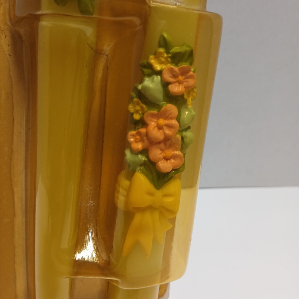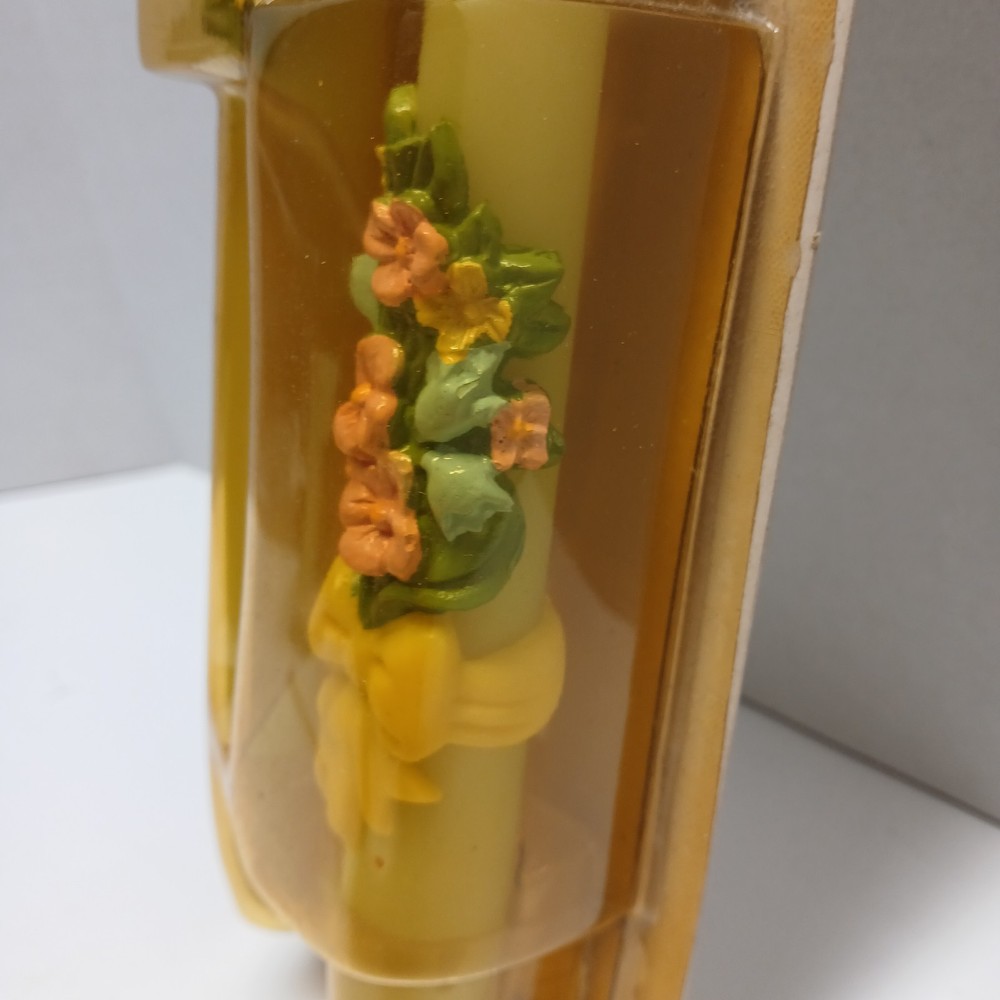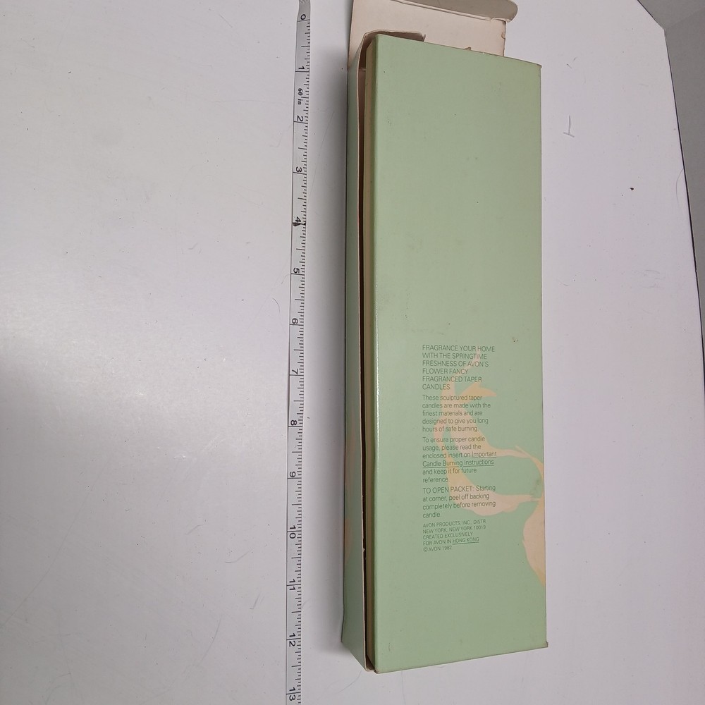 Vintage Avon Flower Fancy Taper Candles 3D Appliqued sealed package, with Original Box opened. 2 candles with flower design. Open box, candles in sealed original packaging.