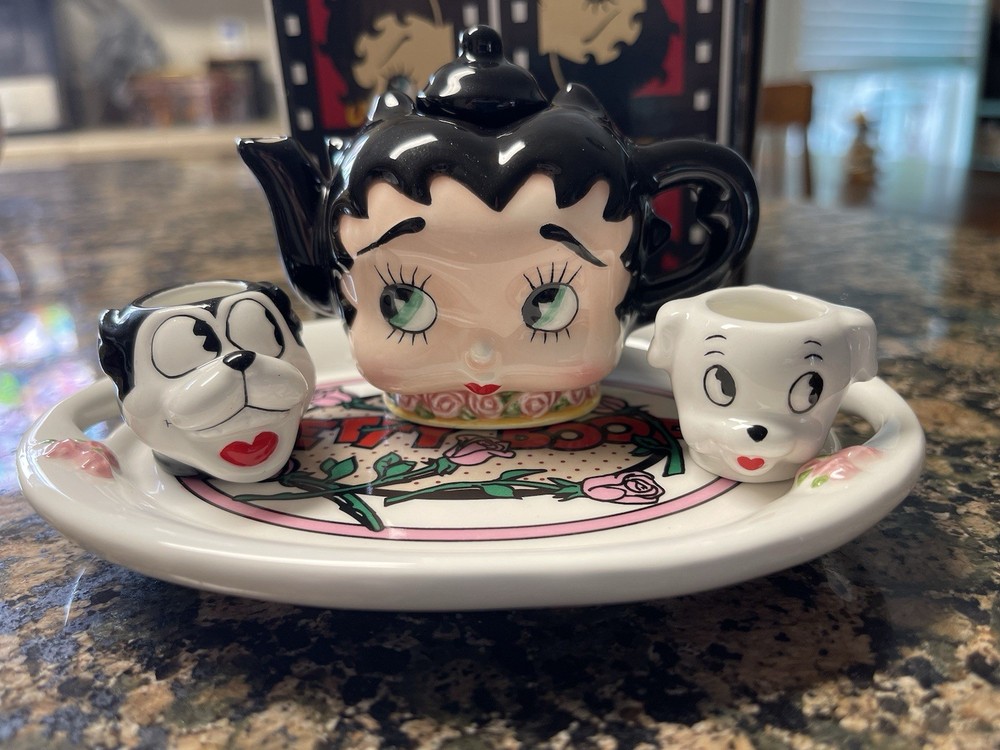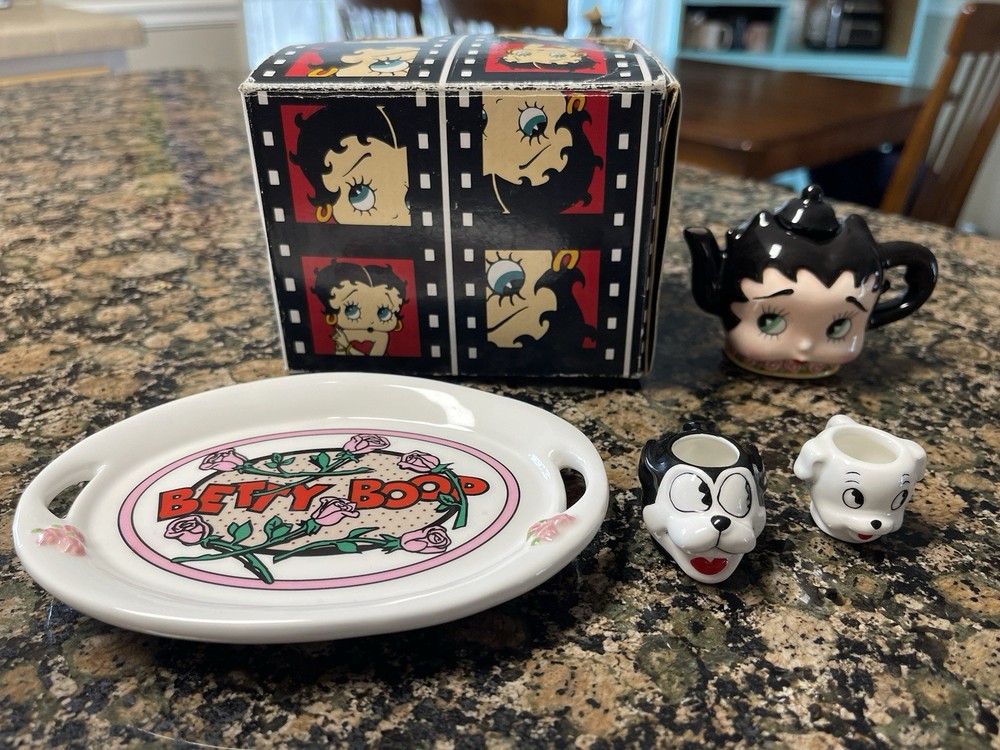 Vintage BETTY BOOP Vandor Collectible Set New In Box Set includes: Teapot (1997) Bed of Roses Mini Tea Set (1998) Mini Teacup w/plate (1997) All pieces are new in original packaging. Please feel free to message me with any questions! Thanks for looking!