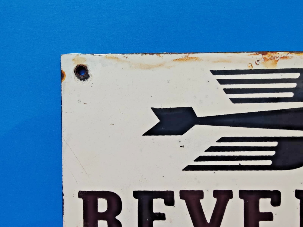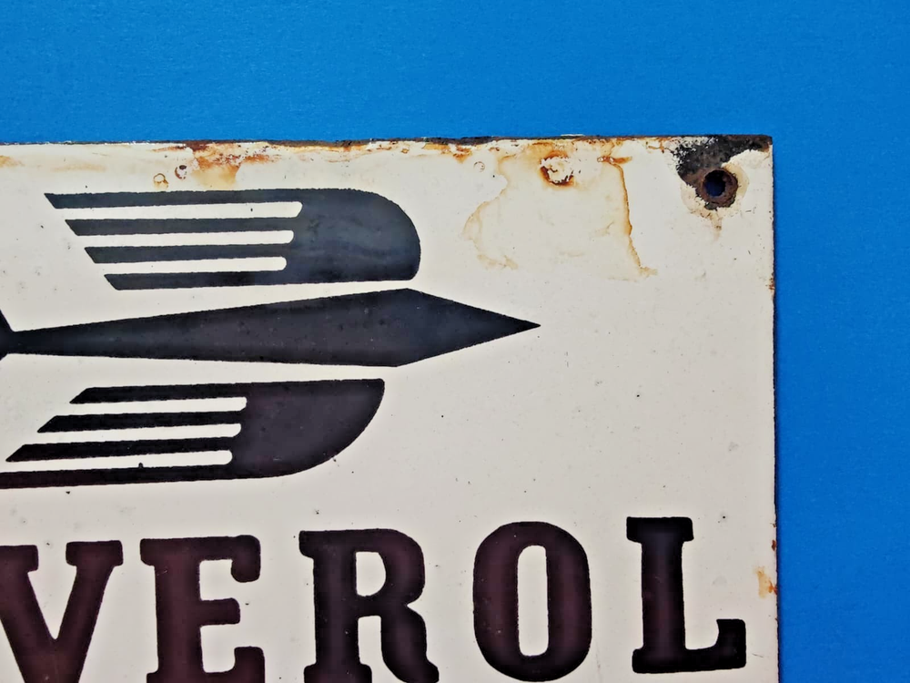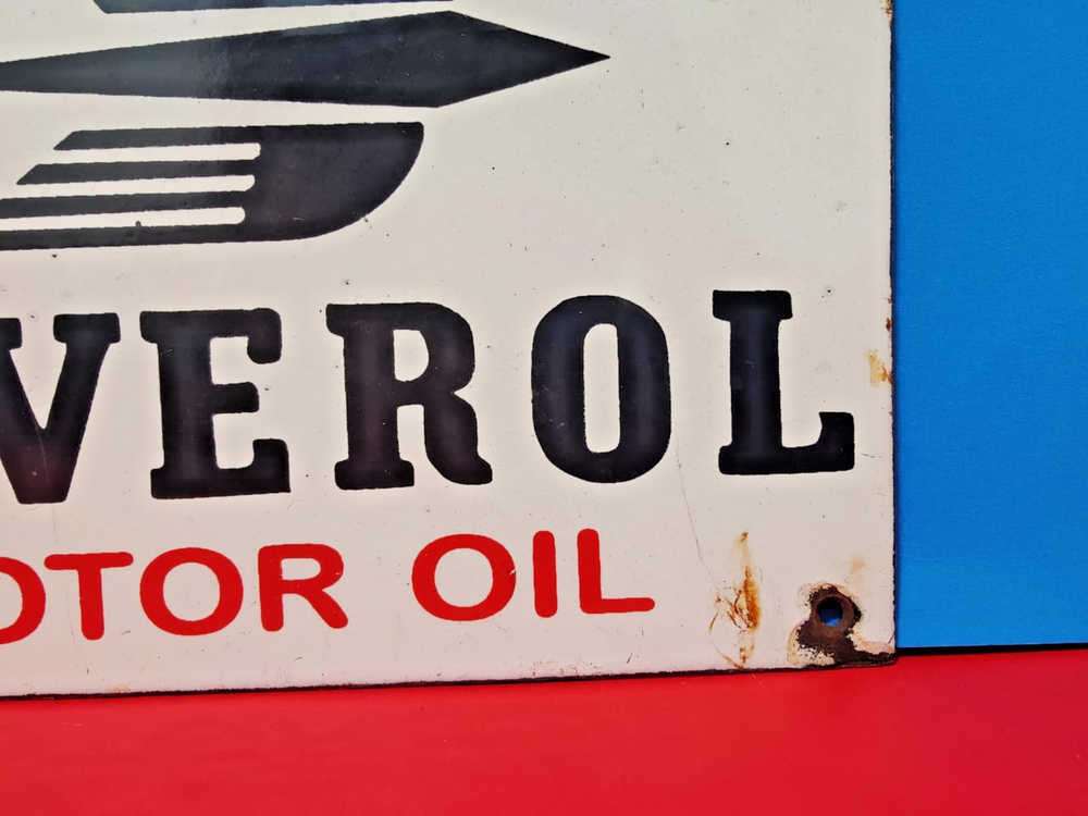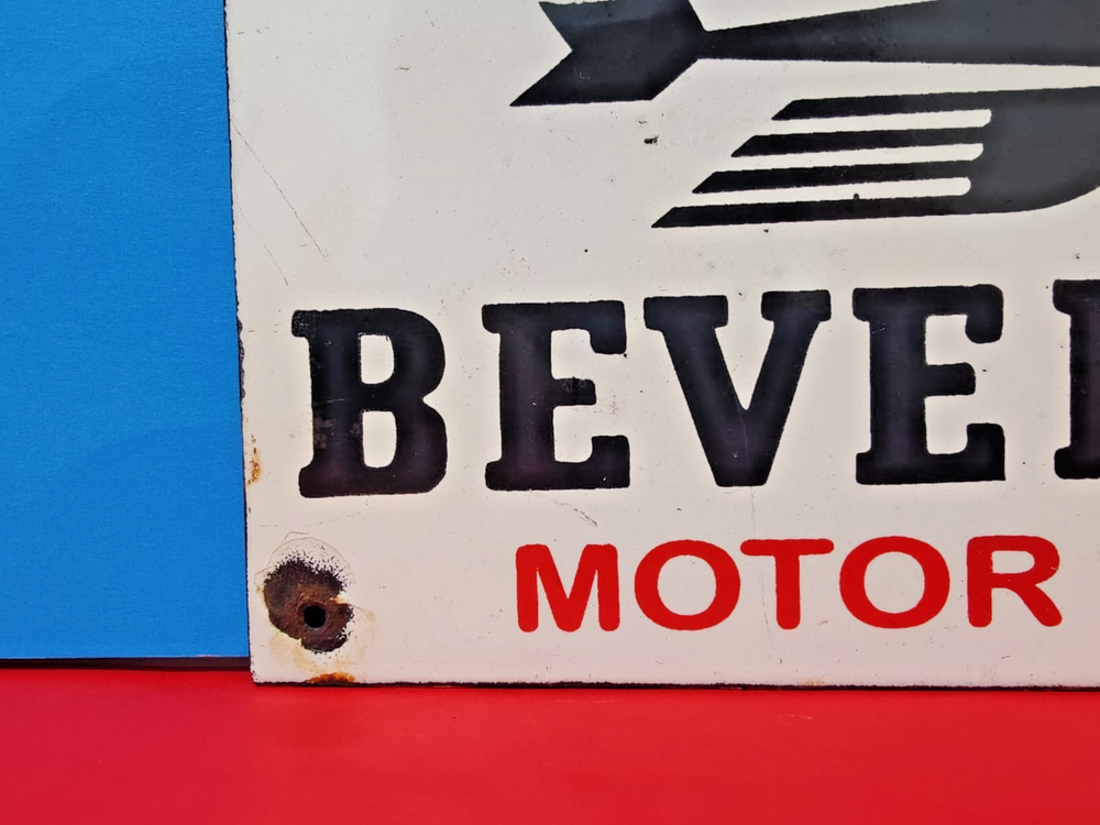 This vintage BEVEROL MOTOR OIL porcelain enamel sign measures 8" x 5" inches and features a multi-color design. Made in the United States, this original sign showcases a gas and oil theme, making it a sought-after collectible for enthusiasts of vintage signs. With its classic design and historical significance, this sign would be a perfect addition to any collection of vintage advertising memorabilia.