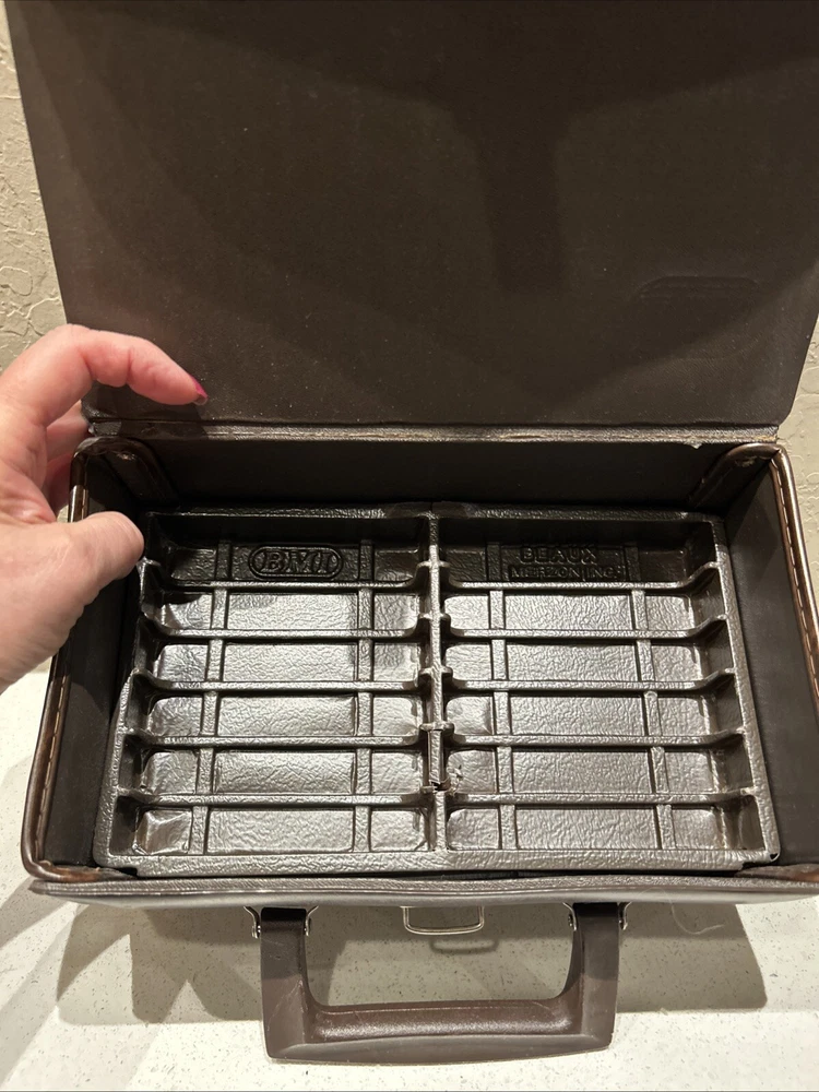 Vintage BMI 12 Cassette Tape Storage Case Holder Brown with Handle Great small vintage case. Please see pictures that plastic insert for tapes inside have a very small imperfection or tear due to age. Will not affect tapes storage. Thank you.