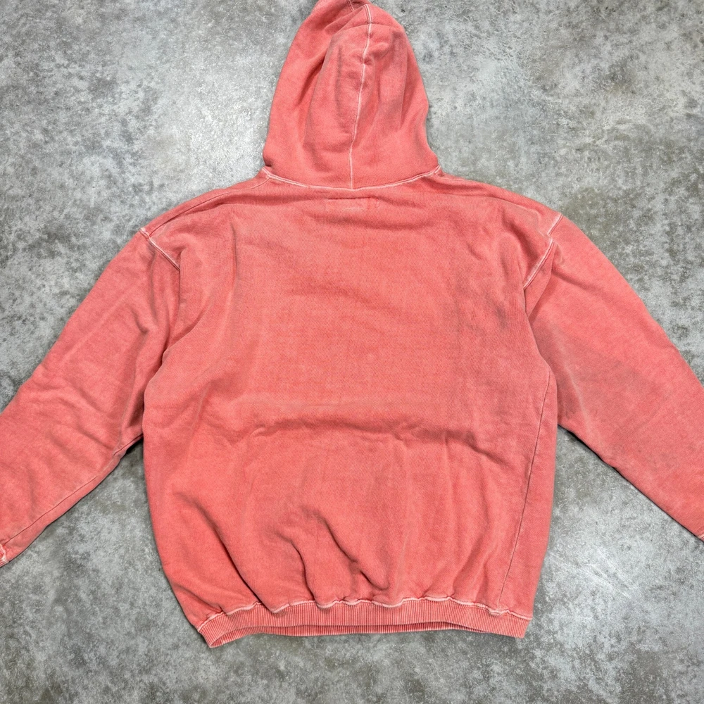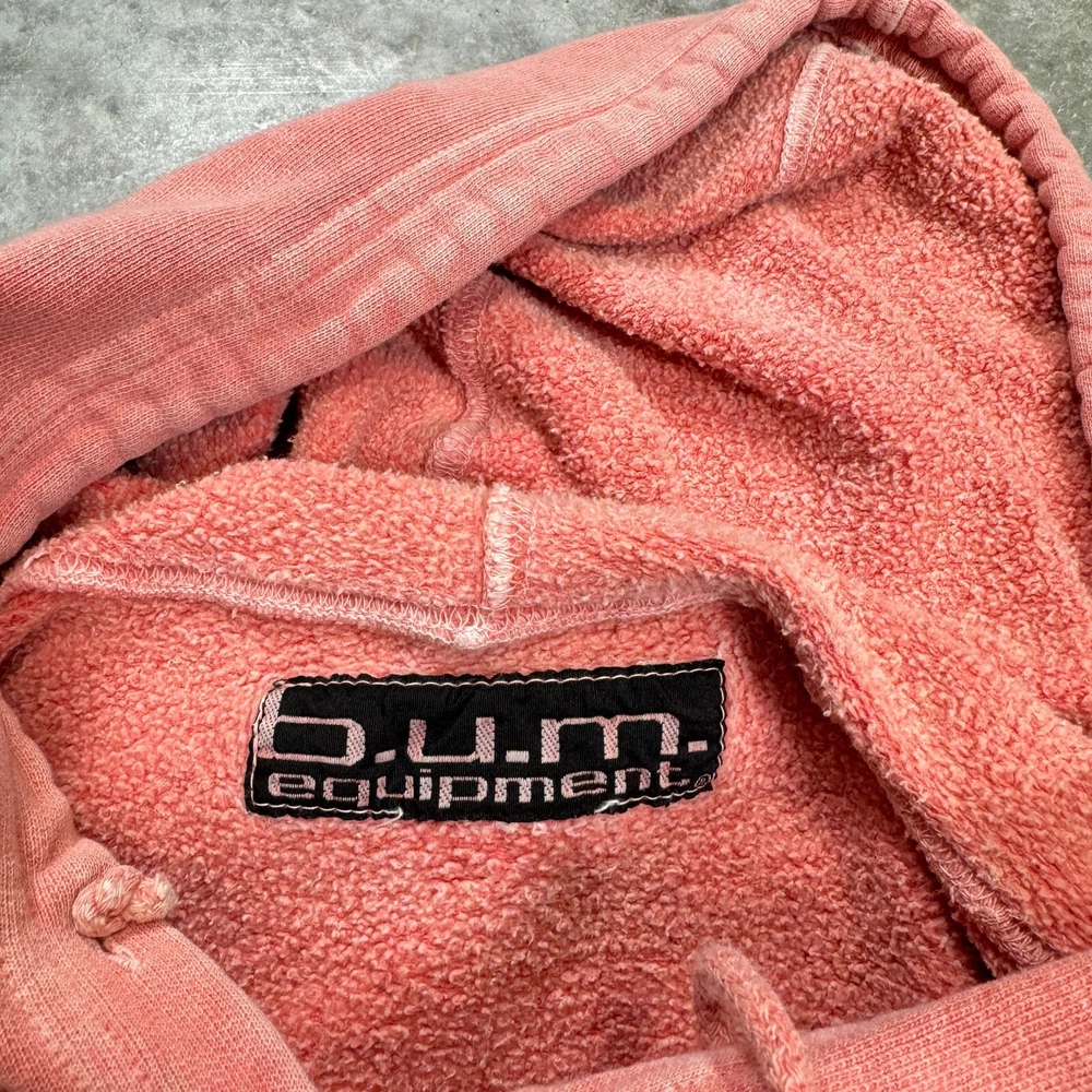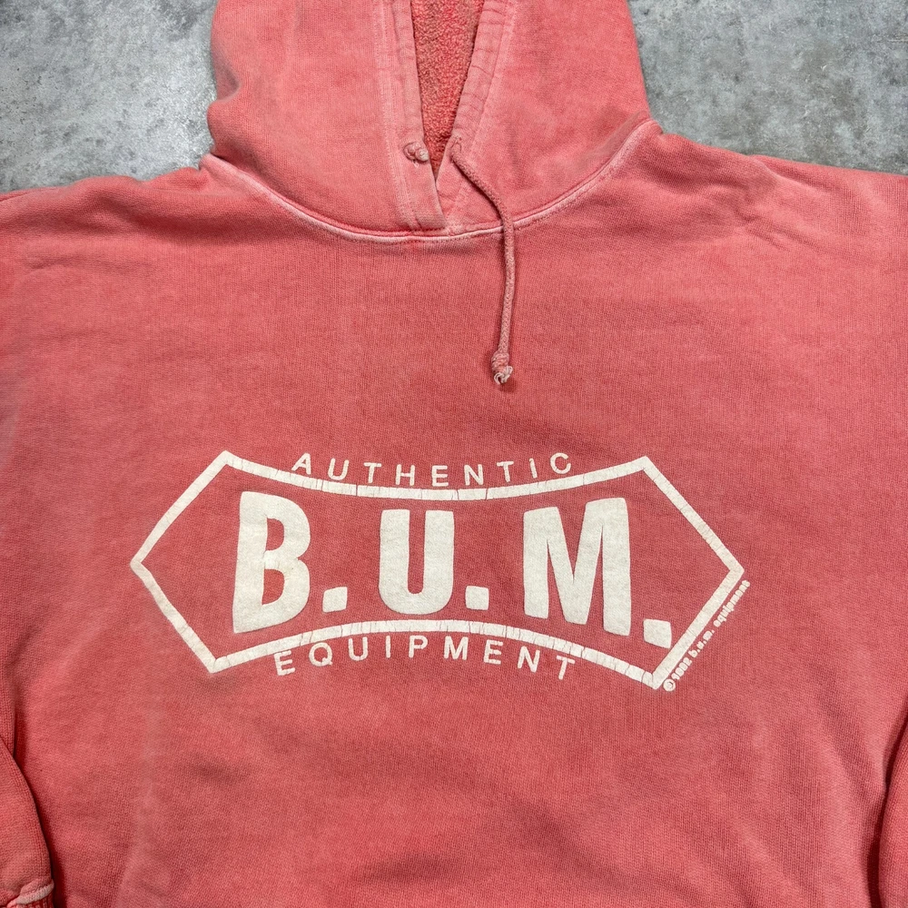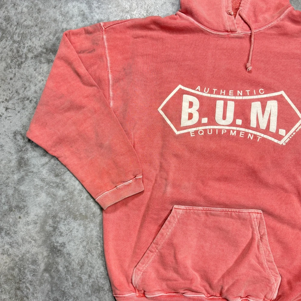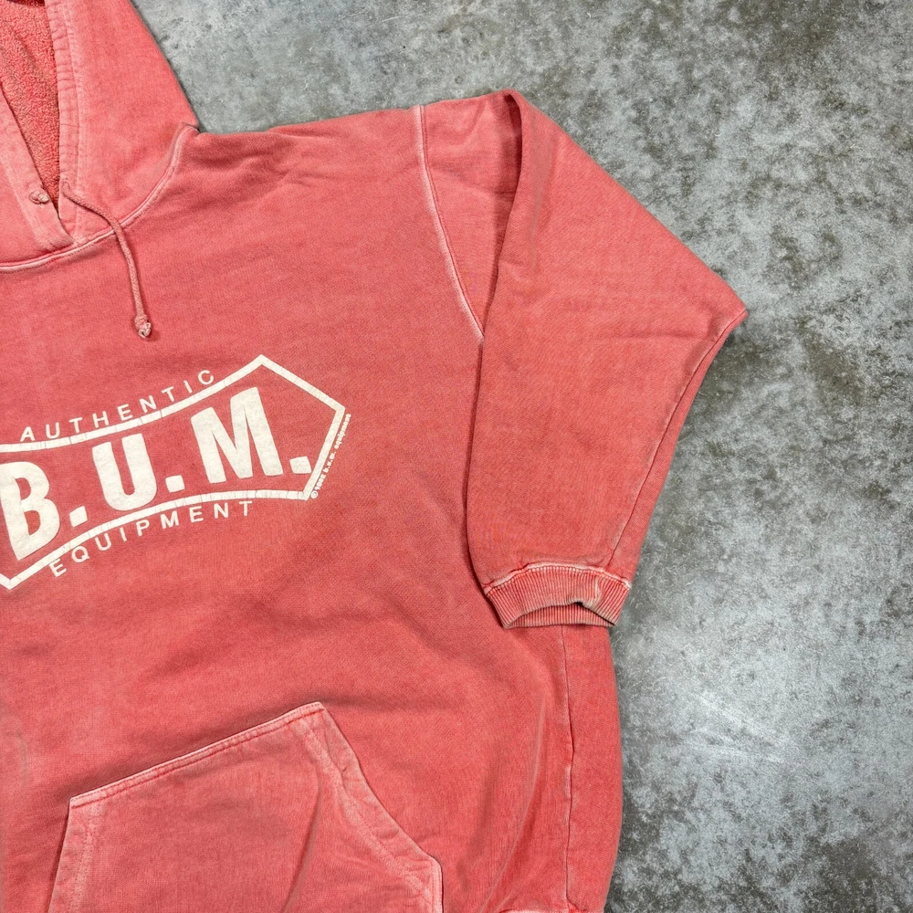 Vintage B.U.M. Equipment 90s Hoodie sweatshirt size Large pink peach distressed
