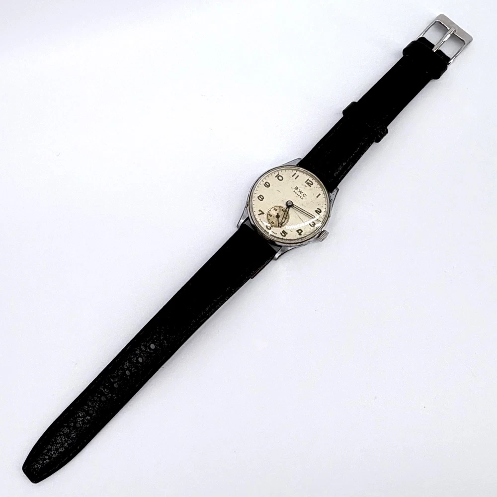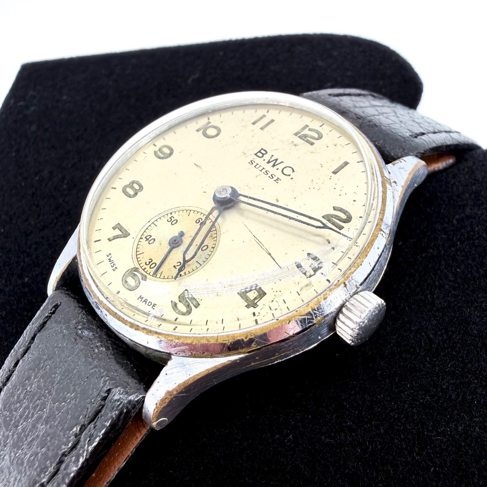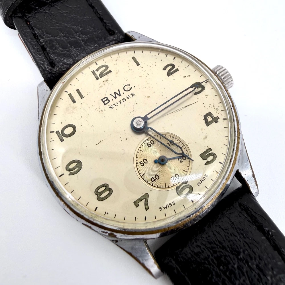 Vintage B.W.C. Suisse Manual Wind Wristwatch – c.1940s – 15J – Working Description: A handsome vintage Swiss wristwatch by B.W.C. (Buttes Watch Co.), dating to approximately the 1940s. This classic piece features a manual wind movement with subsidiary seconds at 6 o’clock and retains a beautifully aged dial with attractive patina, giving it plenty of period character. The watch is currently running well and presents nicely on the wrist. It has been fitted with a new black leather strap and is supplied in a Bowles Ltd watch gift box, making it ideal as a gift or for a vintage watch collection. Key Details: Maker: B.W.C. (Suisse) Origin: Swiss made Movement: Manual wind mechanical movement Jewels: 15 jewels Dial: Cream dial with Arabic numerals and subsidiary seconds Case: Stainless steel case back (Fond Acier Inoxydable) Strap: New black leather strap fitted Presentation: Supplied in a Bowles Ltd watch gift box Dimensions: Case width: 27.7mm including crown Case width: 25.5mm excluding crown Lug to lug: 31mm Thickness: 10.3mm Lug width: 16mm Condition: Running and operating well at the time of listing Dial shows age-related patina and spotting, consistent with age Acrylic crystal in excellent condition Case shows wear, plating loss, and marks from age and use, particularly around the bezel and lugs Case back clean with light surface wear Strap is new and unworn Summary: A charming and wearable 1940s Swiss wristwatch with honest vintage character. A great entry into vintage mechanical watches or a solid addition to an established collection. Additional Notes: Please note this is a vintage mechanical watch. While it is running and operates well at the time of listing, no guarantee is given regarding timekeeping accuracy, power reserve, or long-term reliability. Vintage watches are sensitive to shock, magnetism, and moisture, and may require servicing to perform to modern expectations. The service history of this watch is unknown, therefore we recommend a service be carried out to ensure long-term reliability. This watch is sold as a vintage collectible item rather than a modern timepiece. As usual, this item will be packaged carefully and dispatched with tracking. International shipping is available through the eBay Global Shipping Programme (GSP).