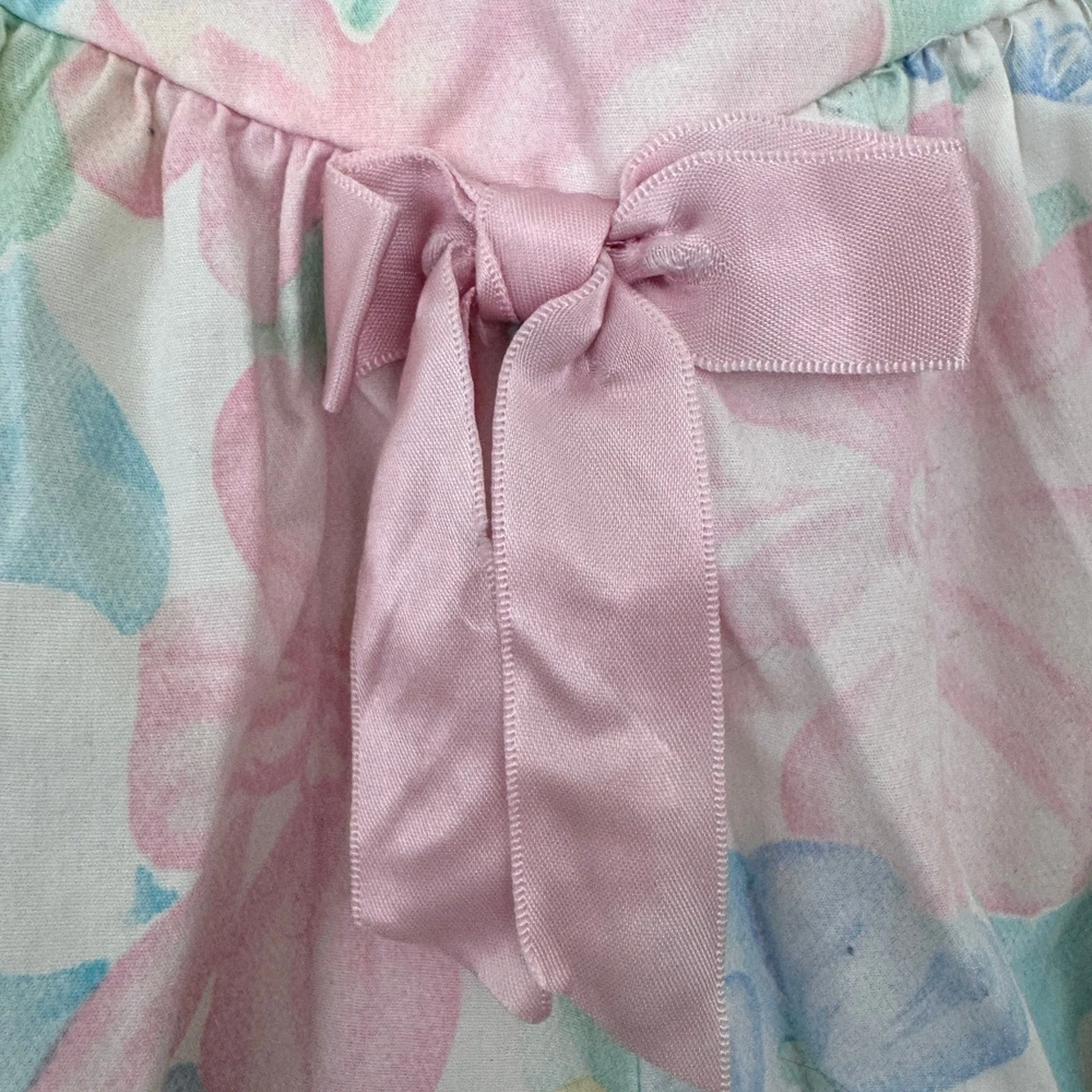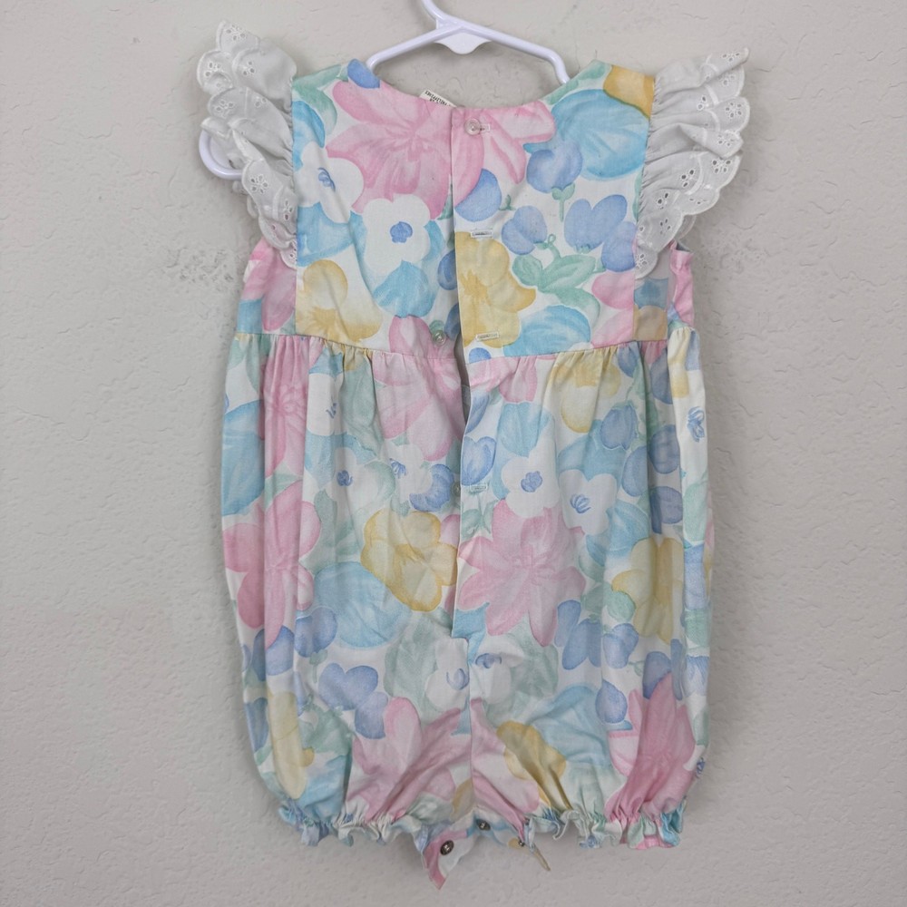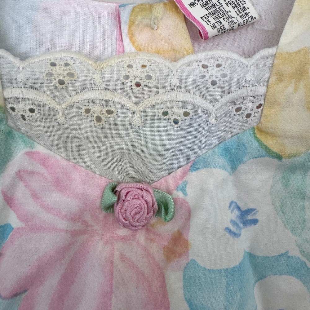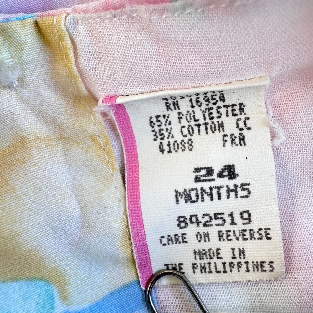 Good pre-loved condition (see pics for details). Wear on snaps, Some discoloration on lace Measurements: Chest-11 in across, Length-17 in Size: 24 months Color: Pink, white, yellow, blue, multi Material: Poly, cotton