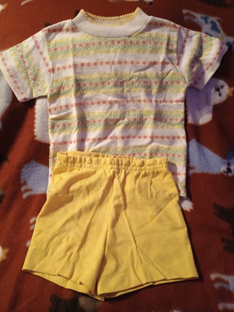 This Vintage Baby Girls Clothing set in size 4t is an adorable 2-piece outfit perfect for the warmer seasons of summer and spring. The set includes a yellow short-sleeve top and matching shorts, made from a comfortable cotton blend fabric. With a vintage style reminiscent of the 60s, this Healthtex brand set is ideal for little girls who love a retro look. Easy to mix and match with other items in their wardrobe, this outfit set is a must-have for any fashion-forward toddler.