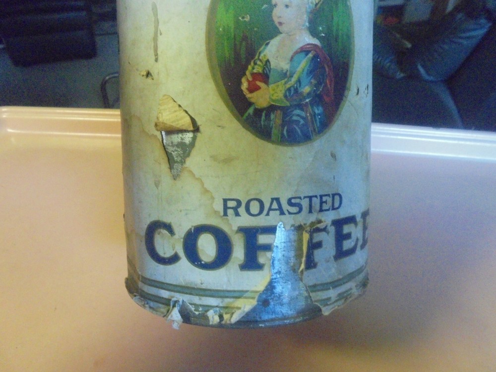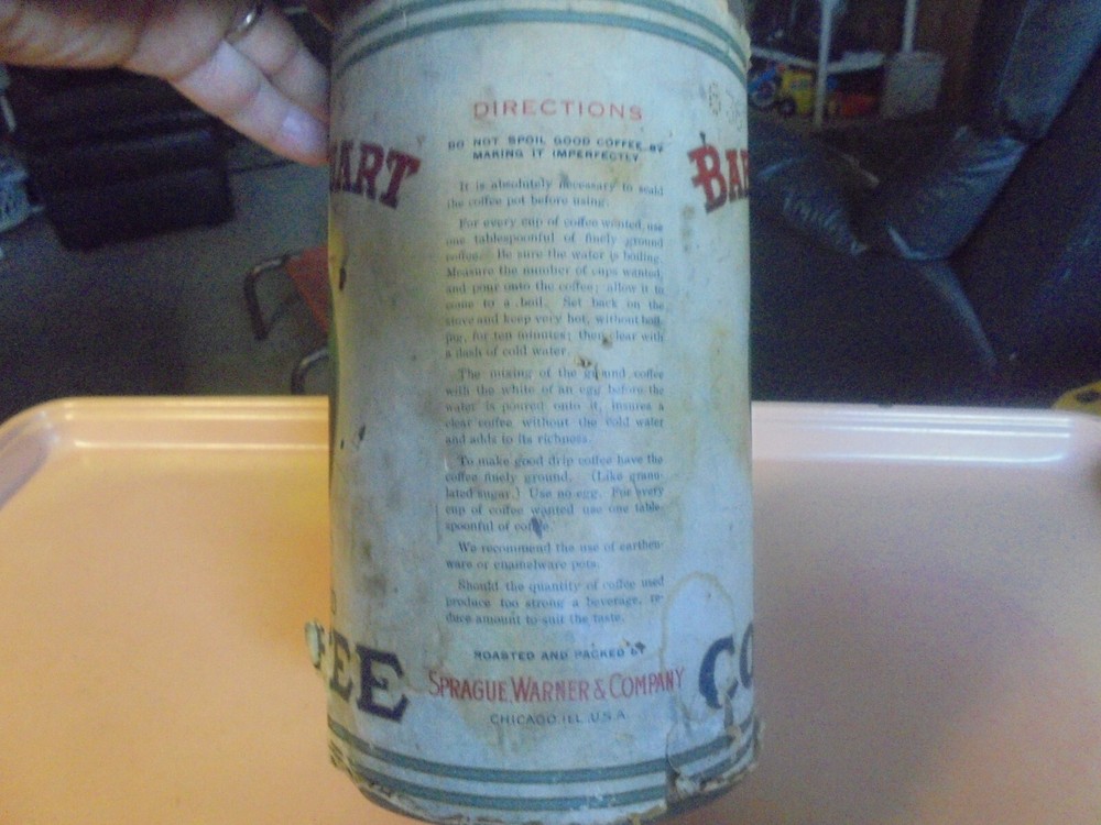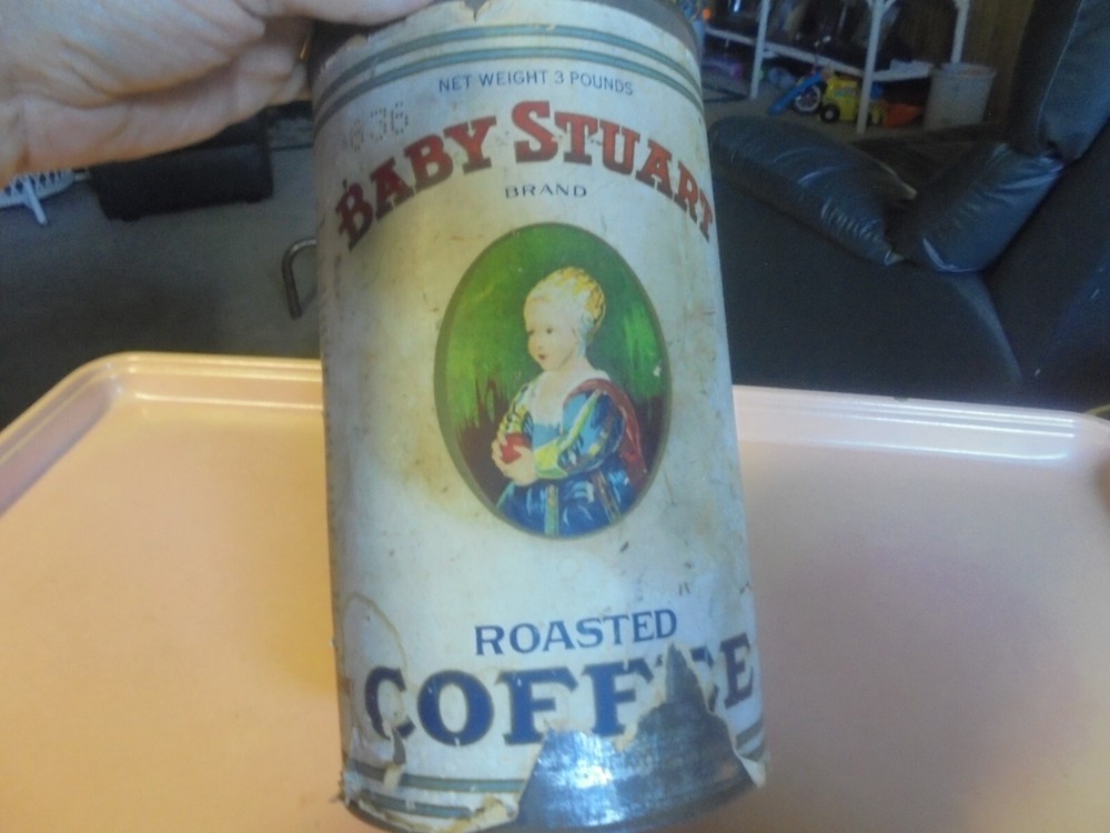 You are bidding on a three lb. Baby Stuart coffee tin. It has a paper label. The label has some tears and some pieces of paper missing. The label has some soiling and wear. Roasted and Packed by Sprague, Warner & Co., Chicago, Ill.. The top lid is missing. It is 5 and 1/2 inches in diameter and 9 and 11/16 inches tall. It is in fair to good condition. I combine shipping on multiple purchases.