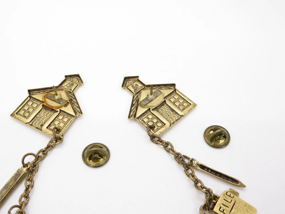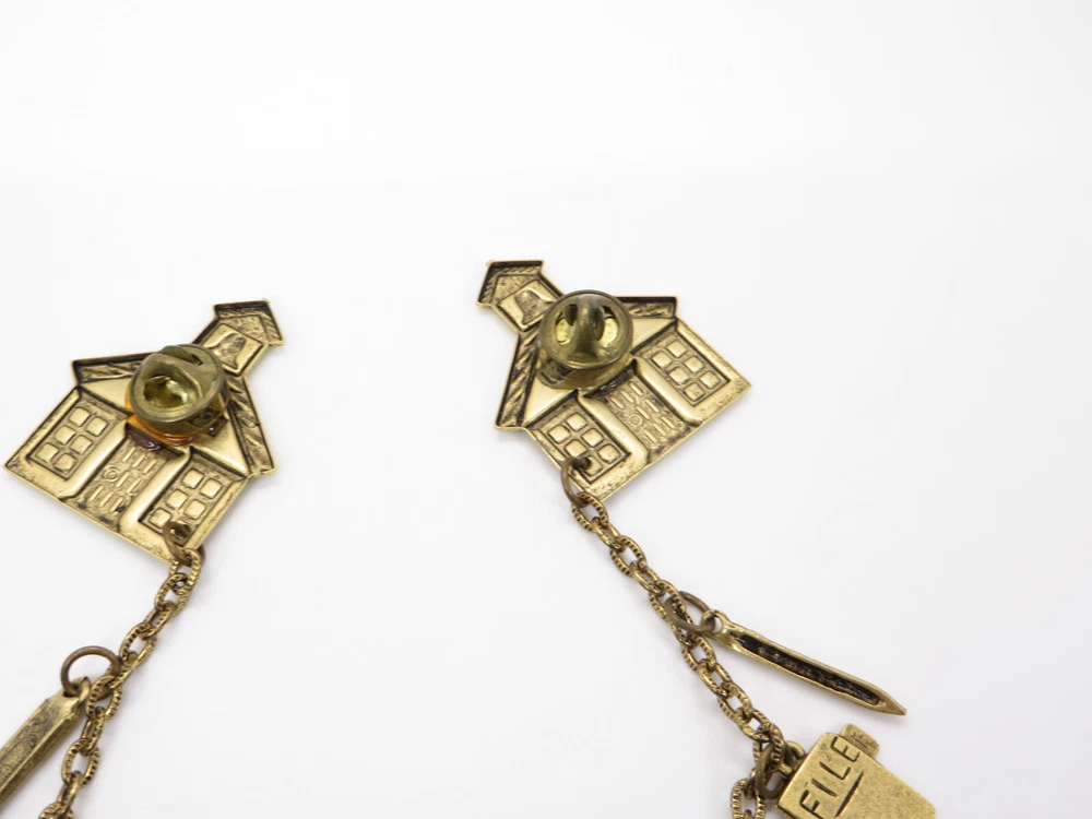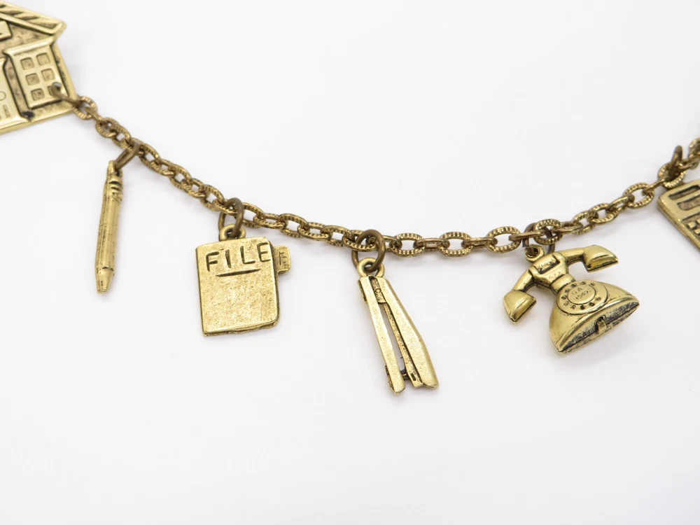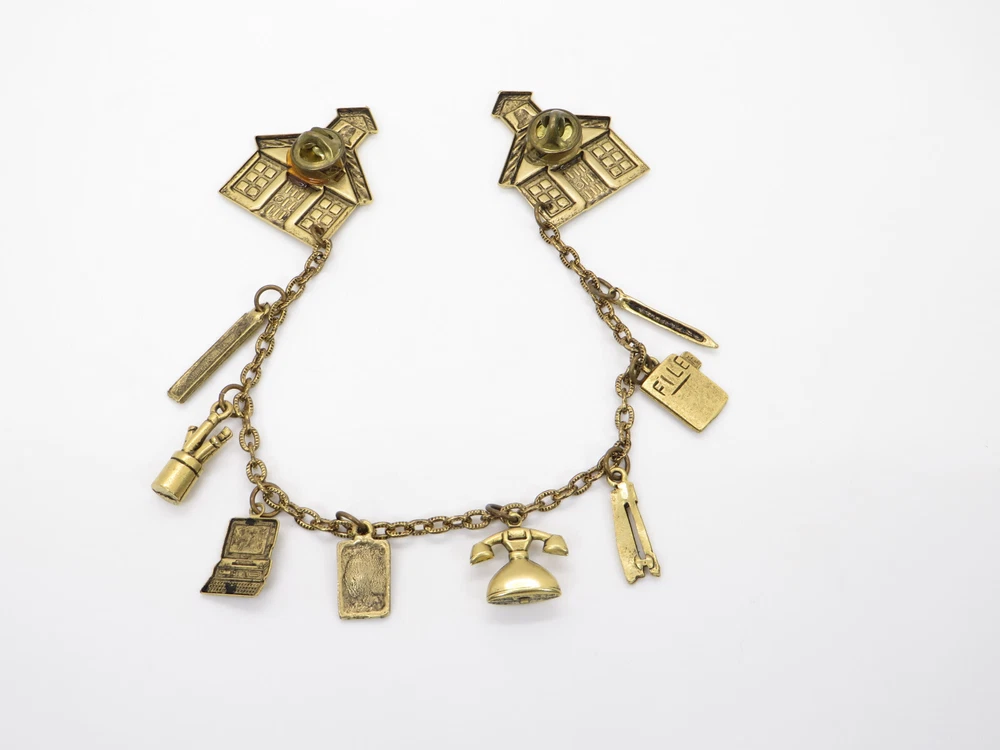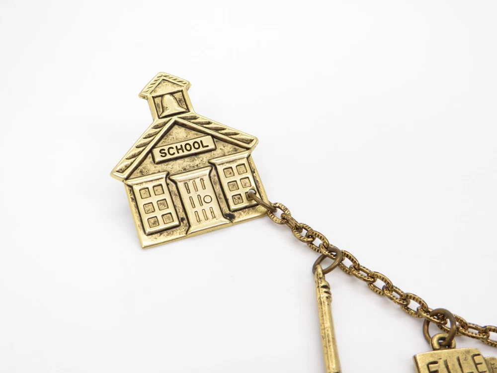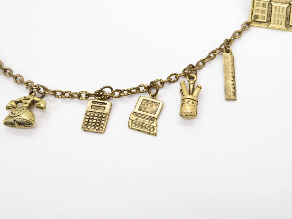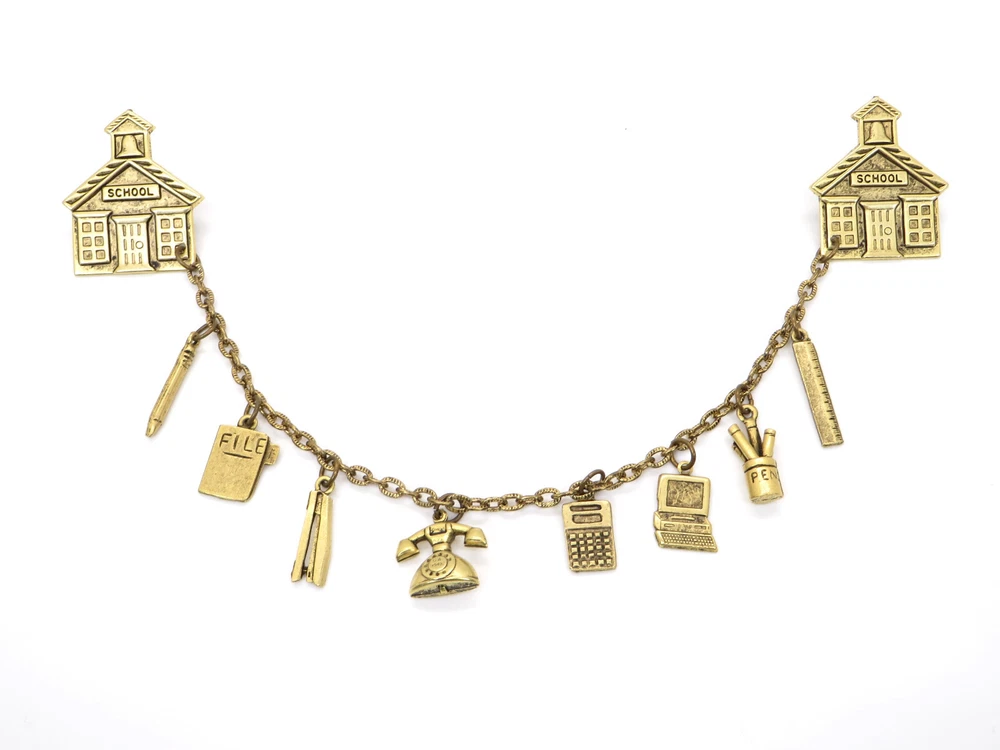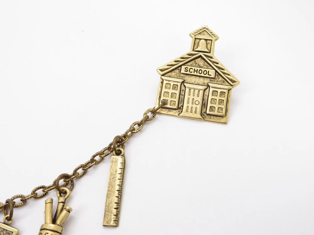 This is a very unique item that I have never seen before. It is a charm chain but instead of being a bracelet, each end is a pin/brooch! Each of the school house pins is connected to the chain to create a 10" long charm chain that could be worn, or tacked to a cork board! It could also be used possibly as a tie chain as well. The charms on the chain are very neat and include a pencil, file folder, stapler, phone, calculator, computer, pencil holder, and ruler. Each end is a pin in the shape of a school house. I believe everything is made of brass.