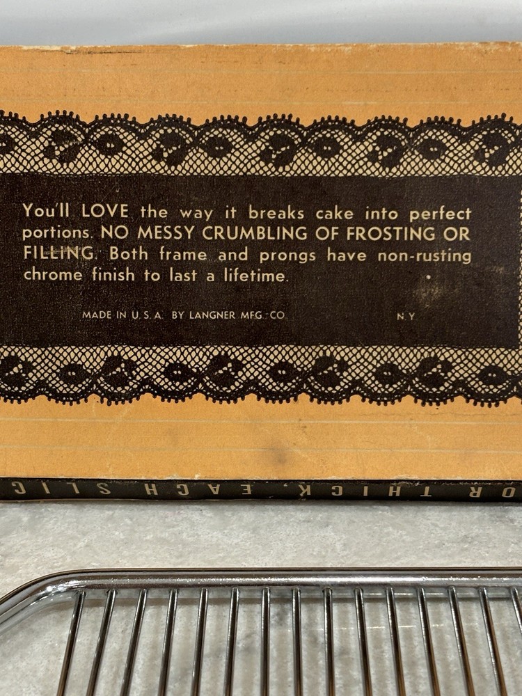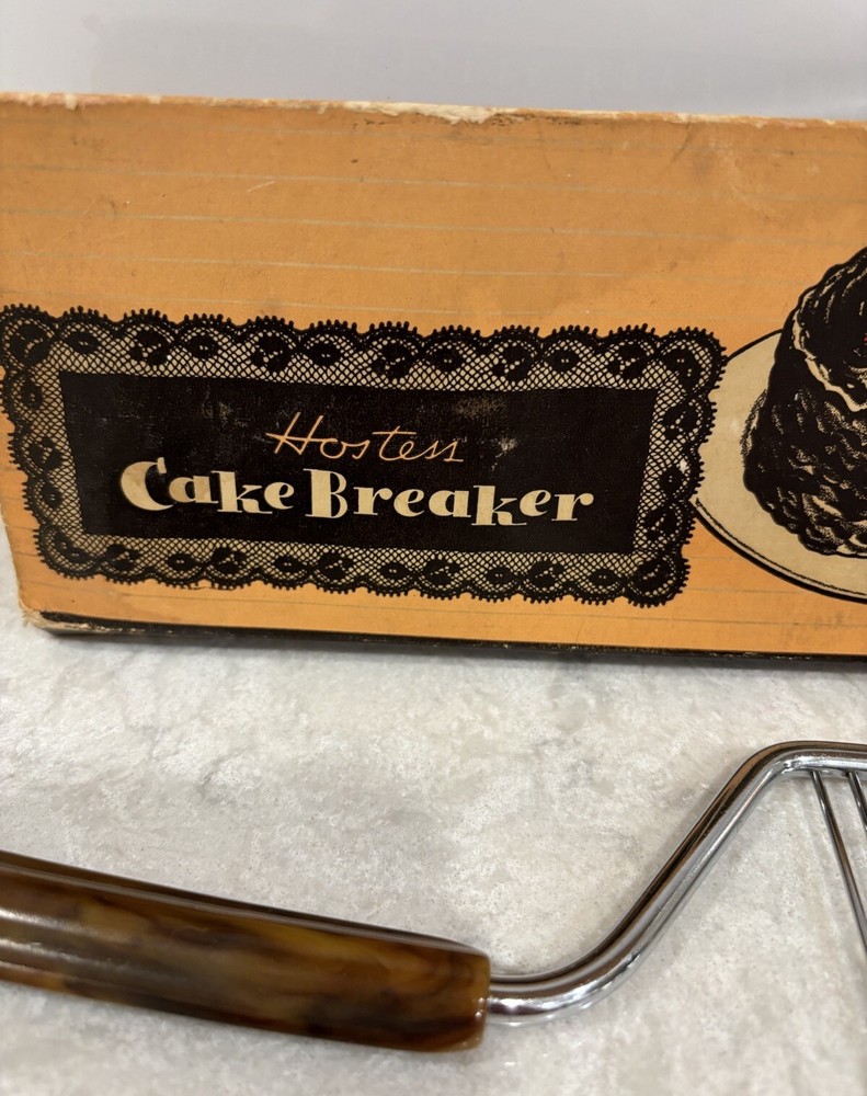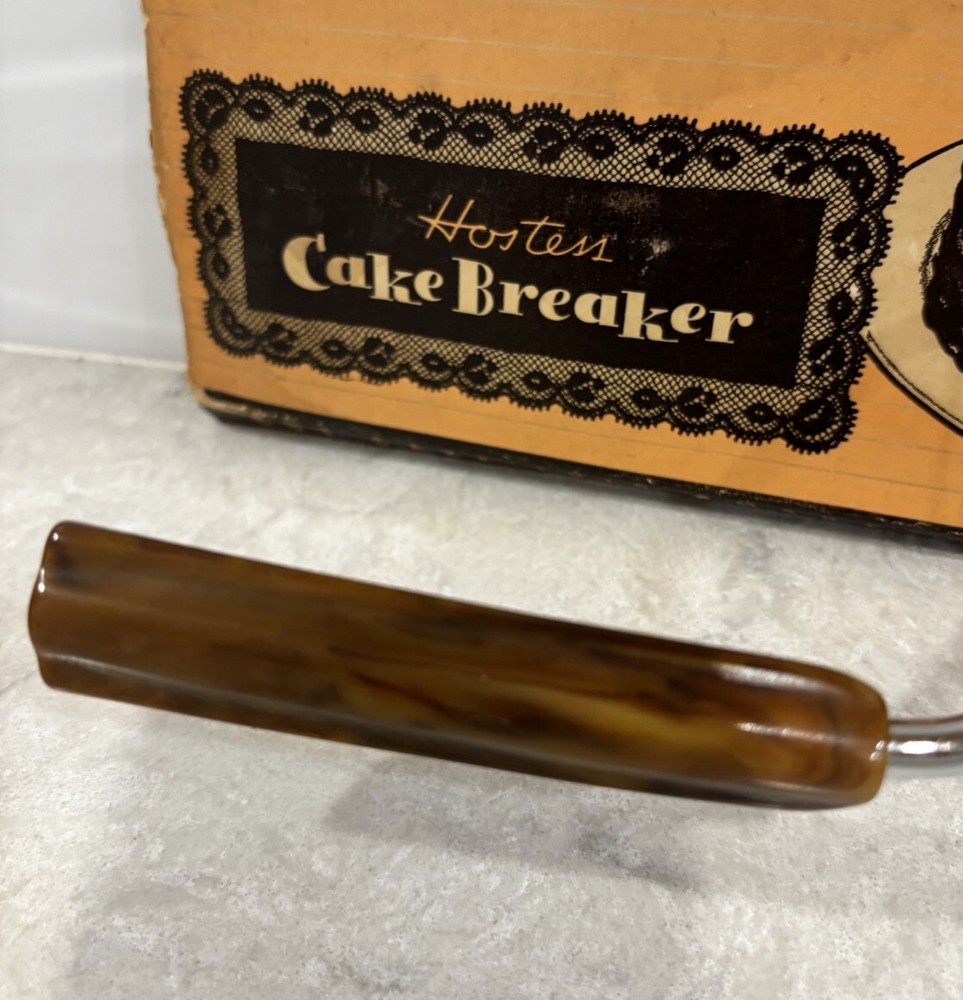 Vintage Hostess Cake Breaker with brown bakelite handle. Made in USA. Langner Manufacturing Company. Measures approximately 10” in length. Original box. Box has some damage from aging. Preowned. Good condition for its age.
