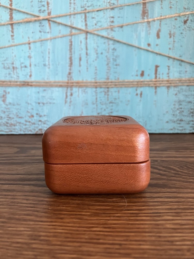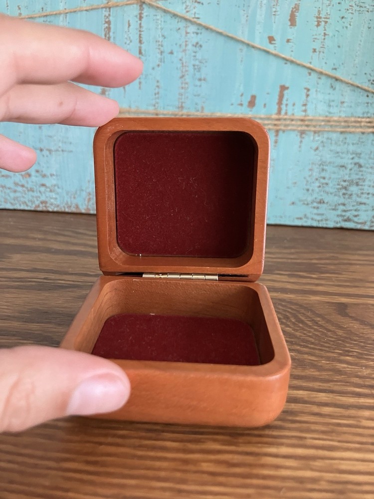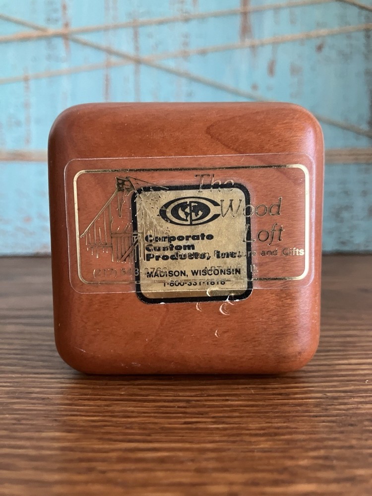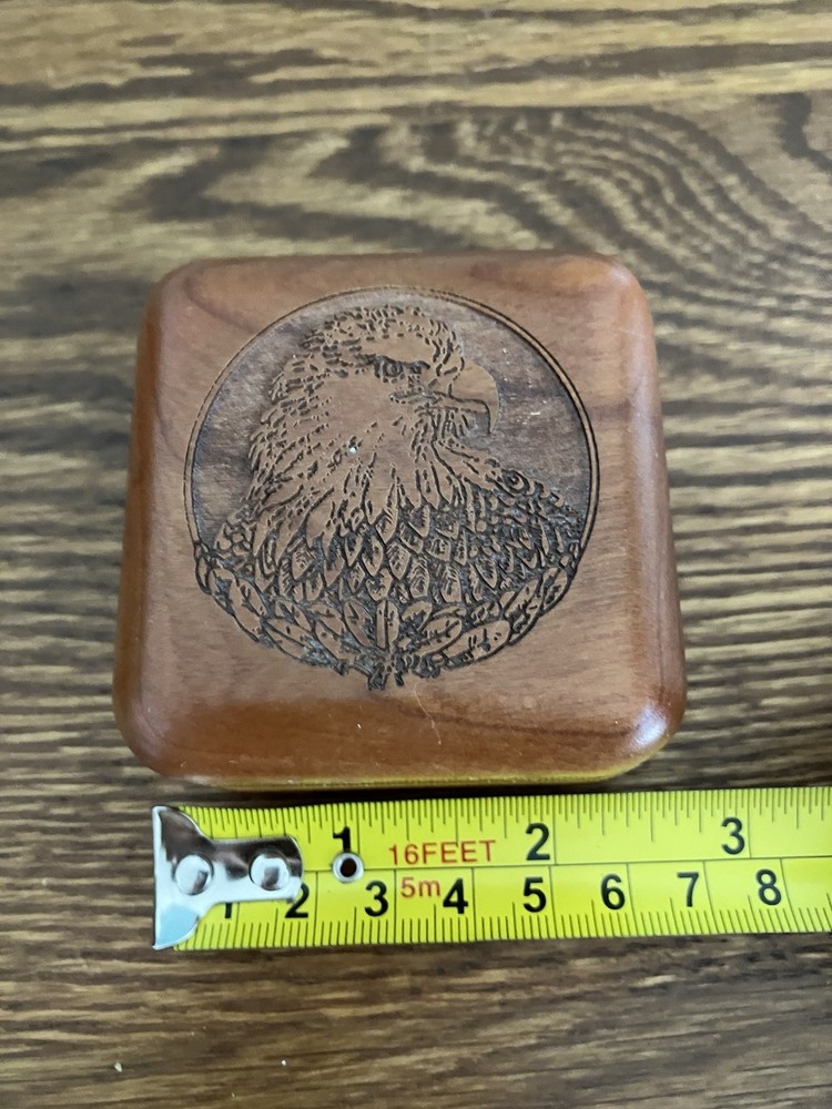 This vintage wood trinket jewelry box features a beautiful humming bird pattern and a bald eagle design with an American flag background. The square shape and small size make it perfect for storing your precious jewelry and keepsakes. Crafted by Corporate Custom Products in the United States, this original piece is not handmade and is not a reproduction. The finish is unknown, but the box is in excellent condition.