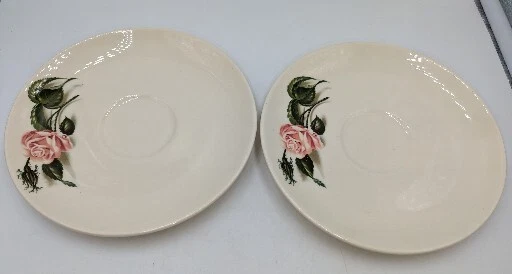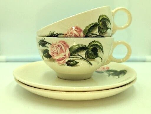Vintage Ballerina Moss Rose Coffee Tea Cup & Saucer Set of 2 by Universal 1950's. Very nice pre-owned condition with no damage, not even a scratch. These cups and saucers are just adorable and very 1950's. The underside of the plate is stamped "Universal Oven Proof Union Made USA" with a picture of a ballerina and the word Ballerina printed over the figure. It looks like it is stamped in platinum. They look to be a 6-8 ounce cup. All of my items are carefully packed for shipping, no matter their value - $5 items are wrapped with the same care as a $200 item. My goal is to have your purchase arrive safely. I use recycled packaging when possible but mostly use new, high quality products so your item will arrive intact without damage. Large, heavy and fragile items are harder to use combined shipping with but just ask if you would like to purchase more than one item and I am more than happy to do so if feasible. If not, maybe we can work out a shipping discount. Thank you and hopefully you will visit my store again!