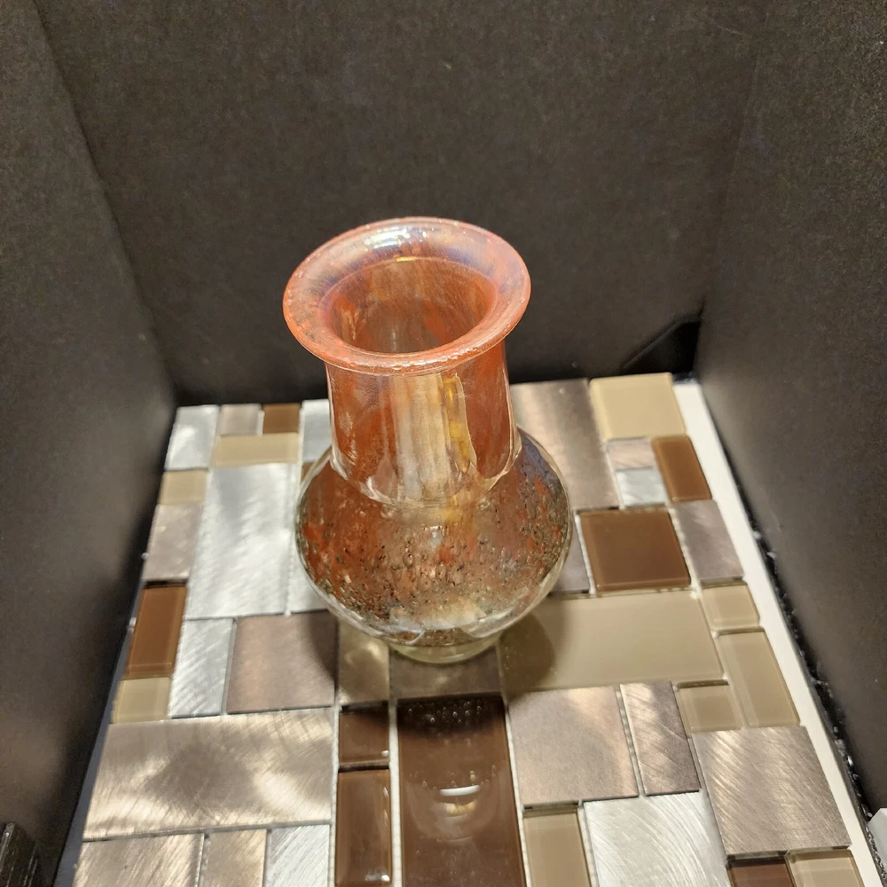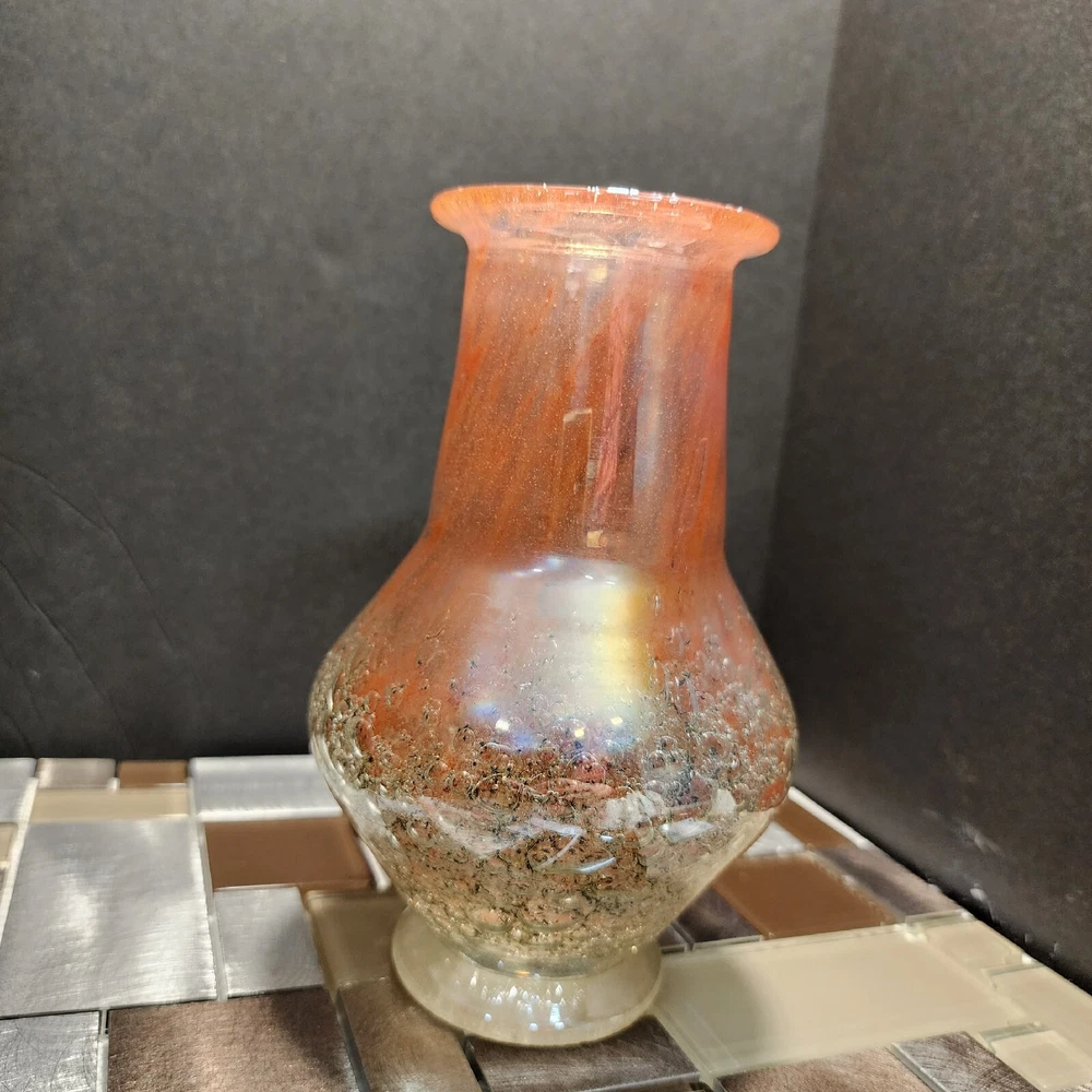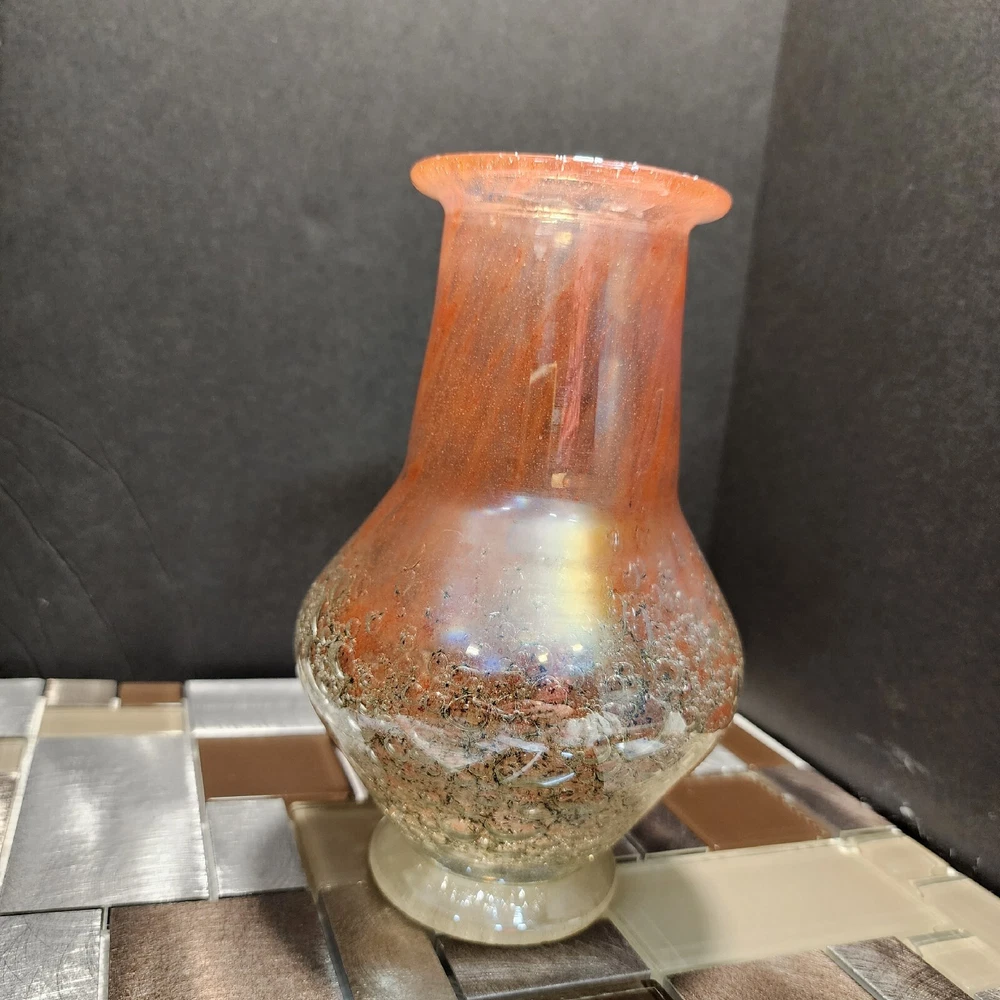 This vintage Luminarc vase is a beautiful addition to any collection. The swirl pattern and iridescent pink/peach color make it a unique and eye-catching piece. Measuring at 7 inches in height and 8 inches in length, it's the perfect size for displaying flowers or other decorative items. Made of high-quality crystal, this vase is both delicate and durable. Its antique charm is sure to impress any guest. Whether you're a collector or just looking for a charming vase to add to your home decor, this piece is sure to delight.