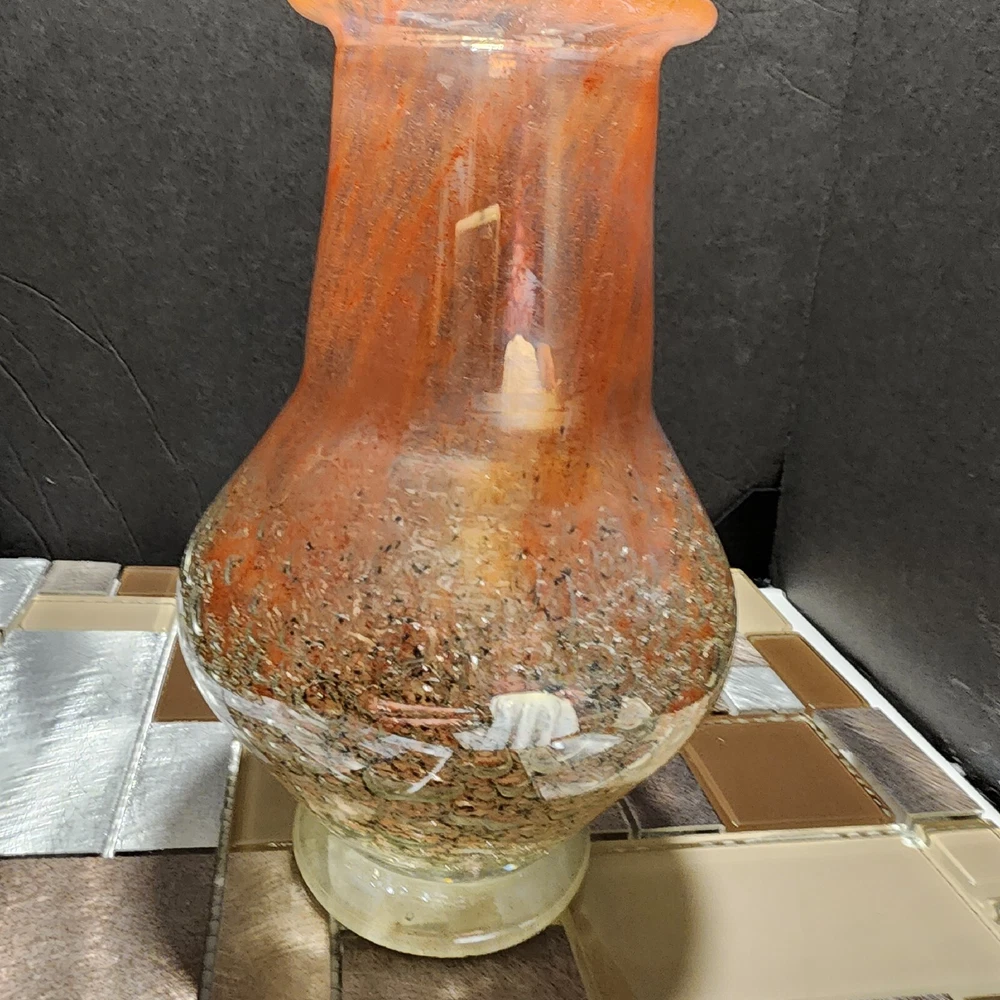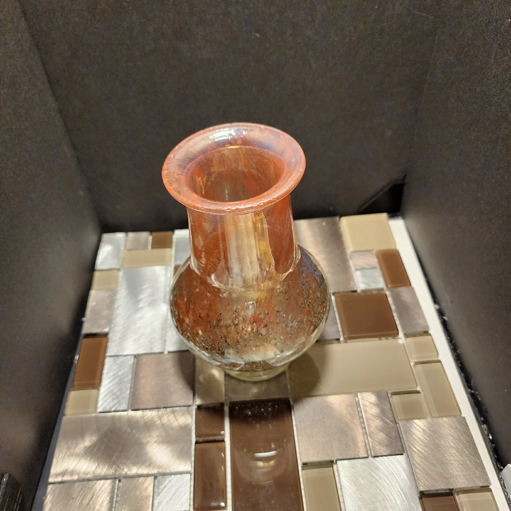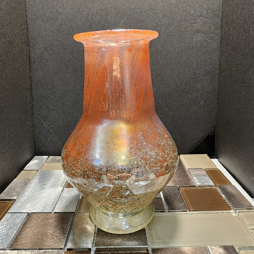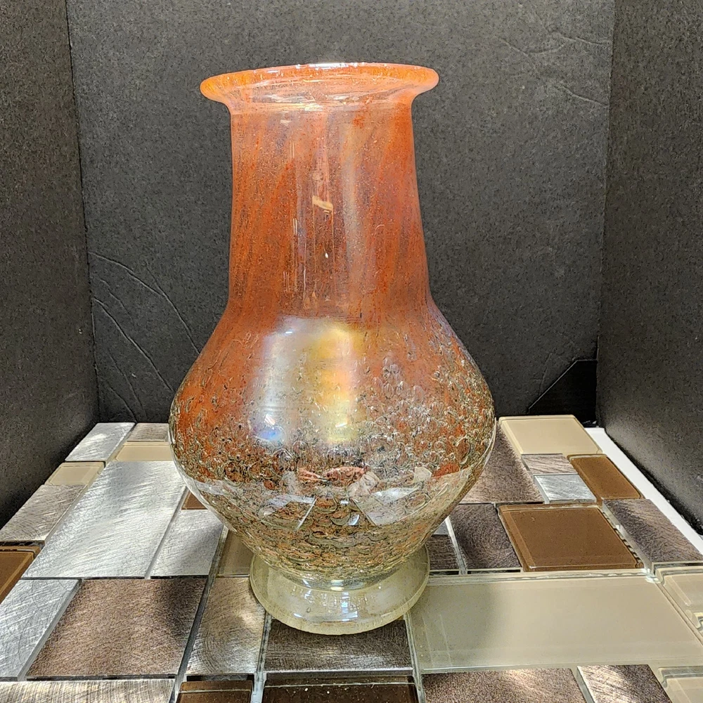 This vintage Luminarc vase is a beautiful addition to any collection. The swirl pattern and iridescent pink/peach color make it a unique and eye-catching piece. Measuring at 7 inches in height and 8 inches in length, it's the perfect size for displaying flowers or other decorative items. Made of high-quality crystal, this vase is both delicate and durable. Its antique charm is sure to impress any guest. Whether you're a collector or just looking for a charming vase to add to your home decor, this piece is sure to delight.