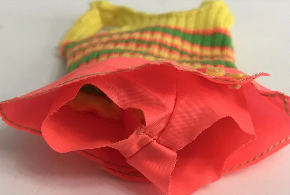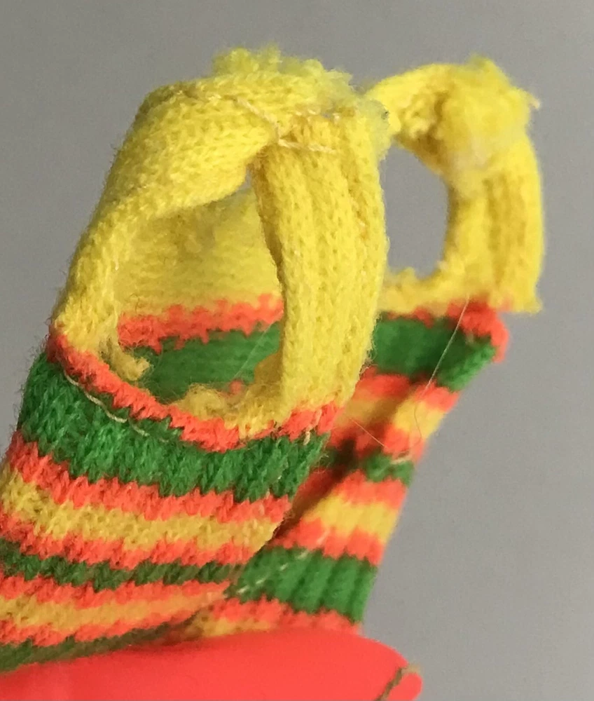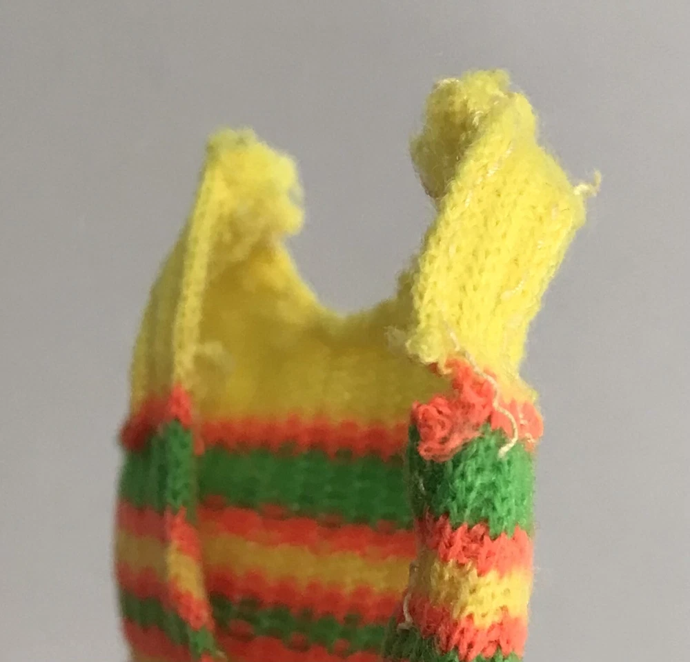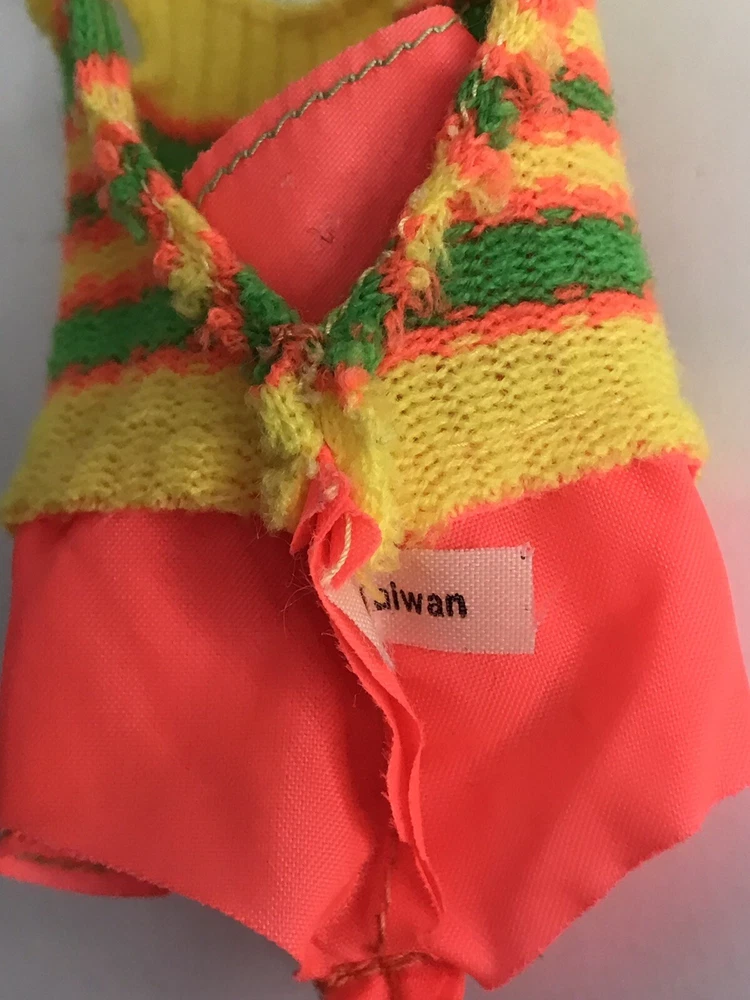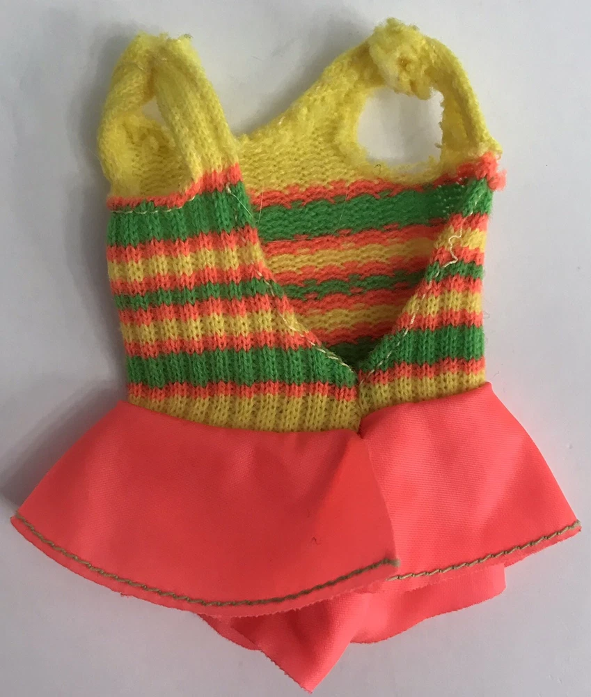Vintage Barbie Doll Friend 1969 Skipper Pose And Play Living Fluff Bathing Suit The swimsuit has great vibrant colors. The sweater material has some wear on the left shoulder and the right shoulder blade area. Please see photos for details.