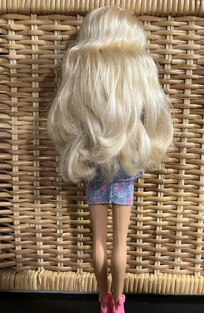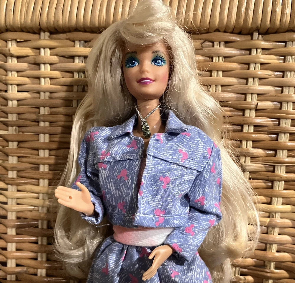 Add a unique and charming touch to your Barbie collection with this vintage doll dressed in a denim-style skirt and jacket adorned with pink Mickey ears. This lovely doll has been lovingly cared for and will make a wonderful addition to your collection. The outfit showcases the beautiful pink color, making it perfect for fans and collectors of all ages. This Barbie doll is sure to bring joy and happiness to any enthusiast's collection. OVERALL CLEAN MINIMAL PLAY WEAR SEE PHOTOS FOR DETAILS AND DESCRIPTION