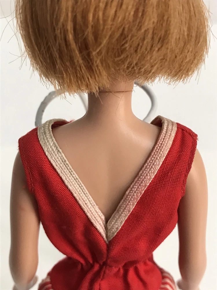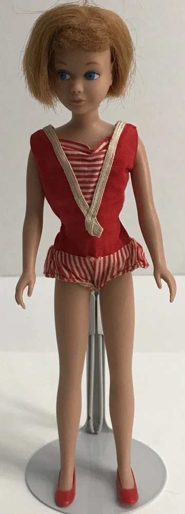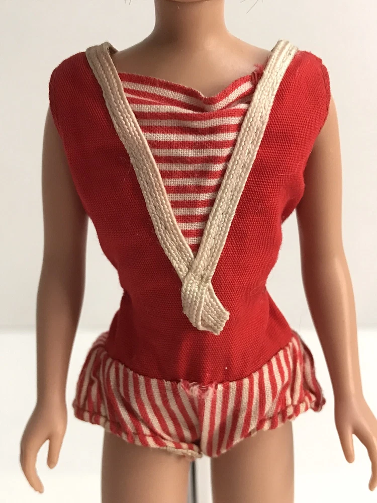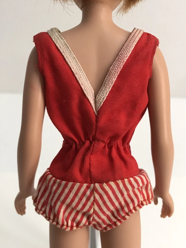 Vintage Barbie SKIPPER DOLL # 950 Red White Stripe SWIMSUIT & SHOES ONLY No Doll The doll and stand are not included. The swimsuit has some discoloration. Please see photos for details.