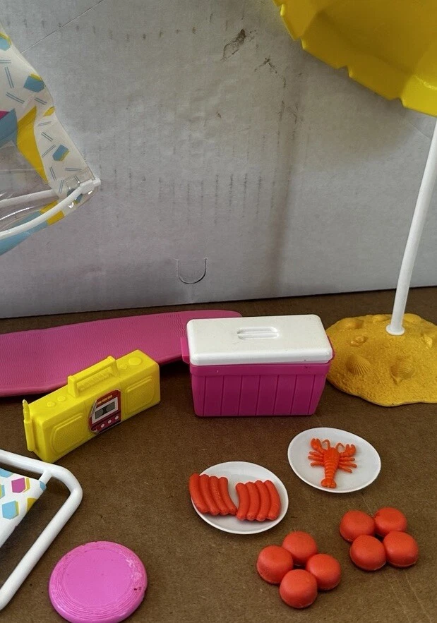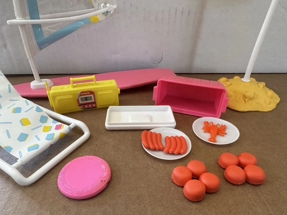 Some minor wear, see photos Frisbee has some wear and marks This vintage Barbie and Skipper Beach Party Playset #7332 by Mattel, manufactured in 1987, is a collector's dream. With several pieces, including both dolls, this original set is perfect for any occasion, especially parties. The set features outdoor adventure and requires adult assembly. The dolls are 11 inches in size and are gender-neutral. The packaging is not included, but the set is in great condition. This Barbie and Skipper set is perfect for anyone who loves Barbie and Skipper and wants to add to their collection.