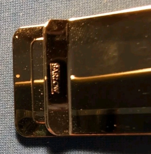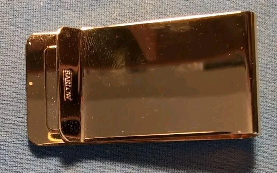 This Vintage Barlow Gold-tone Money Clip features a faux scrimshaw design with golfers on green with caddy on a green. The slim fold clip is made of gold tone metal and measures 2" in length and 1" in width. It comes in a box case and carries a vintage aesthetic, perfect for golf enthusiasts. The money clip is accented with a logo and is a unique accessory for men who appreciate nature and golf themes. Made in the United States, this item is a stylish and functional addition to any man's accessories collection. See scans to help see the condition. Never used.