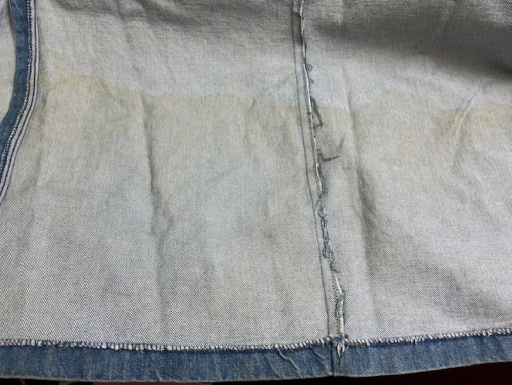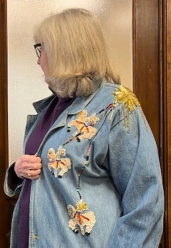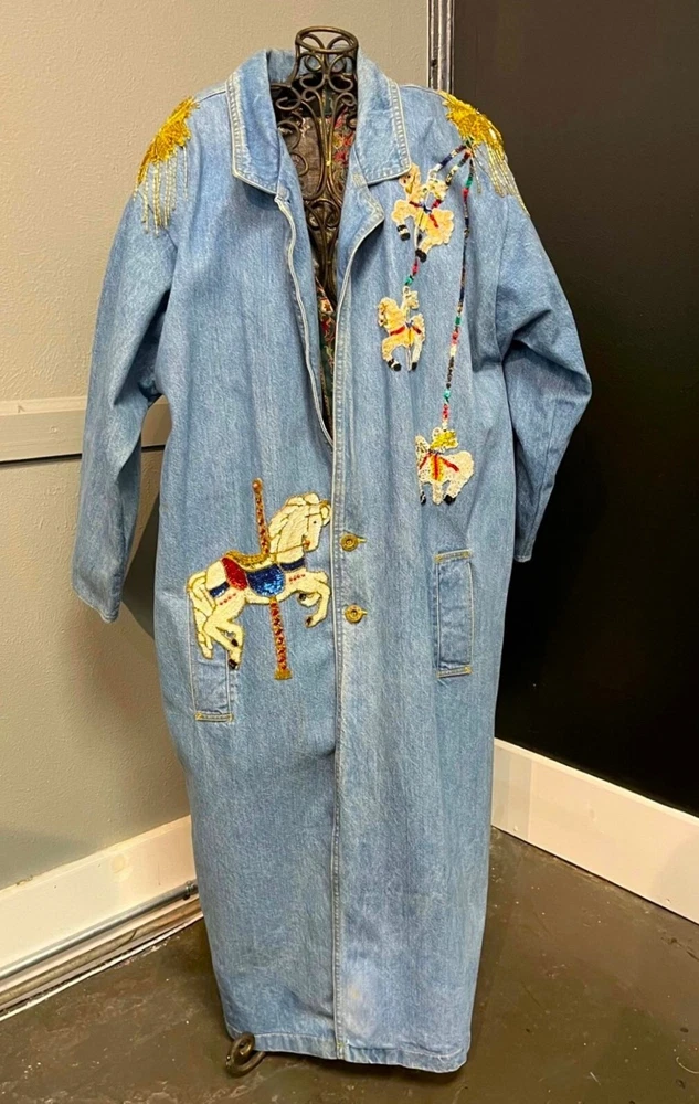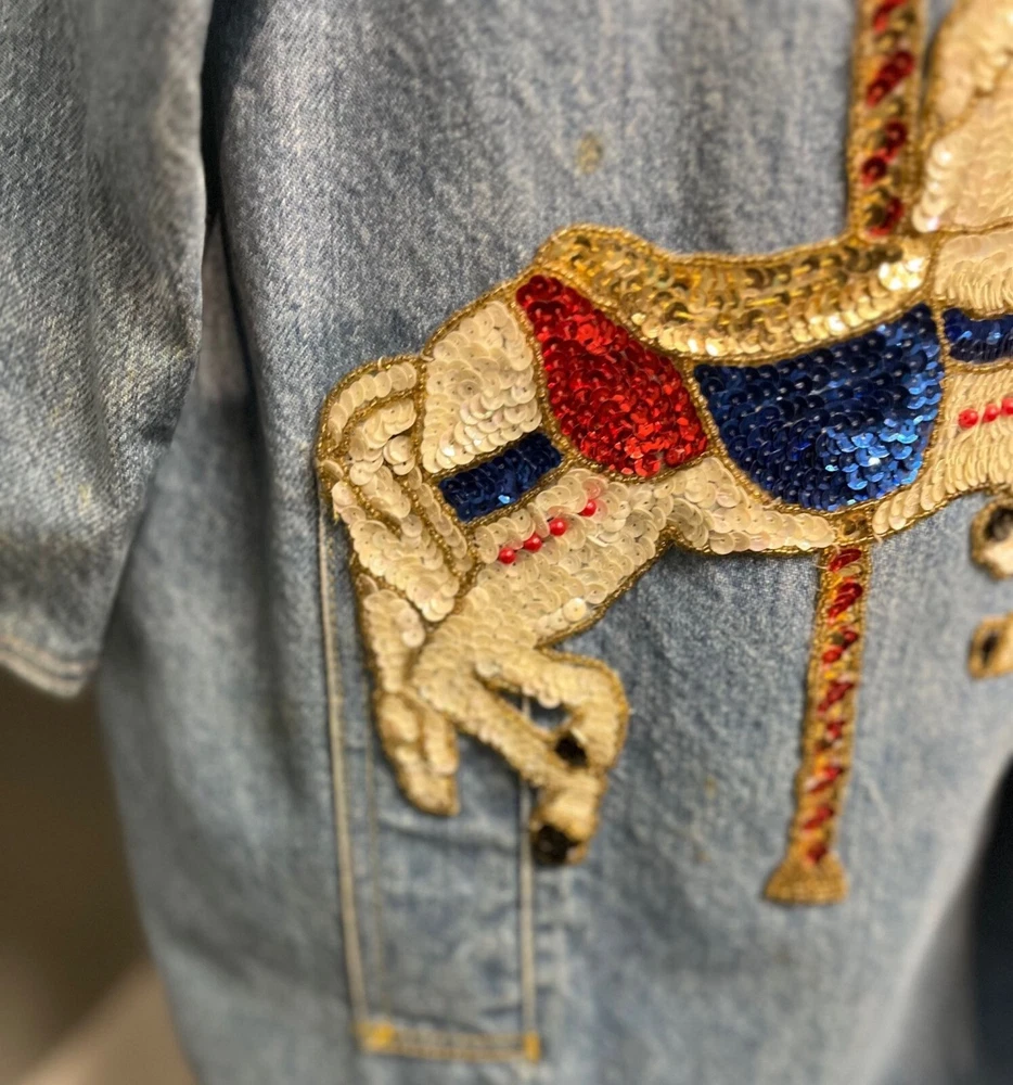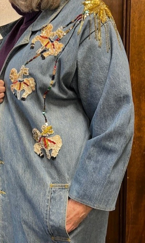 This vintage barn coat/duster is a must-have for those who like the unusual or a statement piece. The blue denim material is accented with 8 large carousel horse sequin patches and shoulder epaulets, making it a unique addition to your wardrobe. The coat is designed with a long length and XL size, providing a comfortable and relaxed fit. There are 2 side pockets and 2 gold buttons. Sequin colors include red, blue, gold and white. Measurements: shoulder to sleeve tip is 21", shoulder seam to hem is 51", armpits across the back is 25.5", neck is 23", and a back slit is 19". The garment has been washed, but there are still traces of stains. See photos. The inside appears to have gotten wet across the lower part, but it does not show at all on the front. Perhaps the barn chores account for this before it was converted to a fancier garment! The estate always had show horses.