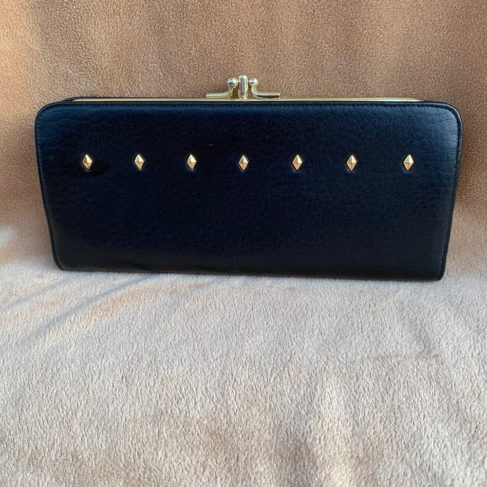 Vintage Baronet Wallet Navy with brass clasps & diamond-shaped studs Double clasp center has clear plastic divider, 2 full-length slots on either side Exterior has no notable flaws, interior has wear at gold in the middle - see photos & feel free to contact me with questions