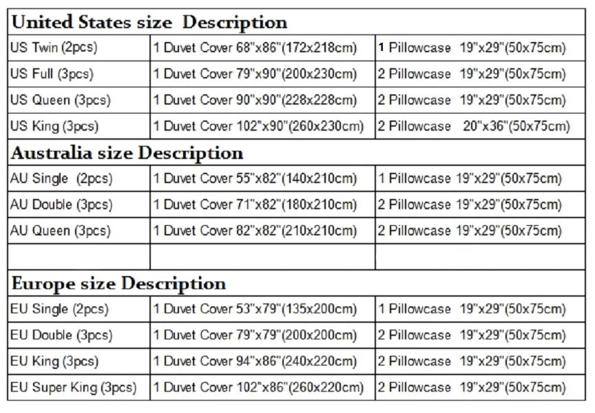 Store Categories Store Categories Other Vintage Baroque Print Bedding Set Duvet Cover Pillowcase Comforter Home Decor Product Description Please note: This is duvet cover set . Not comforter. This product is without comforter/quilt/duvet filling! Size:Twin: (2 Pieces)1 x Duvet Cover Set: 172x218cm1 x Pillowcase: 50x75cm Full: (3 Pieces)1 x Duvet Cover Set: 200x229cm2 x Pillowcases: 50x75cm Queen: (3 Pieces)1 x Duvet Cover Set: 228x228cm2 x Pillowcases: 50x75cm King: (3 Pieces)1 x Duvet Cover Set: 259x229cm2 x Pillowcases: 51x91cm US-CAL-King: (3 Pieces) :1 x Duvet Cover Set: 239*264cm 2 x Pillowcases: 51x91cm quilt cover: High quality ~ in stock ~ fast delivery With the tap of a finger, you can refresh your bedroom at any time of the year! Let life begin with our interesting decorations! Quality: high-quality polyester, durable, soft and comfortable This bedding set includes a Duvet Cover, 1 or 2pcs pillowcases. The material is 100% high quality polycotton. The fabric is very soft and comfortable to the touch, can help you create a warm and cozy sleeping environment. Payment Policy Shipping Policy Returns Policy Payment Policy We accept PayPal payment ONLY, it is easy and safe. Payment should be sent within 7 (SEVEN) days of auction closing. All winning bidders whom won our item, please let me know your contact number after you made the full payment , we need this number to make sure you can receive your item in time, and also for emergency contact consideration. Shipping Policy Shipping Method: Generally speaking, you will receive your package in about 15 working days (20 at most) by E-packet shipping(Weather and Customs reasons caused the delays not included) Note: We can offer the tracking number for you to check the status of your item after we deliver the item. For international shipping, customs duties might be possible for some countries, they are buyers' responsibility. S&H charged dose not include any those fees. We are not responsibility for the delay of clearance is the buyer's country, but we will help to clear as suppling some files. If the item is in customs or post office for some days, pls contact with local customs actively, otherwise, if the item returns to us, the buyer will pay for the shipping fee for resend or refund except the shipping fee. 1. International Shipping to worldwide. . 2. Tracking Number of your parcel is available. 3. Returns could be accepted within 14 days after receipt of the item. 4. Import duties, taxes and charges are not included in the item price or shipping charges. These charges are the buyer’s responsibility. Please check with your country’s customs office to determine what these additional costs will be prior to bidding/buying Returns Policy Refund or replacement request is available only the requests within 1 week after parcel received & returning the item as the same condition as received. Please contact us to request a return authorization. Your name, auction number, and reason for return should be included in the email. All items returned must contain all original packaging materials.Please repack the item carefully. Items returned will be tested and a new replacement will be shipped to the buyer immediately when found defective. In the event that a suitable replacement is not available then a refund will be issued. Shipping, handling and insurance fees are non refundable. If the item is found non-defective, the item will be sent back to the buyer at buyer's expense. Items returned without RMA number will be refused and returned to the sender. Buyer is responsible for All Return Postage and Shipping Charges. Buyer is responsible for additional shipping costs for items that are returned refused and / or Undeliverable . We do not accept any returns without an authorization number on the box or label it is being returned. Copyright © 2021 Dianxiaomi