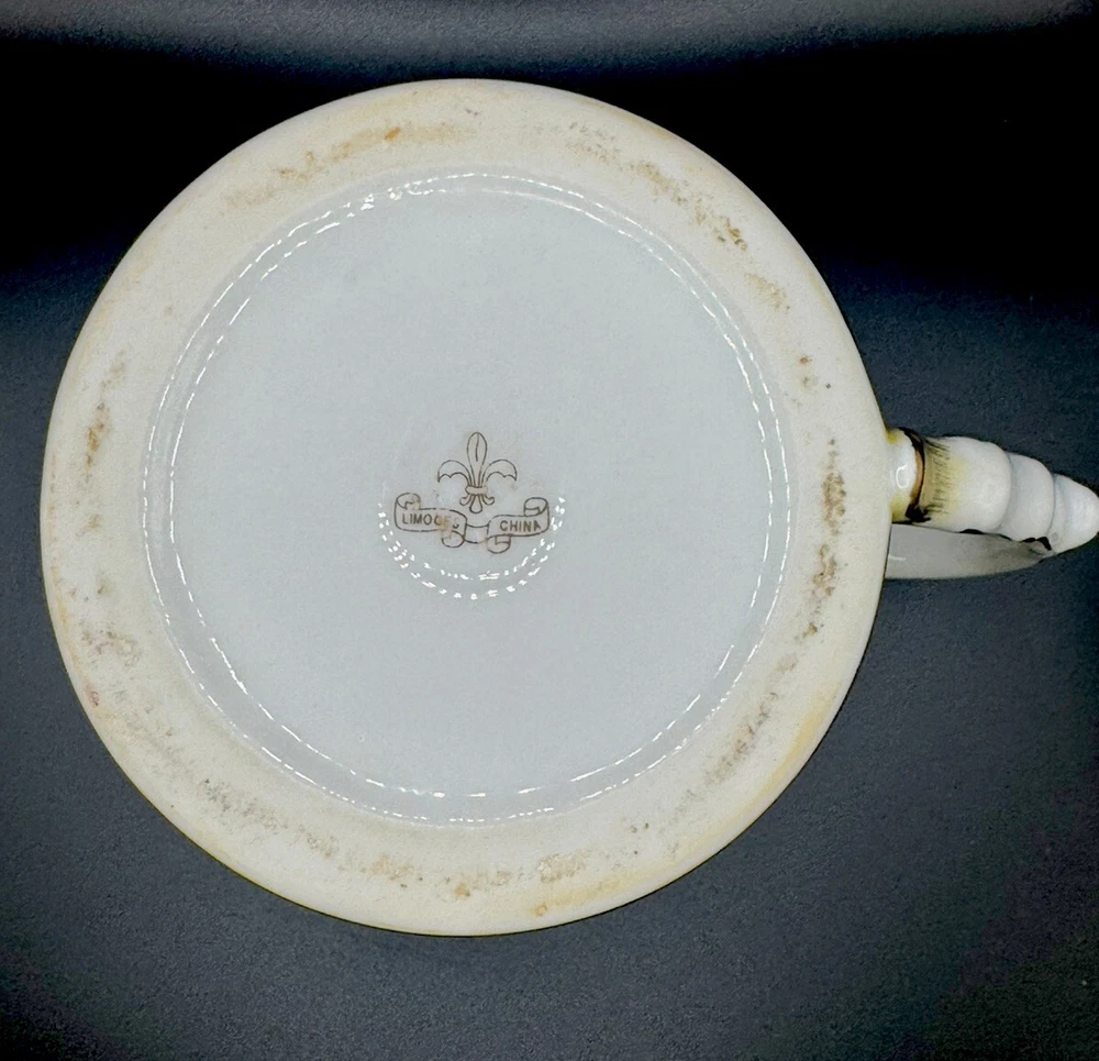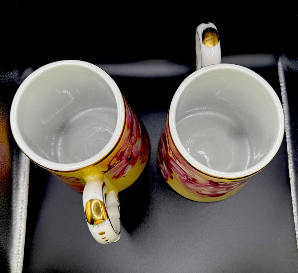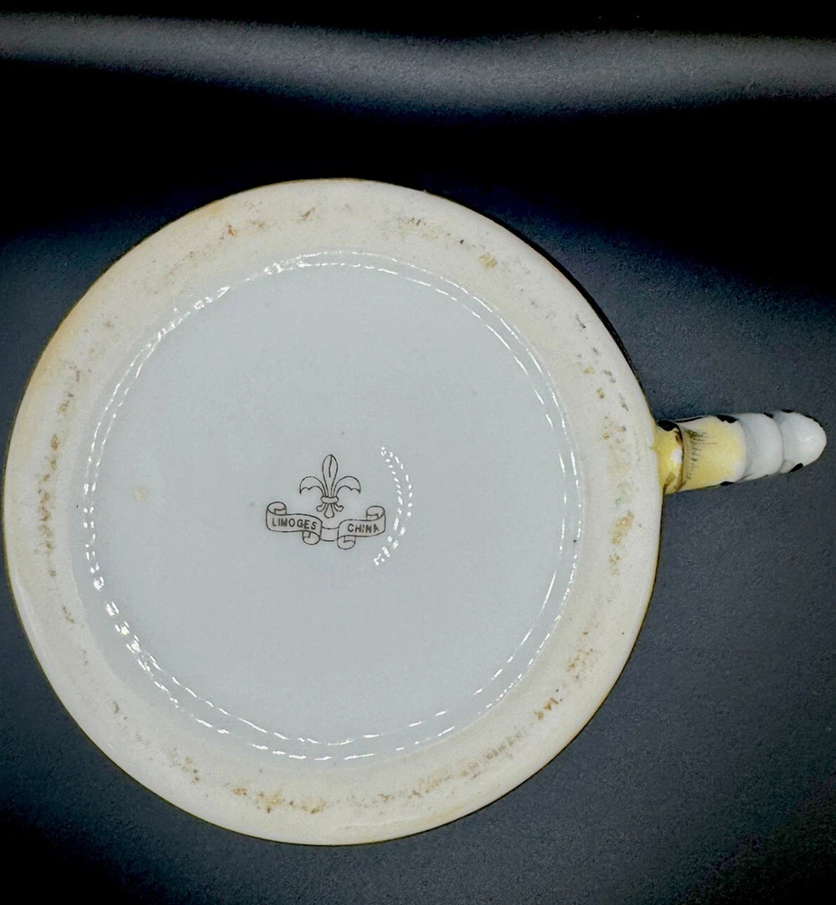 This vintage Limoges China mug set features a beautiful hand-painted design of yellow and pink grapes with gold accents. The two-piece set is made of porcelain in a matte finish, showcasing a capacity of 20 oz and an item height of 5 inches. The mugs are artfully crafted with a production style of art pottery, dating back to the 1980s. These mugs are a charming addition to any collection of decorative dinnerware. Perfect for a lovely Galentine’s or Valentine’s Day fun event!