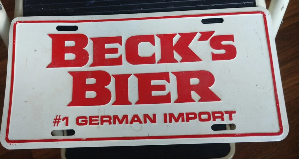 This vintage Beck's Beer License Plate is a must-have for any collector of automobilia. With its bold design and unique slogan, "#1 German Import", this license plate is sure to make a statement in your collection. The plate is perfect for displaying in a home bar or man cave, and its unknown country/region of manufacture only adds to its mysterious allure. The plate is in a used but well-maintained condition and has not been personalized in any way. Whether you are a fan of Beck's beer or simply appreciate vintage collectibles, this license plate is a fantastic addition to any collection. Don't miss out on the opportunity to own a piece of automotive history! See scans to help determine the condition.
