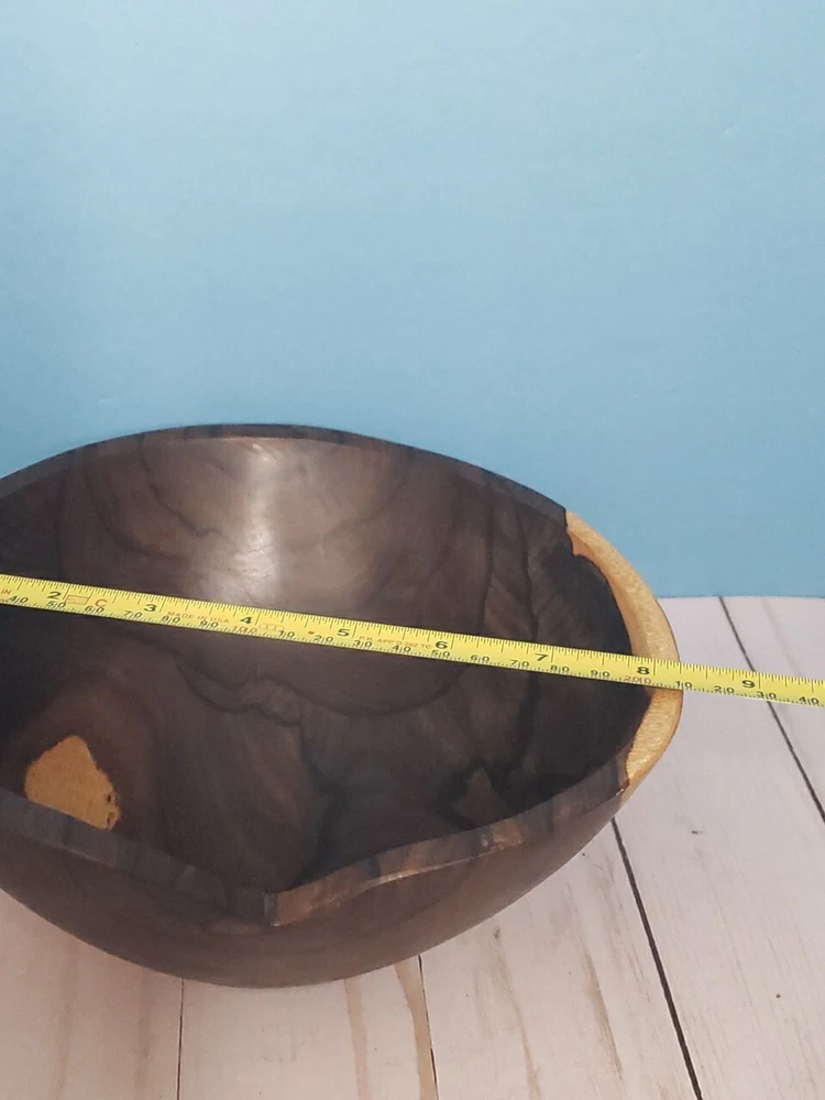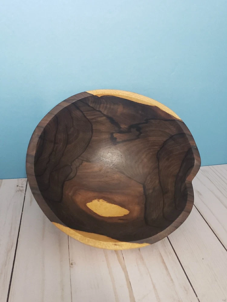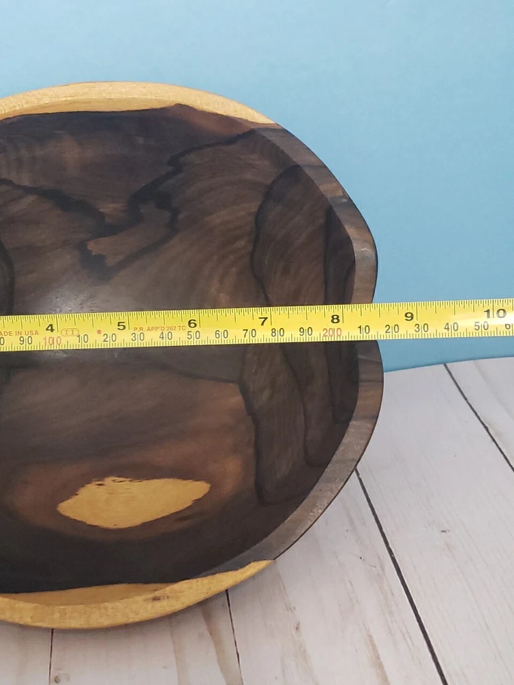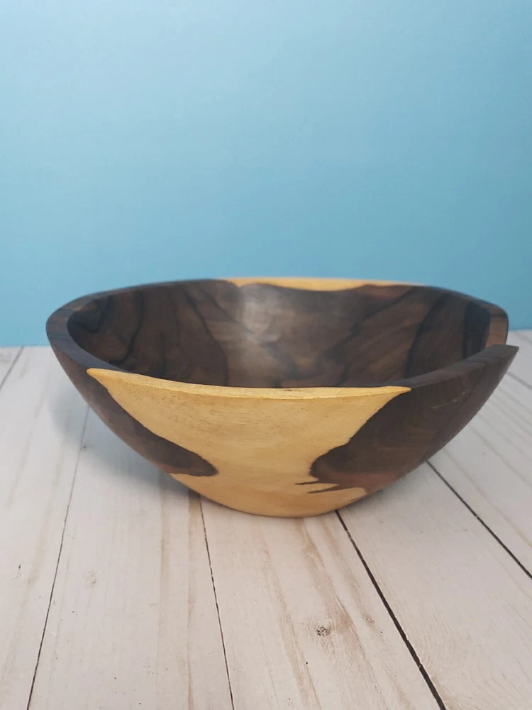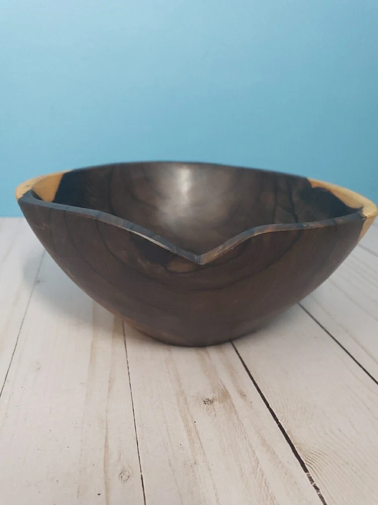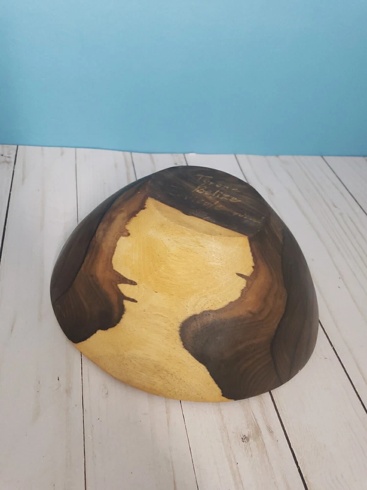 Vintage Belize Round Two-tone Ziricote Wood Bowl Hand Carved 8 1/2”x 8 1/2” Condition: pre-owned, see actual pics, bowl has carved cut on one side
