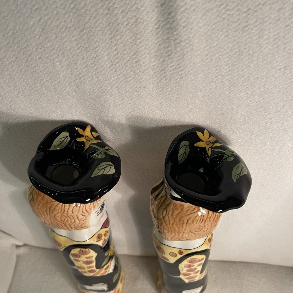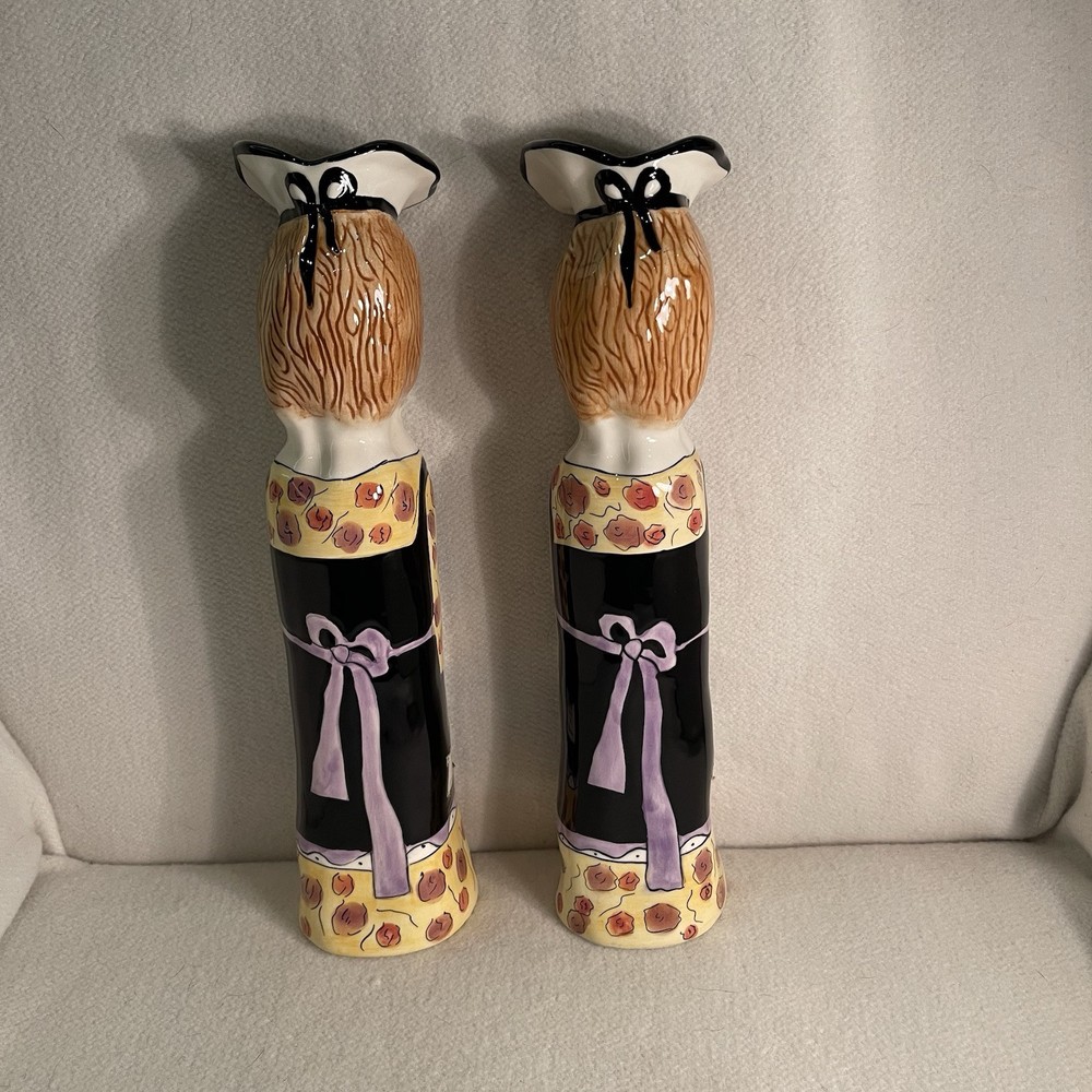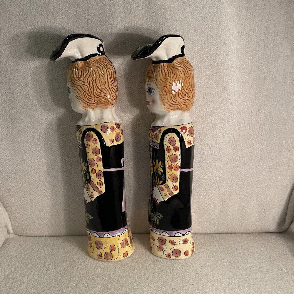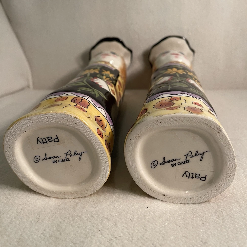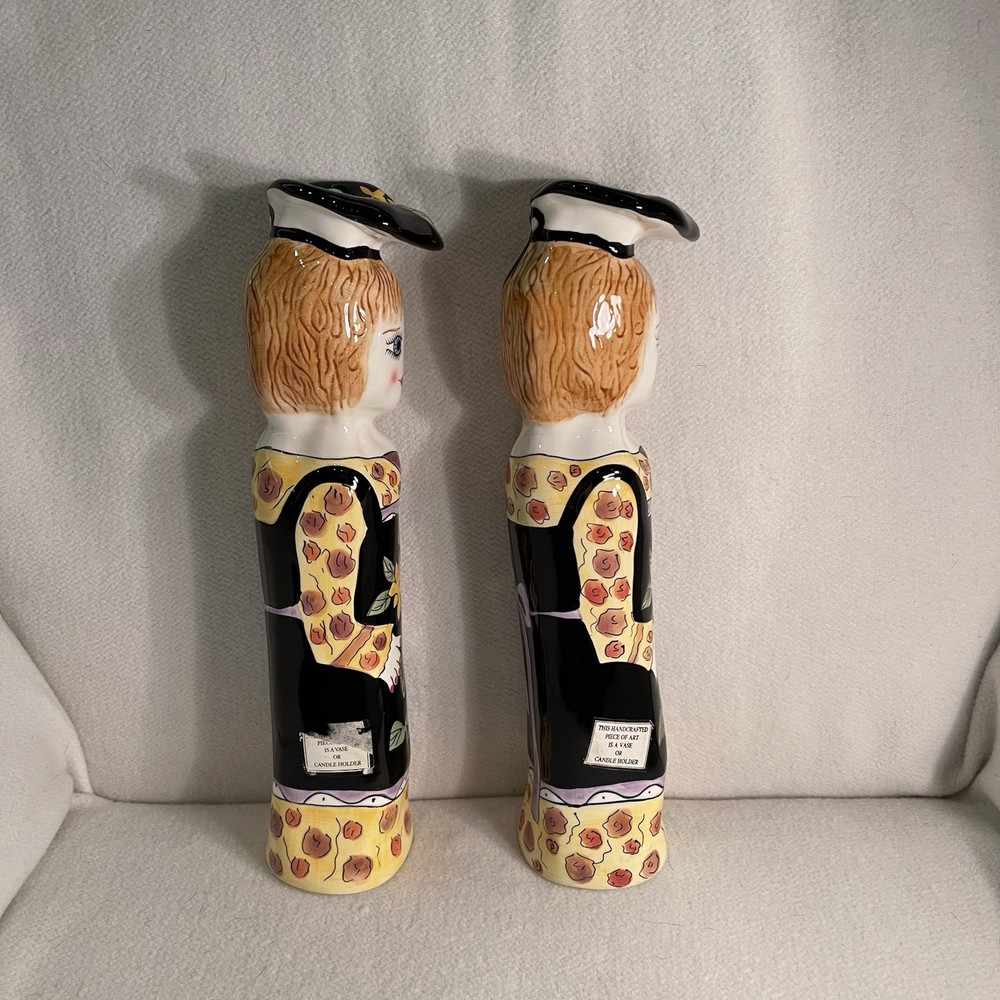 This vintage set includes two asymmetrical ceramic candle holders or vases from the Bella Casa collection by Susan Paley for Ganz. Each piece features a multicolor, hand-painted design depicting a girl named "Patty." The mid-century modernism style, standing at 11.5 inches tall, makes them suitable for tapers. These unique collectibles weigh a total of 2 lbs and were manufactured in the 1990s. Perfect for adding a touch of whimsy to your decor, these charming pieces are a delightful addition to any collection. Excellent condition. No chips or cracks.