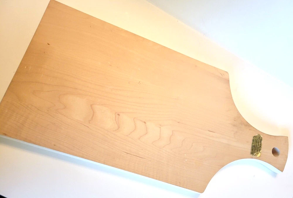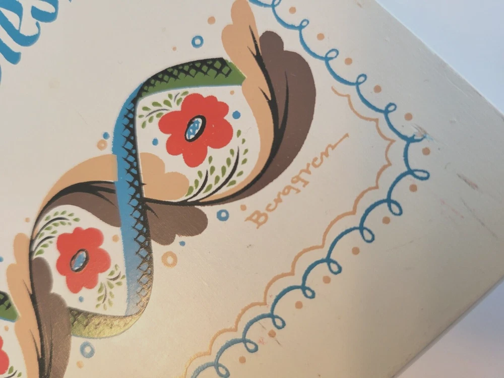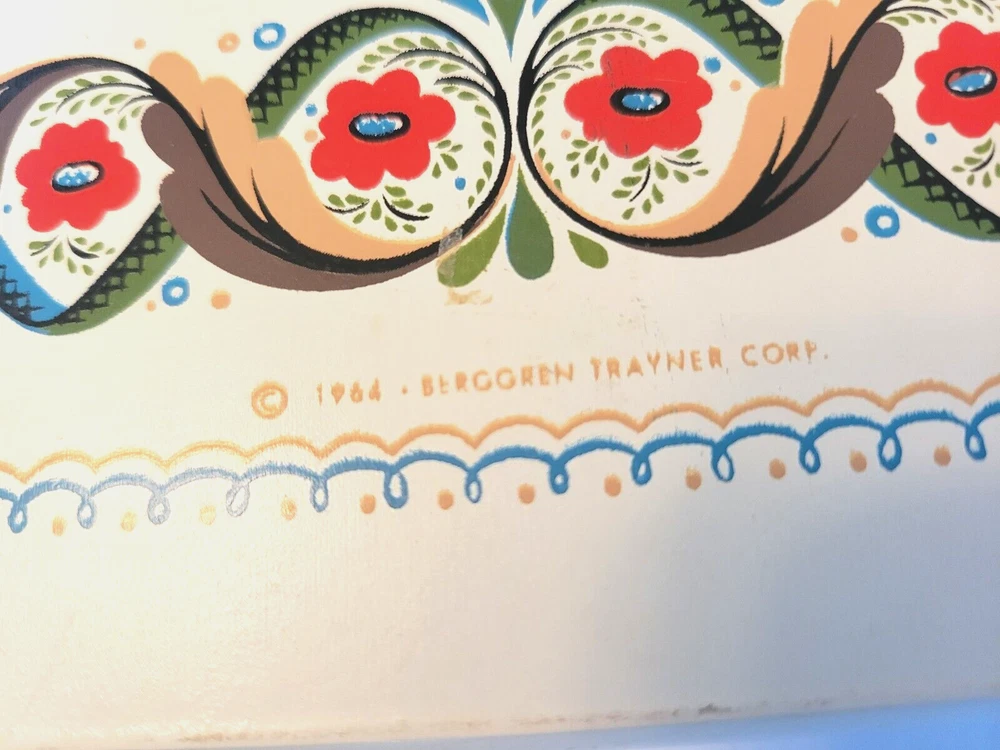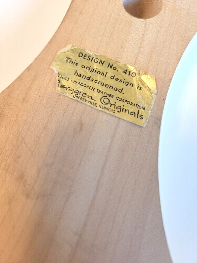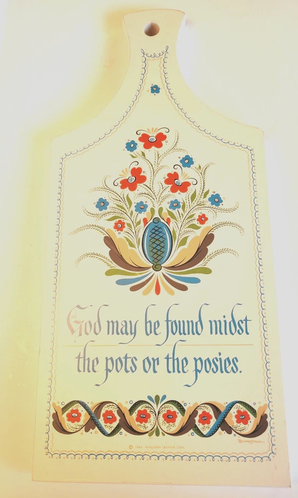 1964 Berggren-Trayner Scandinavian cutting board. White with floral painting. Reads "God May be Found Midst the Pots or the Posies". Board is 8" across and 17" long and 3/4" deep. There is a mark across the board that can only be seen at an angle in a particular light. You can not see it straight on and I was not able to capture it in a picture. It is not a gouge and cannot be felt. Aside from that, board is in very nice condition.