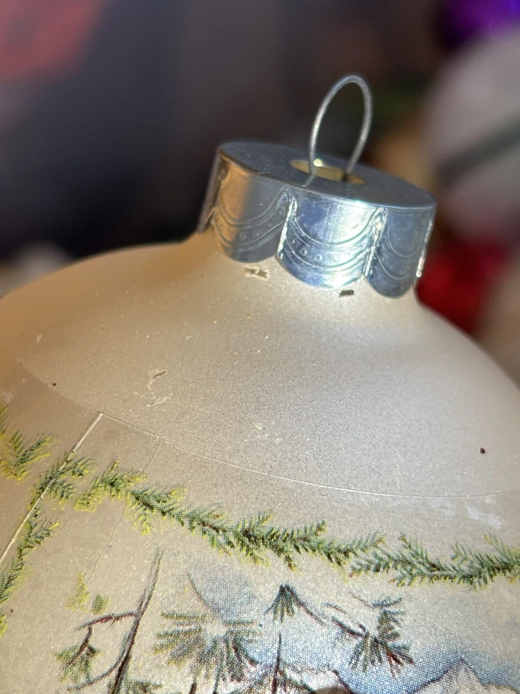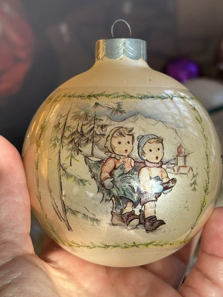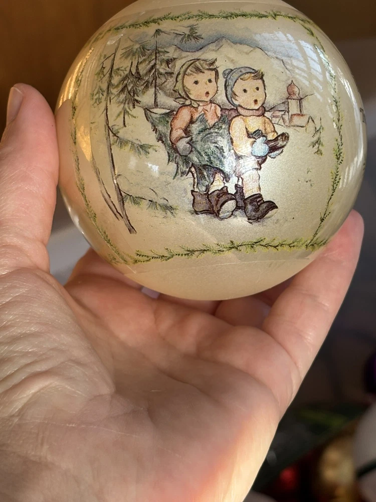 The product is a vintage Berta Hummel Christmas ball from 1997, featuring a tree shape and depicting "Tree Trimming Time." It is part of the collectibles category and would be a charming addition to any holiday ornament collection. The ball is designed with a nostalgic feel and is perfect for decorating a Christmas tree. Vintage ball, normal scuffs