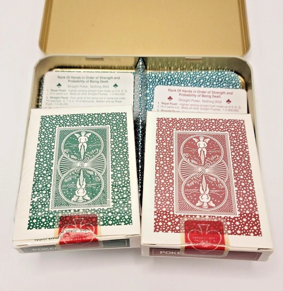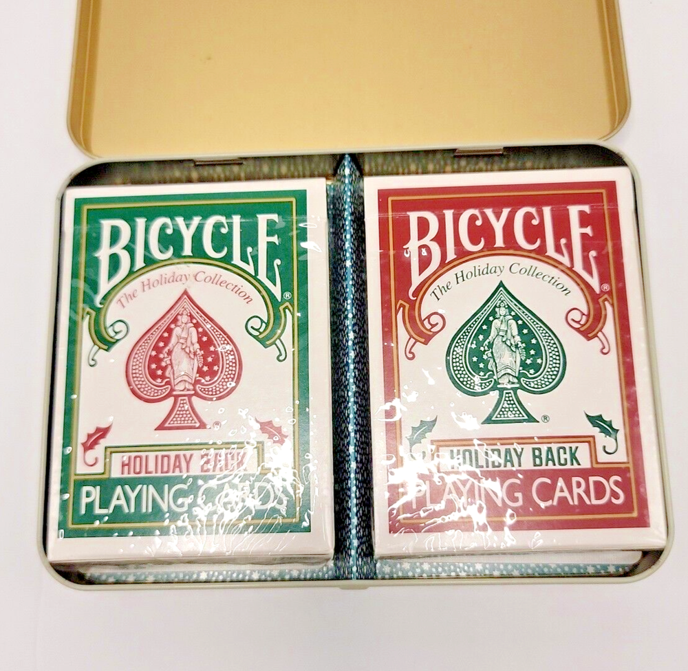 Vintage Two Pack Bicycle Playing Cards THE HOLIDAY COLLECTION in the Original Tin - Both packs have a new look in plastic. I counted all cards. Each deck has all cards + 2 jokers. They have no bent edges or stains. Look unused. The container they are in looks fine and measures 4 1/4" x 5 3/4" Shipped USPS Ground Advantage.