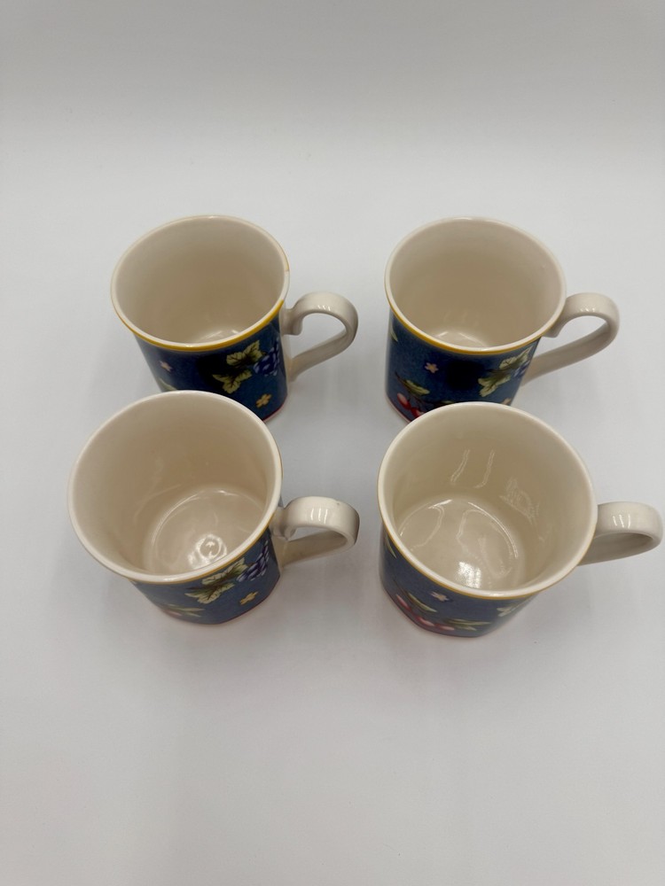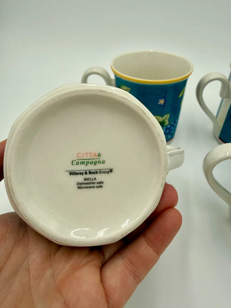 This is a lovely set of Villeroy and Boch mugs with the pattern Biella from the 1990's. There are four mugs in the set. Perfect for entertaining! The details: 3.5" tall x 3.5" diamater Makers mark on the bottom In excellent vintage condition. Minor wear consistent with use and age. No chips or cracks.