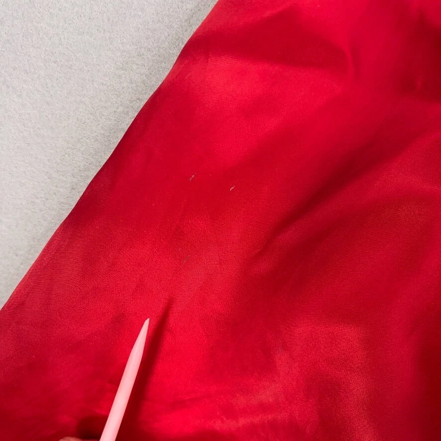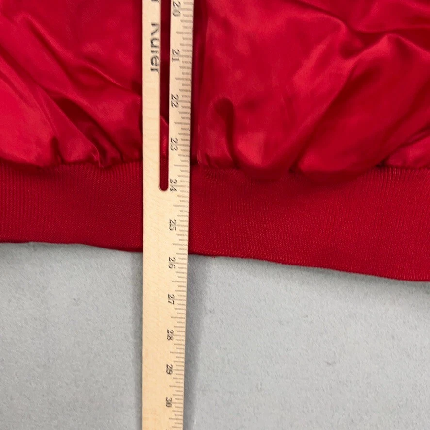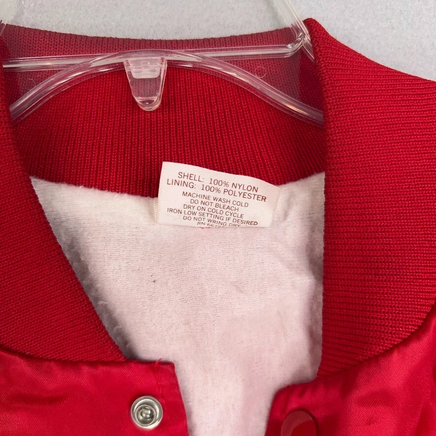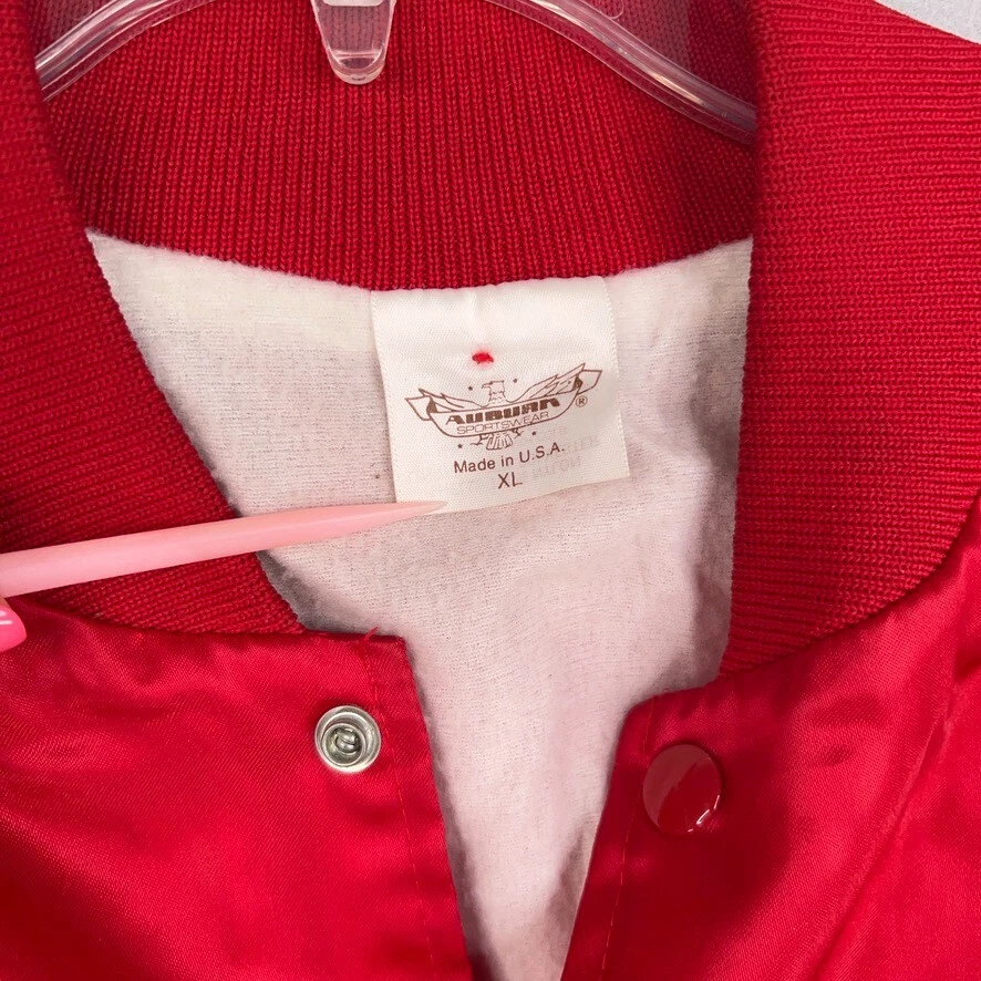 Features: Lightweight, Lined, Pockets Pattern: Solid Size: XL Lining Material: Polyester Country/Region of Manufacture: United States Occasion: Casual Accents: Logo Fabric Type: Satin Vintage: Yes Department: Men Color: Red Performance/Activity: Racing Outer Shell Material: Nylon Style: Bomber Jacket Size Type: Regular Theme: 80s, 90s, Beer, Cars, Classic, Dad, Hipster, Retro Brand: Auburn Type: Jacket Closure: Snap
